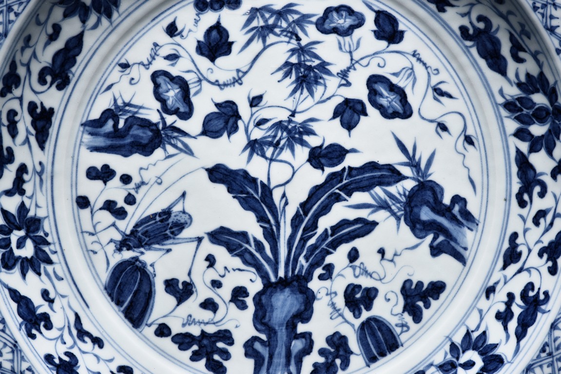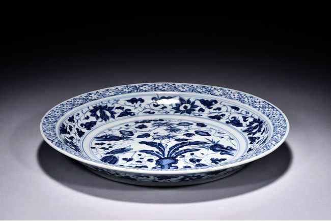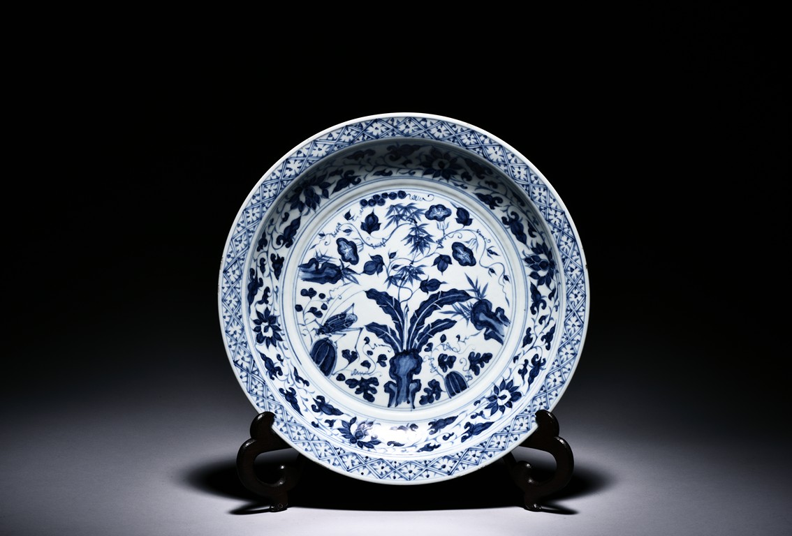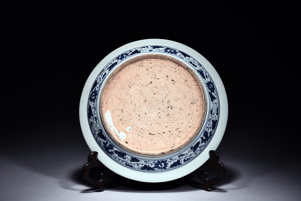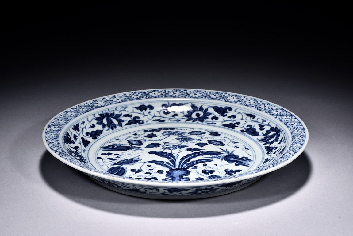 The dish is finely painted in deep cobalt blue to the center with a scene comprising banana leaves issuing from the rock base, with further decoration of bamboo and scrolling morning glory pattern above, encircled by floral scrolls and outermost further decorated with repeated rhombus motif. The bottom unglazed.