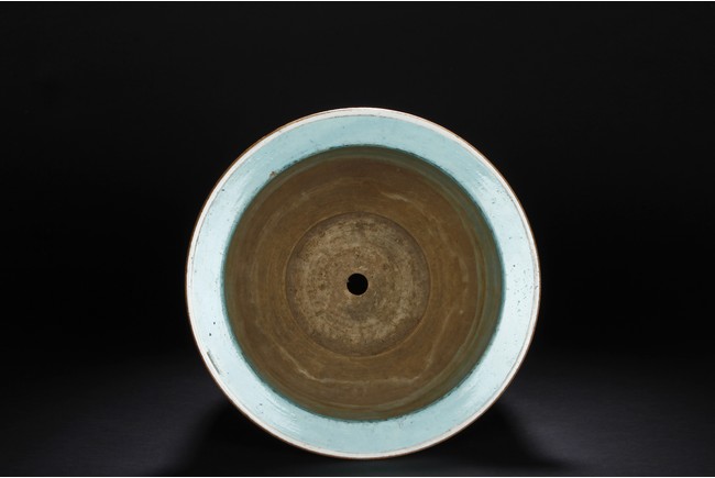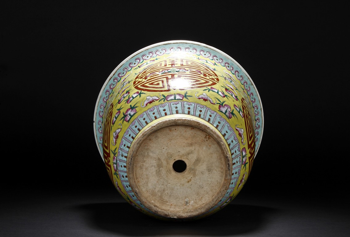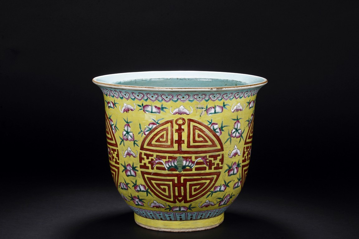 The jardiniere is enamelled with four roundels of red stylized 'Shou' characters with peaches and bats in between, all reserved on yellow ground. The neck and waist decorated with turquoise ruyi band and key-fret band. Qing Dynasty period.