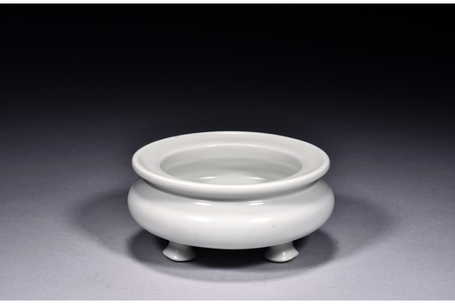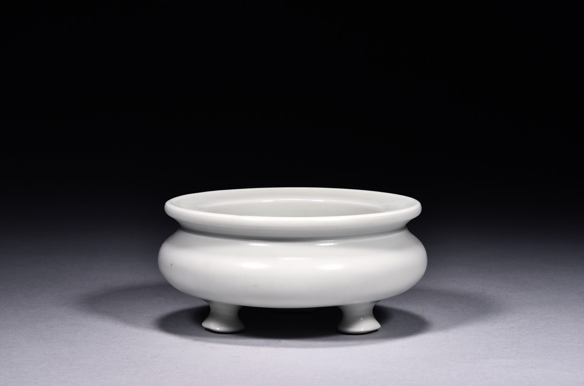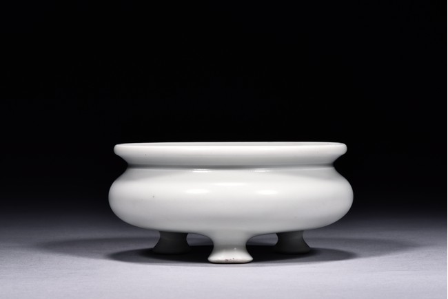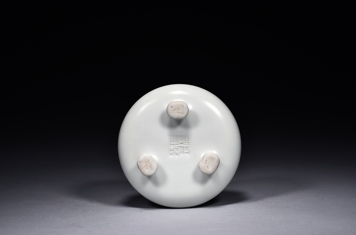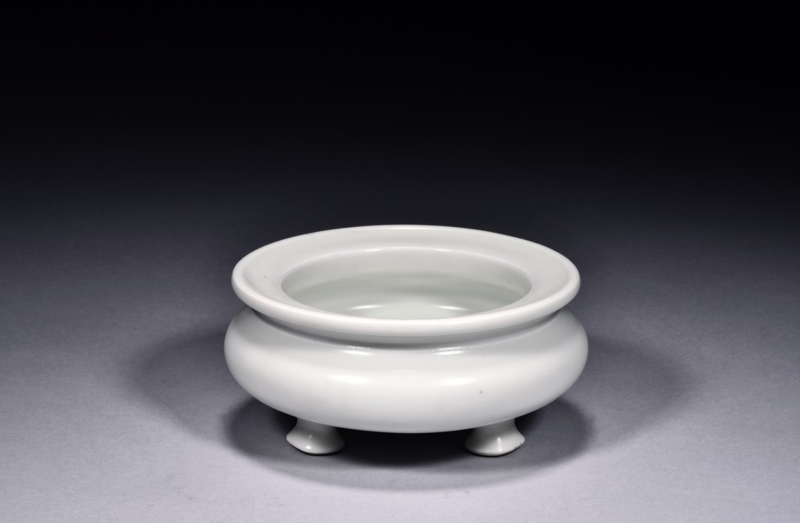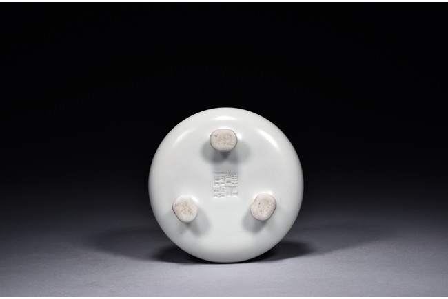 Of compressed globular form, the censer is raised on three legs with pad feet and rises to everted rim, overall covered with a thick milky-white glaze, the bottom bears four character 'YONGZHENG' mark. Qing Dynasty period.