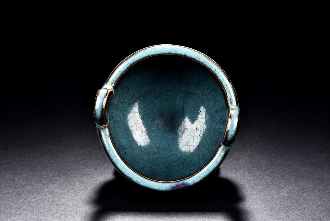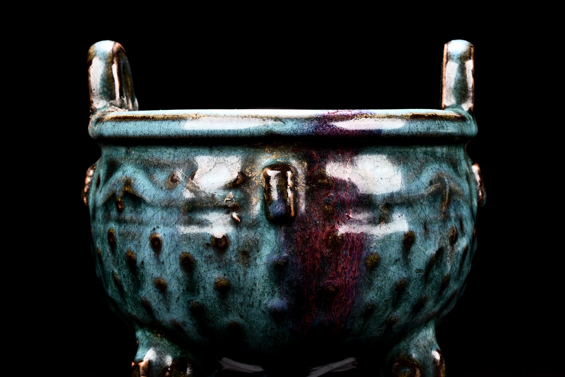 Raised on three long leg feet, the censer is covered with a thick glaze of turquoise green and lavender tone, supporting two upright arched handles. Qing Dynasty period