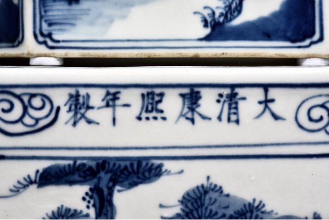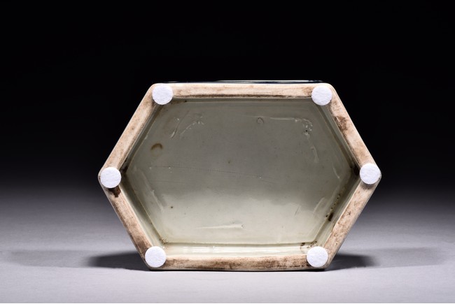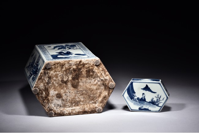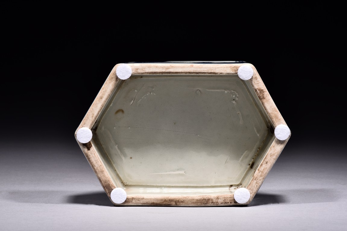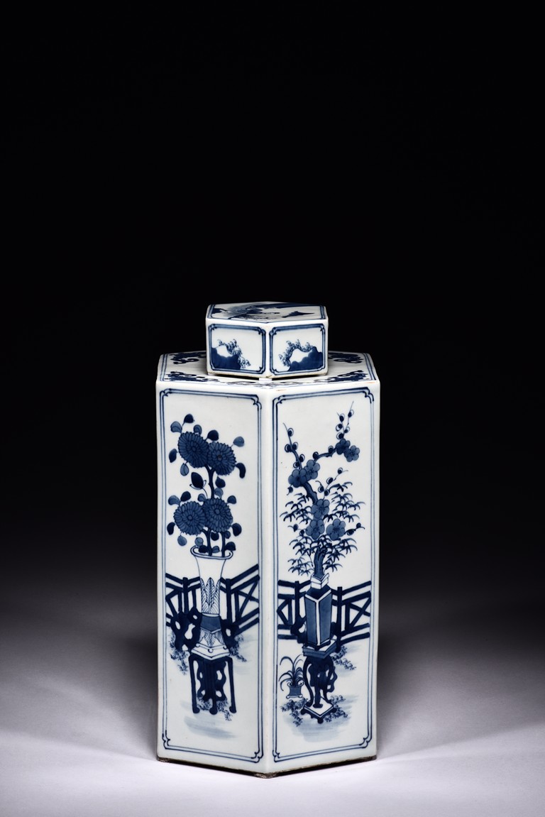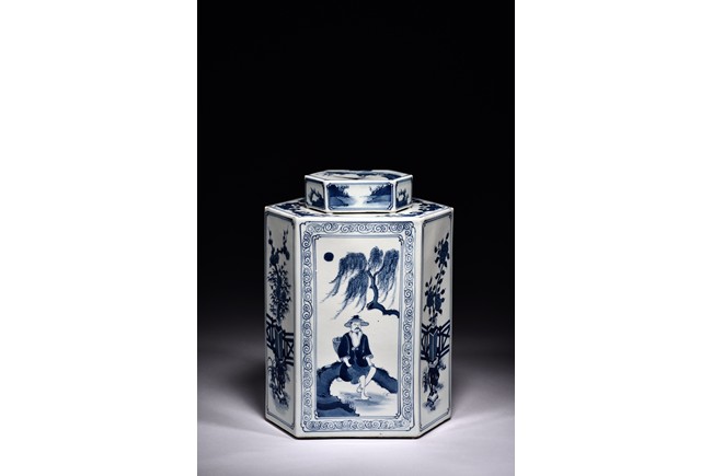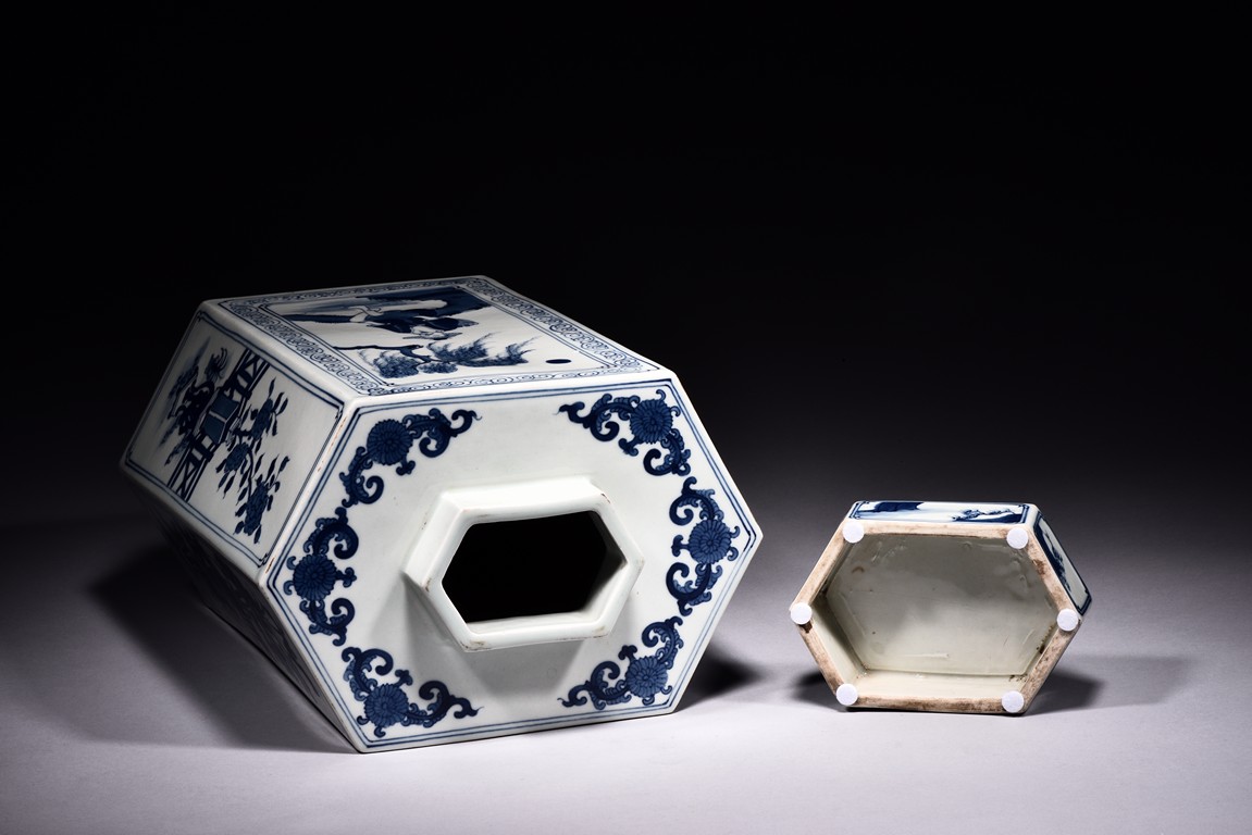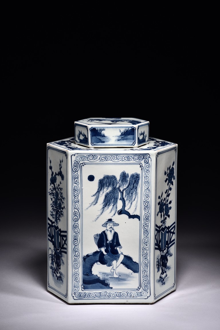 Modelled in hexagonal form, the vase is finely painted with figures and flowers on each rectangular panel, including one panel with a fisherman resting on an arched branch above river with willow tree and moon in background, the reverse panel with a scholar wearing long robe reading a hand scroll under pine, with six character 'QIANLONG' mark above the scene, and the four side panels decorated with various flower containing vases, the cover further decorated with a figural scene. Qing Dynasty period.