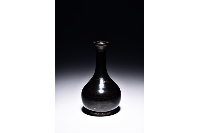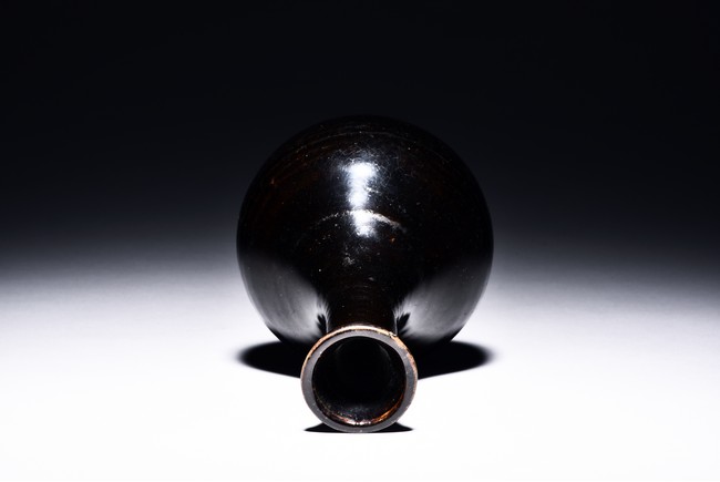 Of pear-shape, the vase raises from circular foot ring, the body is of compressed globular form and rises to long neck, the exterior is overall glazed in impressive brownish black glaze. The base is unglazed. Song Dynasty period.