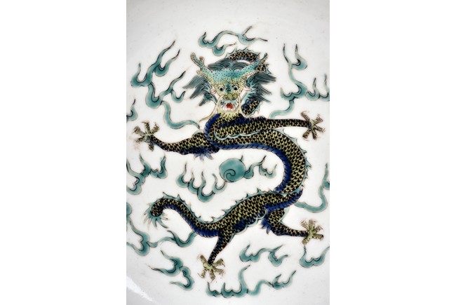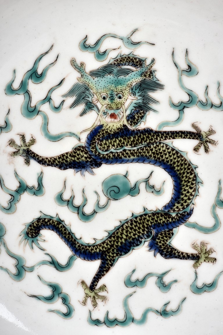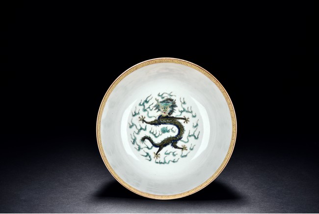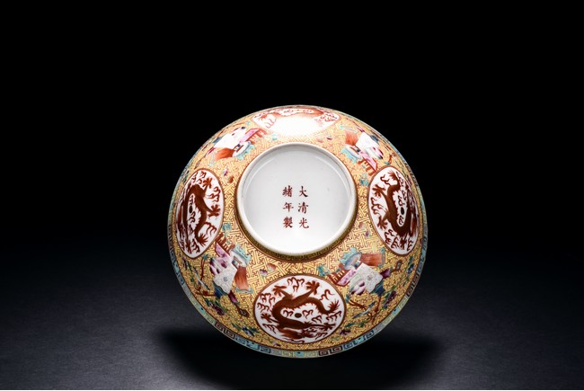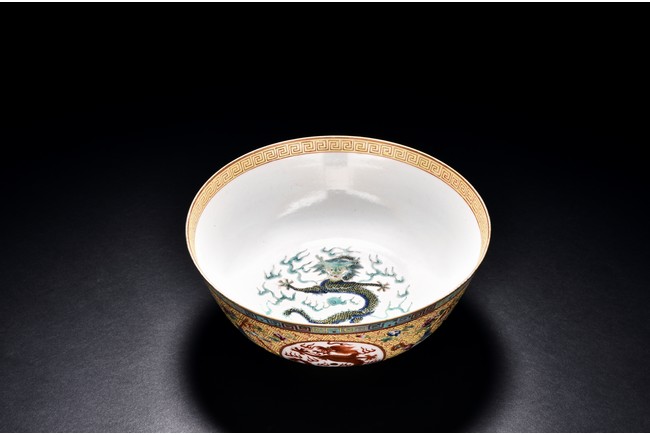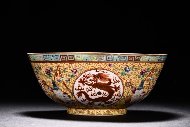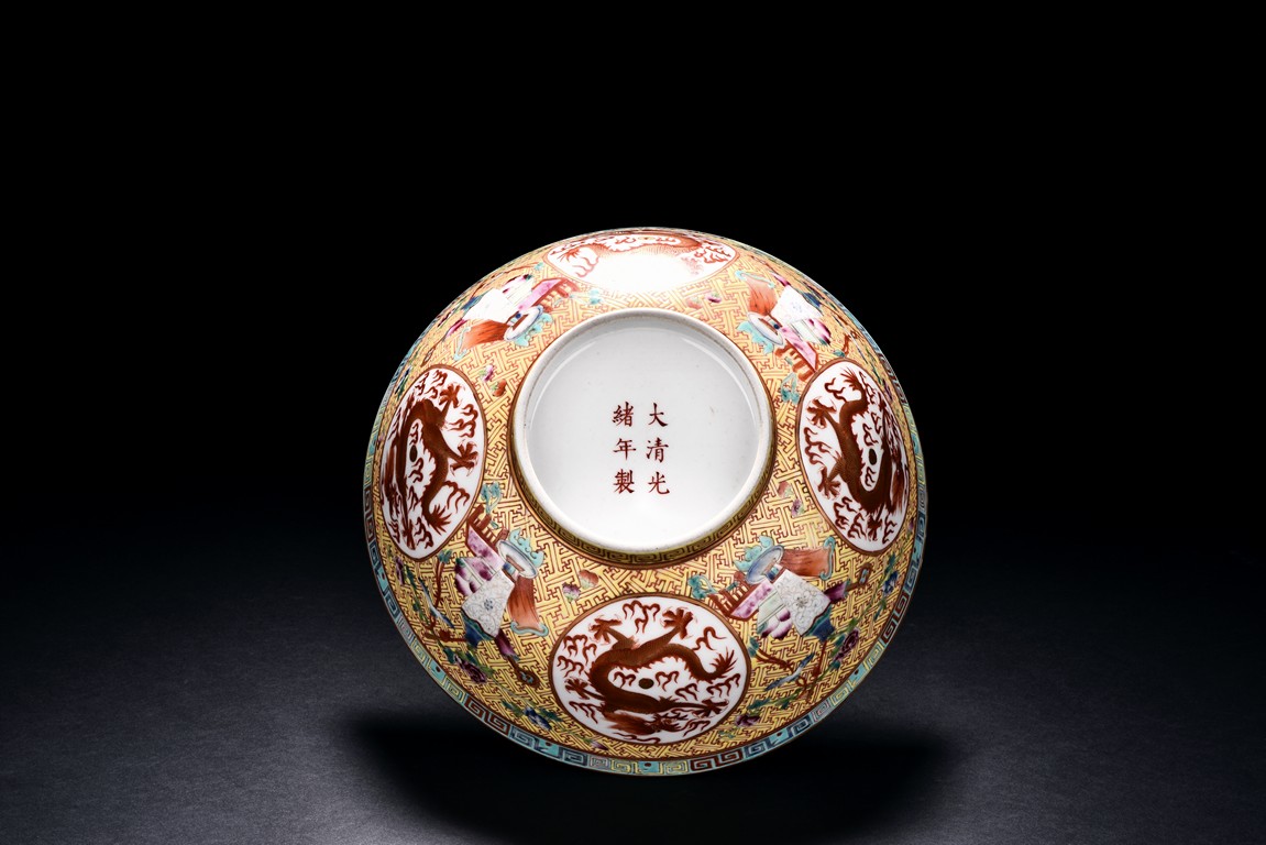 Potted with deep sides and rising to a wide rim, the bowl is enamelled with alternating medallions enclosing dragon in pursuit of flaming pearl and bogu pattern reserved on yellow ground diaper pattern, the rim decorated with a band of key-fret pattern, the interior further painted with a dragon in pursuit of flaming pearl. The base bears six character 'GUANGXU' reign mark. Late Qing Dynasty.