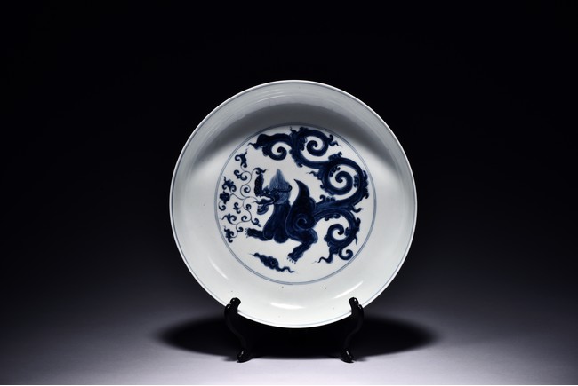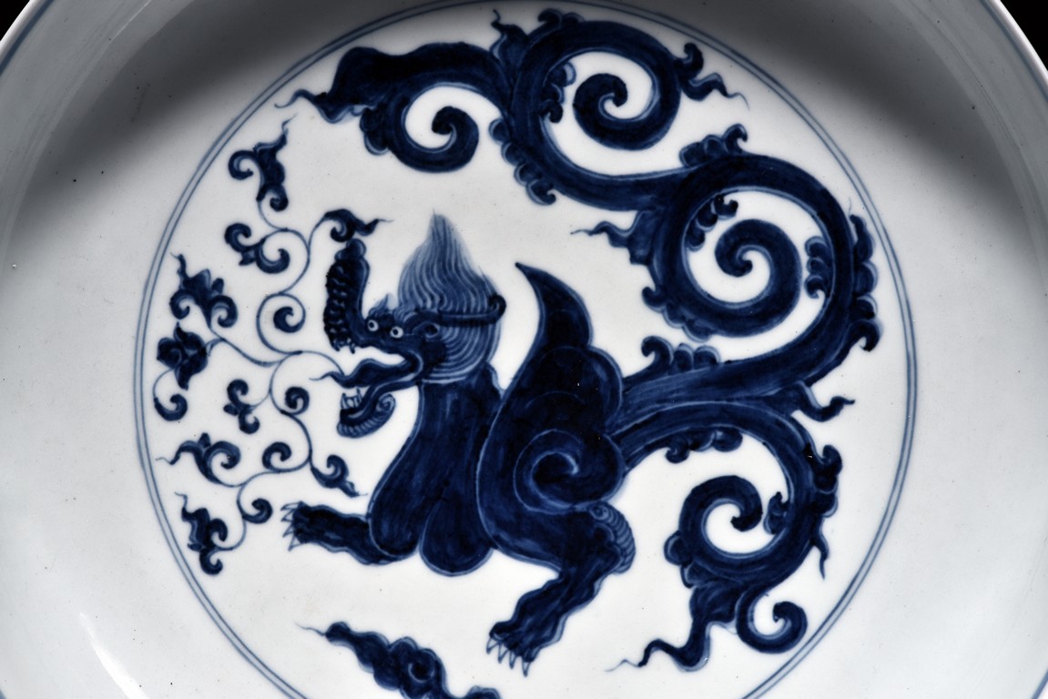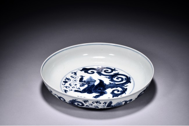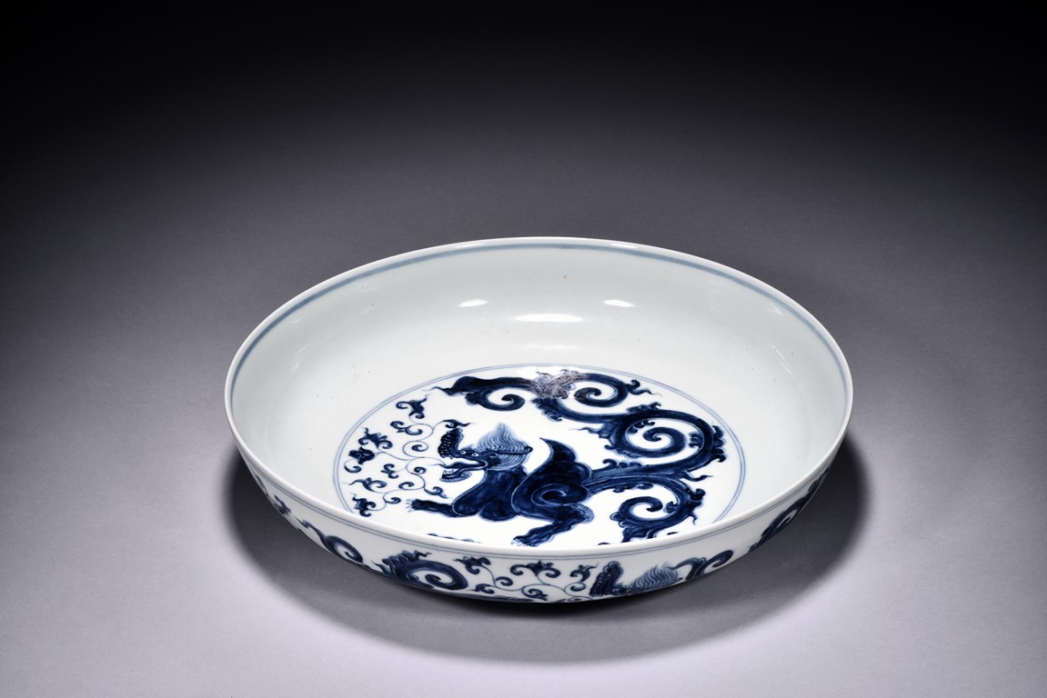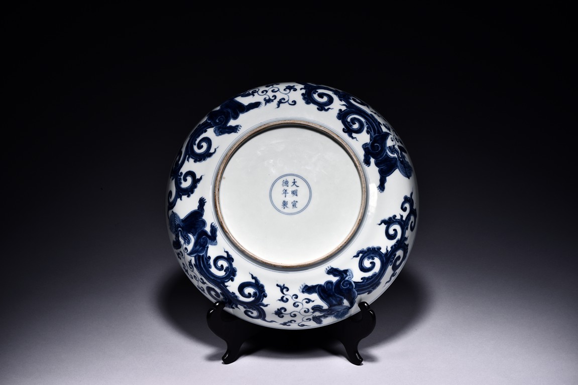 Rising from a circular foot ring and potted with shallow sides, the dish is painted to the interior center in cobalt blue to depict a powerful qilin with splitting tails and agape mouth, with foliate scroll issuing from mouth, all enclosed by double circle borders. The exterior is further decorated with a continuous scene of four similar qilin above the foot. The base bears a six character 'XUANDE' mark within double circle borders.Qing Dynasty period.