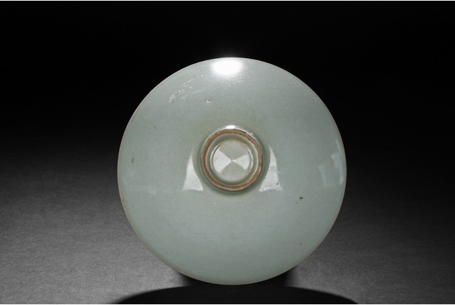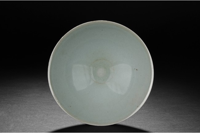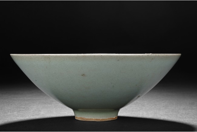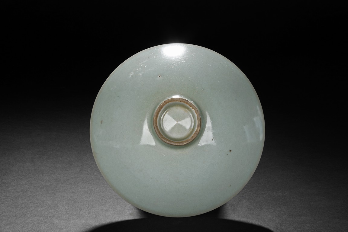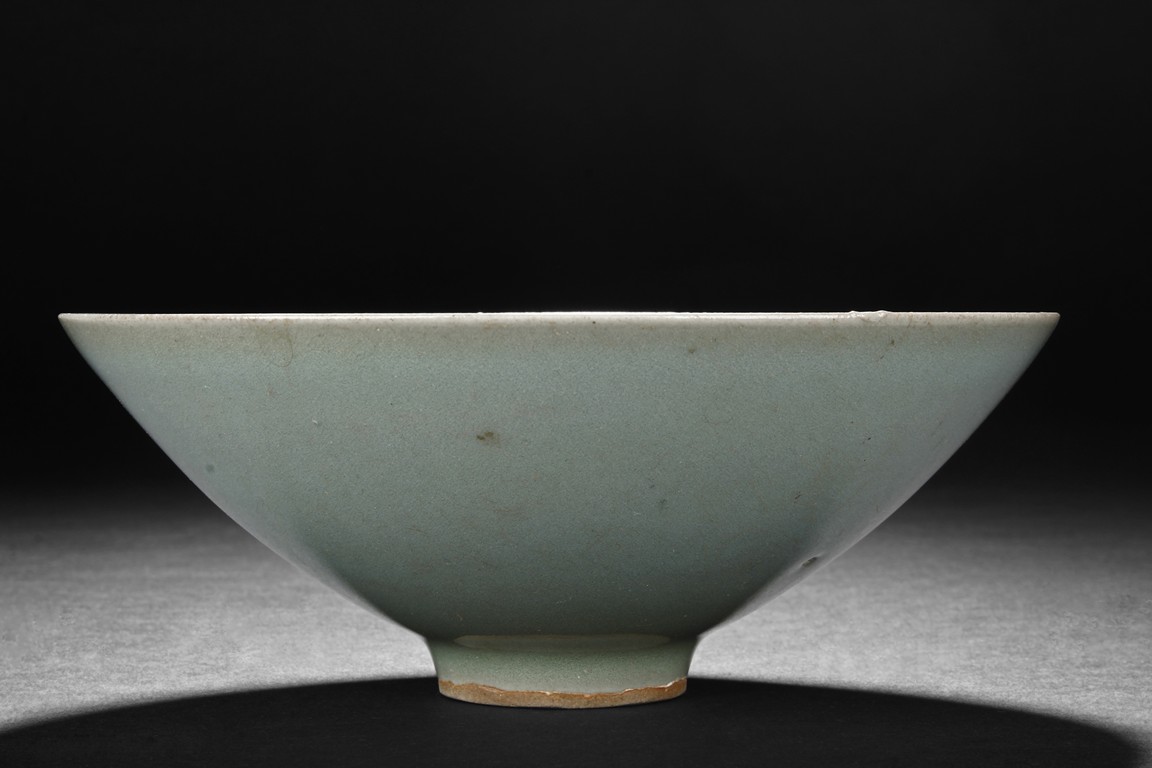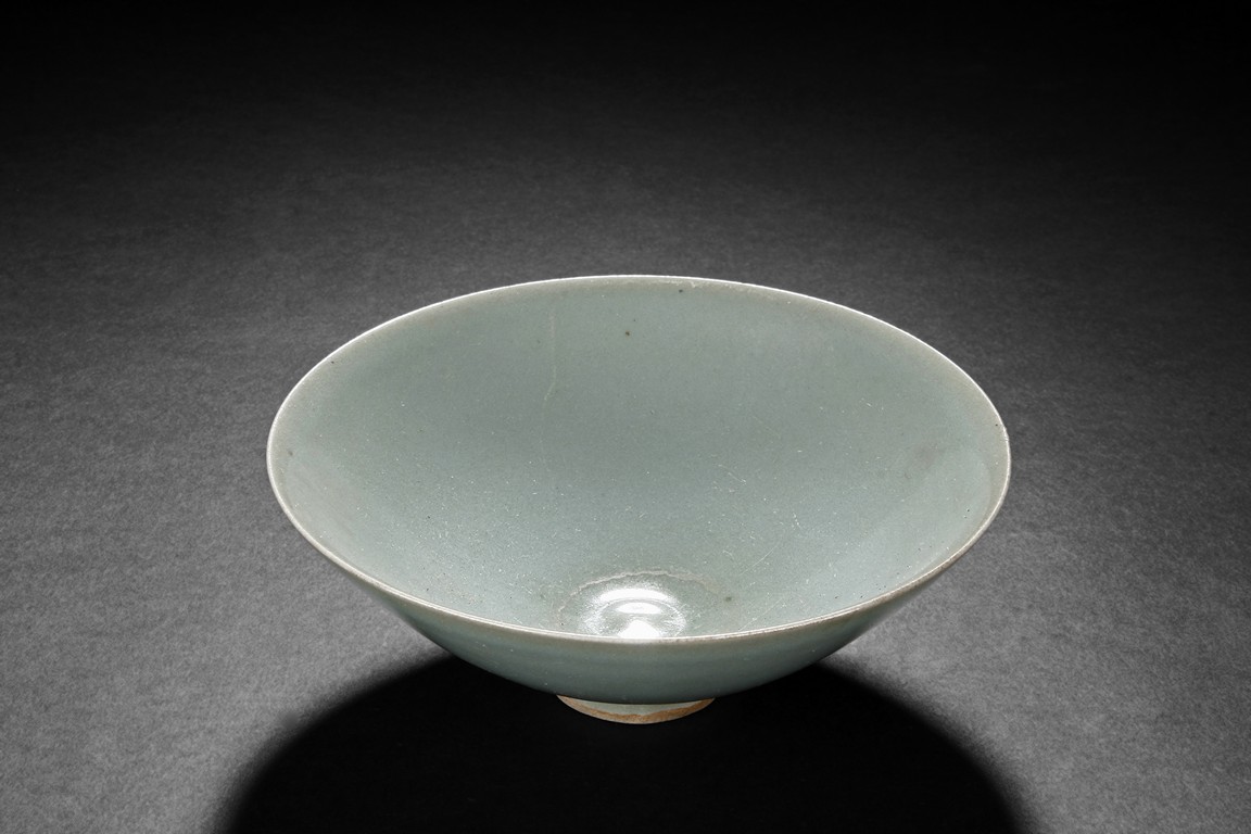 The bowl has widely flared sides that rise from the small foot ring, and is covered overall with a luminous glaze of soft blue-green tone. Southern Song Dynasty or later.