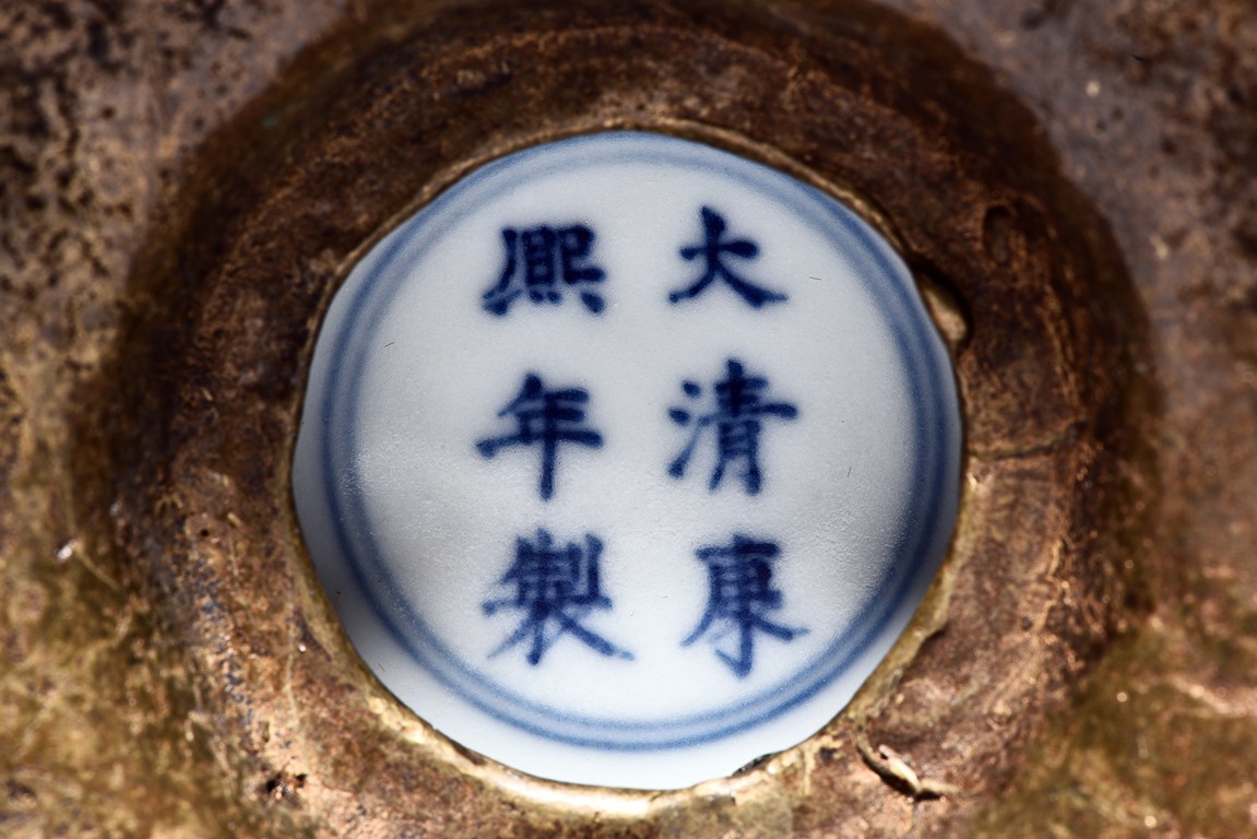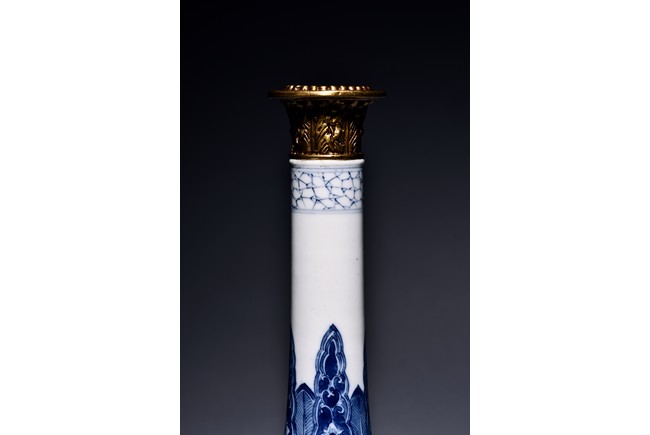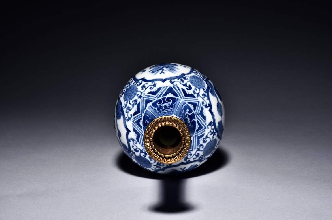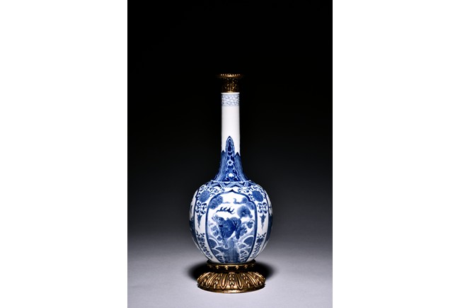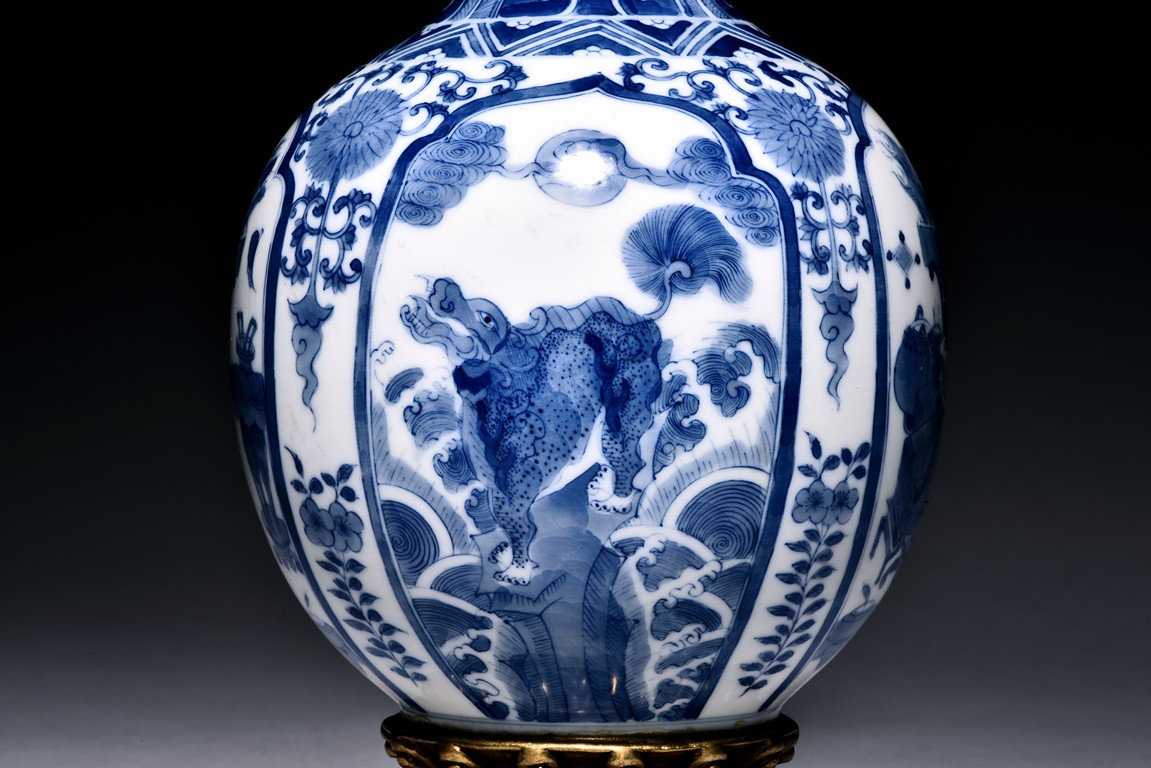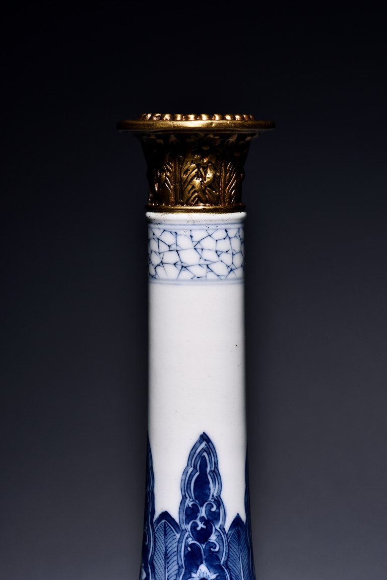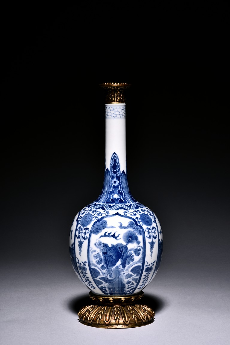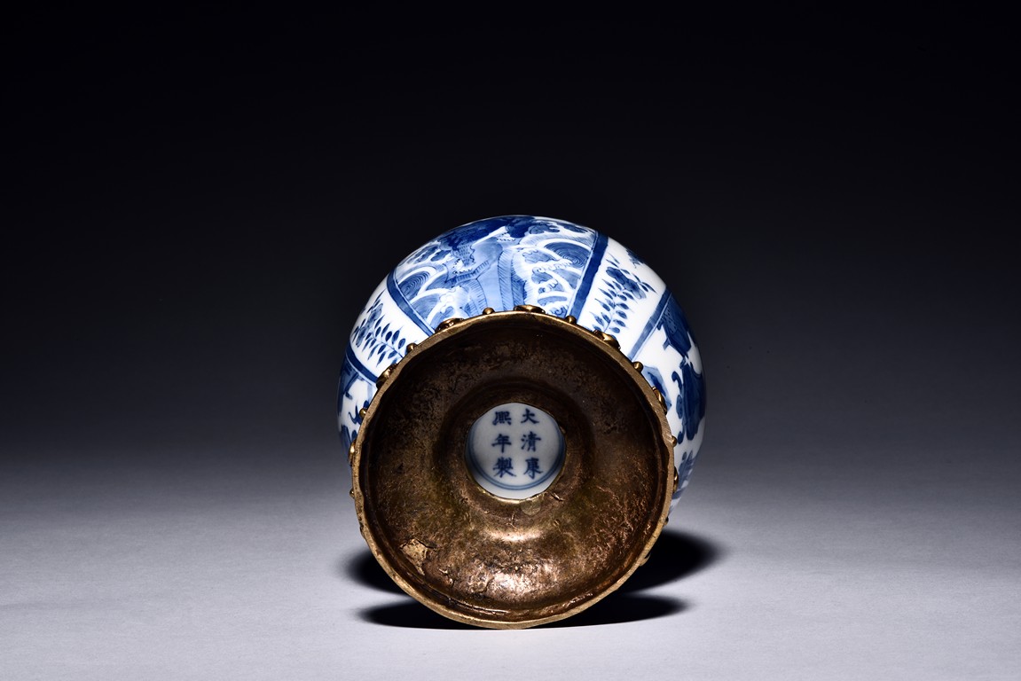 Mounted with a gilt-bronze stand, the vase elegantly potted with slender neck rising from pear-shaped body, finely painted with four alternating panels depicting the scene of flowers and scholar's objects, and the scene of mythical beast qilin standing amidst cliff and scudding waves below sun and clouds. The neck encircled with a band of flower lappets. The mouth rim further mounted in gilt-bronze. The base bears six character 'KANGXI' mark. Qing Dynasty Kangxi period.