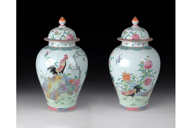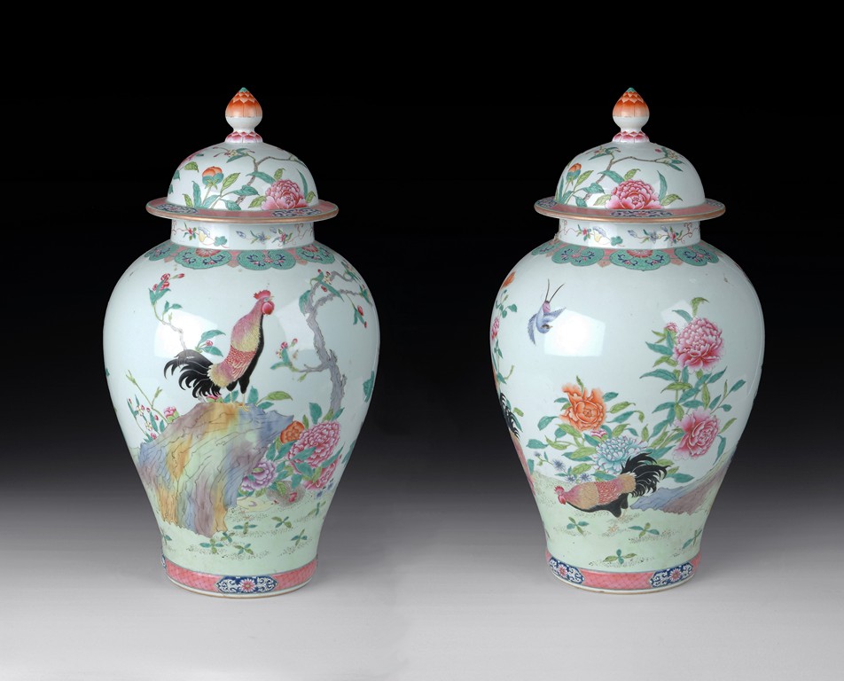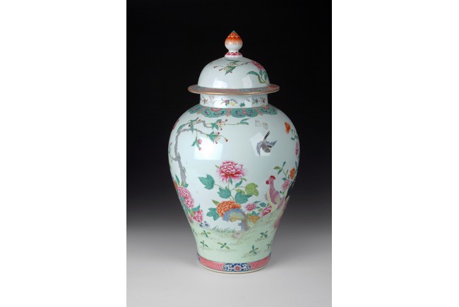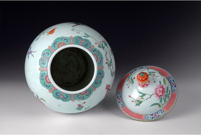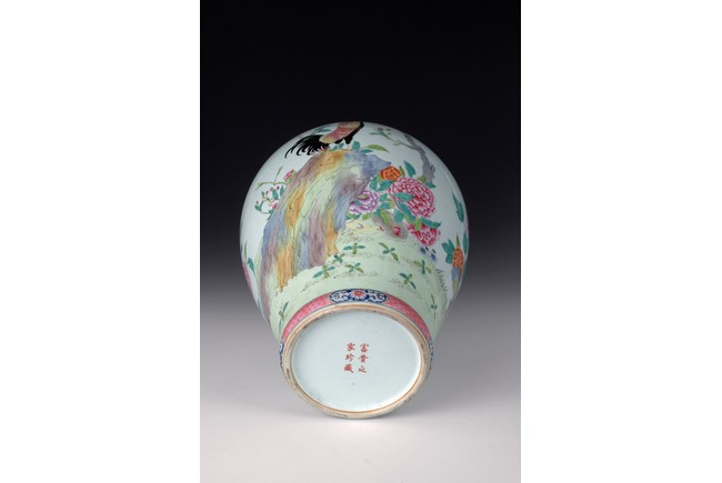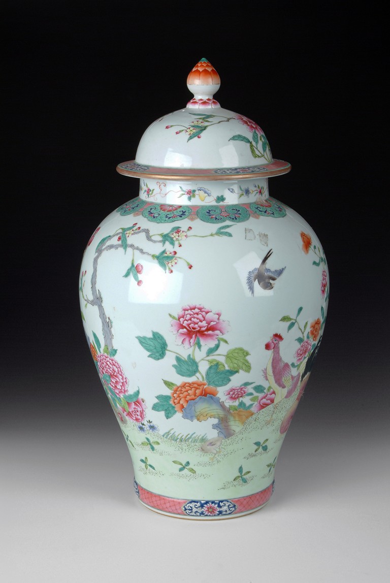 Of tapering ovoid form, the body depicts chickens, birds, flowers, and trees in a wild setting, with different scrolling patterns on bottom, neck, and cover. The cover depicts blooming peony flowers, with the finial similar to a flower bulb. Six characters mark on the bottom. Late Qing/Early Republic period.