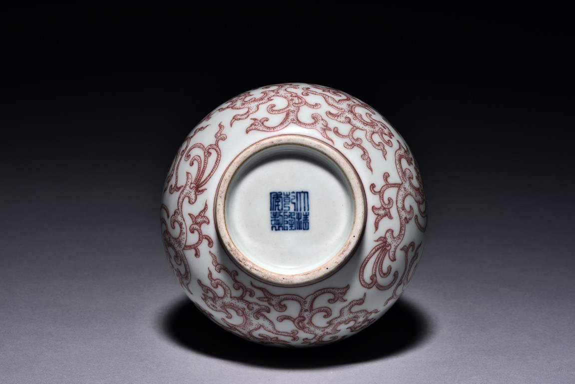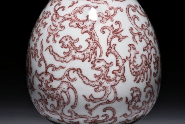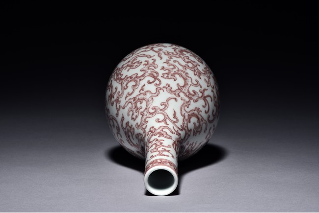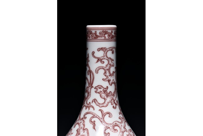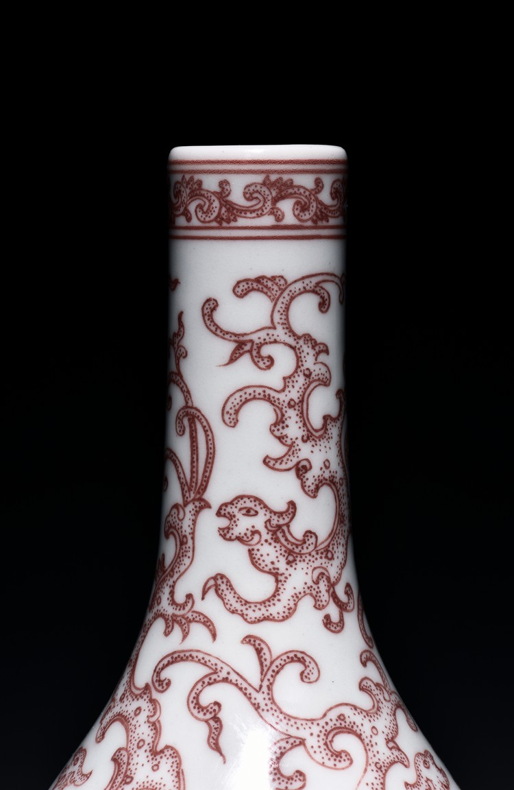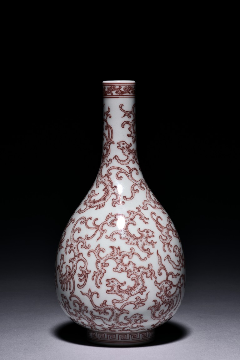 Of pear-shape and rising to a long and straight neck, the vase is overall under glazed in red with repeated motifs of kui dragon, the mouth rim is painted with a band of floral scrolls encircled by two double lines. The bottom bears six character 'QIANLONG' mark. Qing Dynasty period.