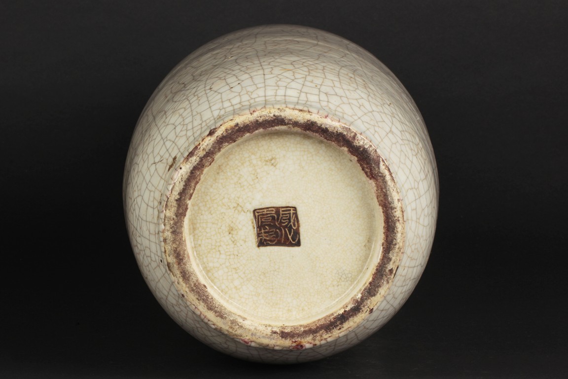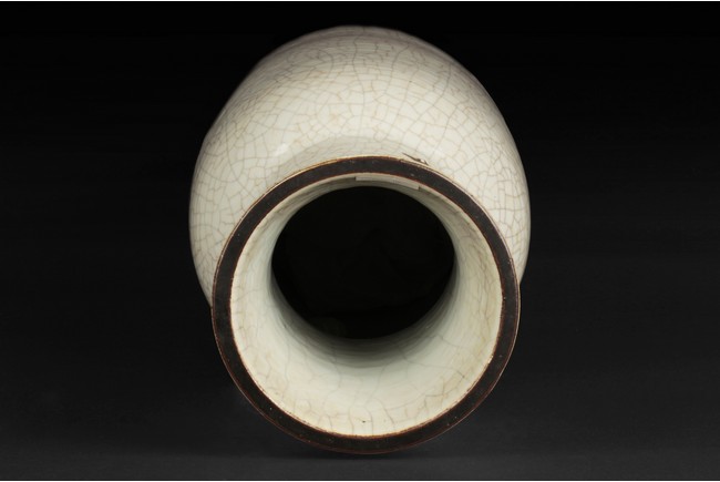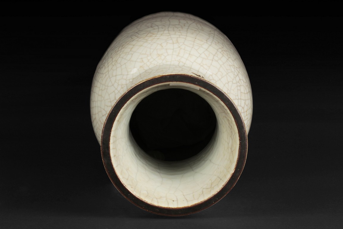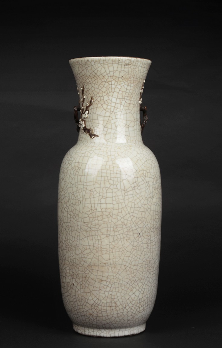 Of cylindrical form, the vase is raised on a straight foot and molded with a pair of prunus flower branch form handles applied to the tall neck, covered overall with an opaque pale grey glaze suffused with an irregular pattern of dark grey crackle, and bottom bears four character 'CHENGHUA' mark. Qing Dynasty period.