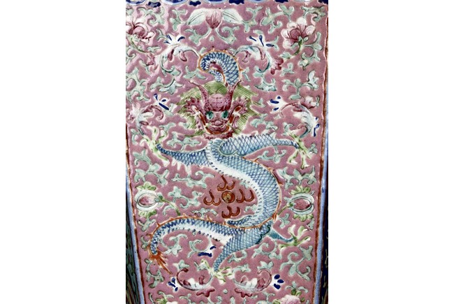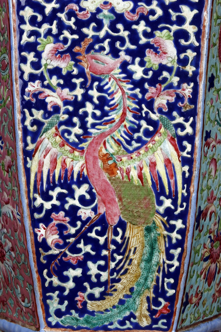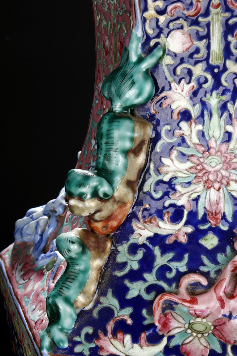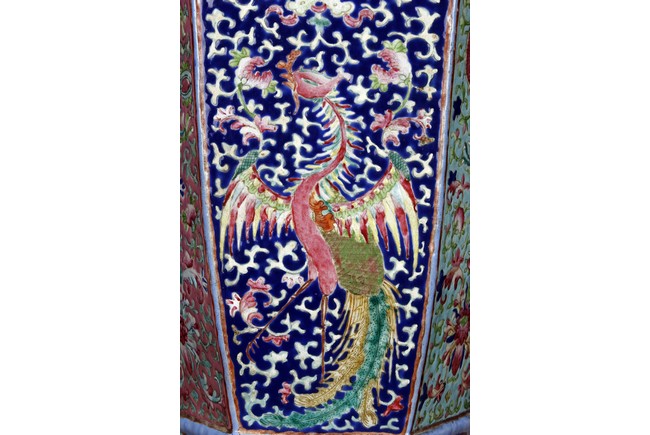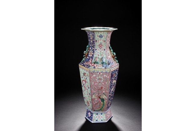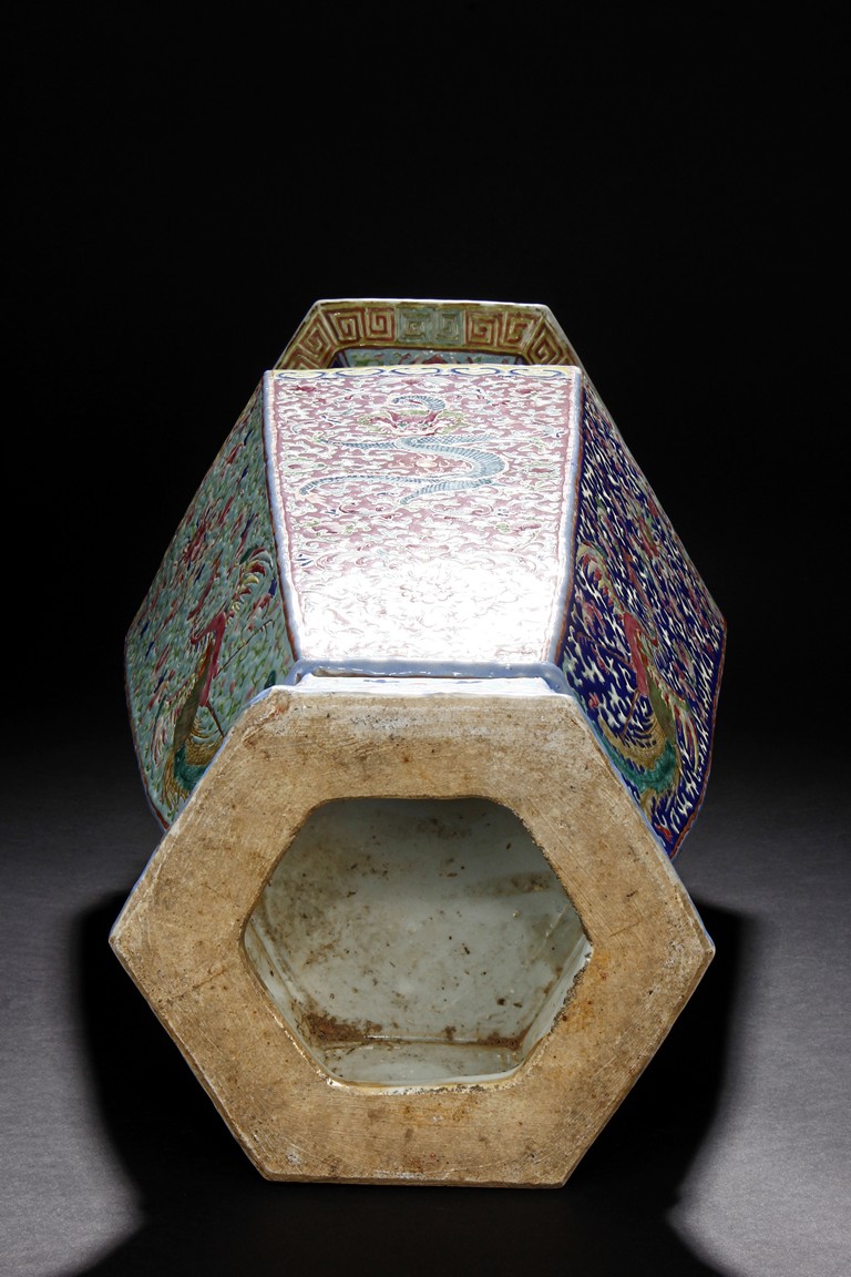 The body is of hexagonal shape with six panels, each of alternating blue, turquoise, and red ground with dragon, phoenix motif. The neck carved with chilong mythical beasts to exterior. The interior of neck is enamelled with three auspicious bats reserved on turquoise ground. Late Qing Dynasty period.