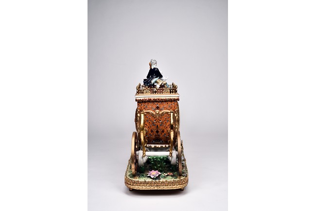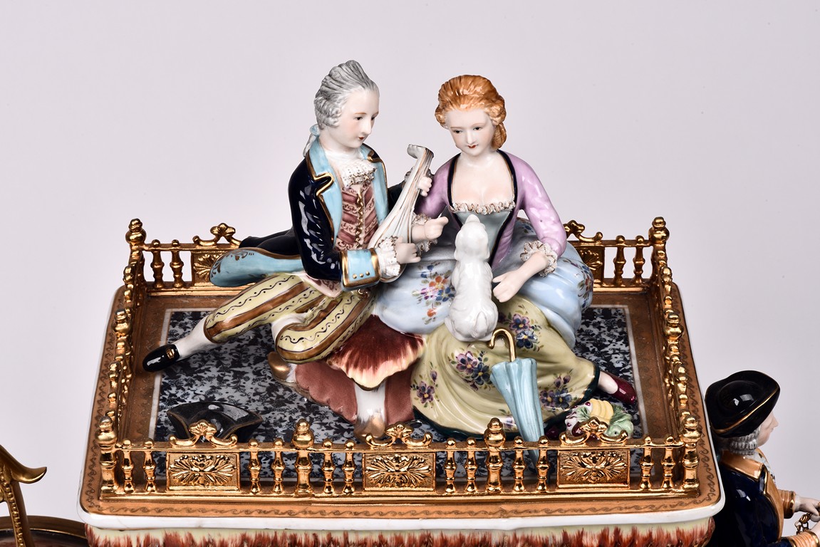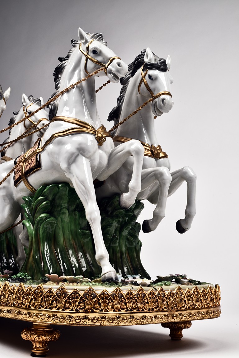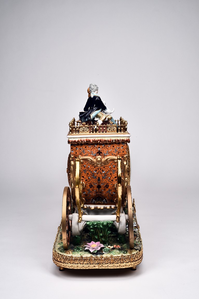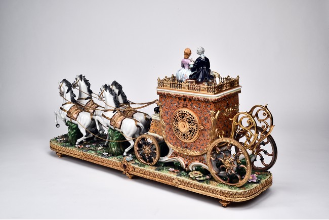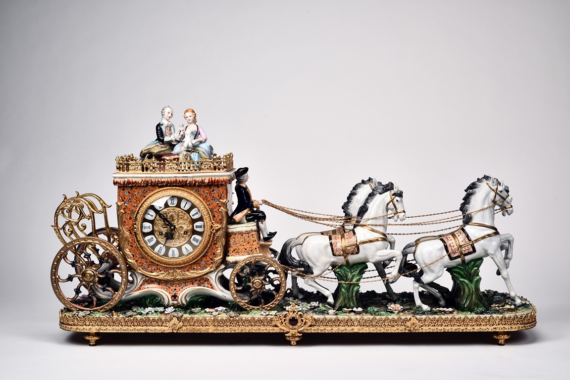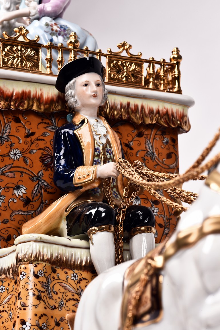 Magnificently made, the clock is modelled in the form of a coach, with two passengers, a young lady and a gentleman, and a male driver, drawn by four horses, with ormolu gilt-decorated railing, wheels, and ropes. The clock with Roman numerals, the carriage with exquisitely painted floral scrolls, the base with finely moulded porcelain flowers in various glazes.