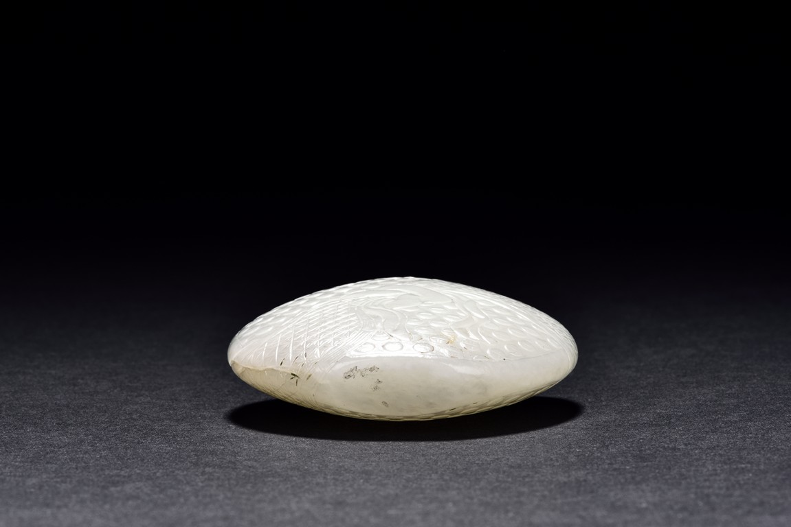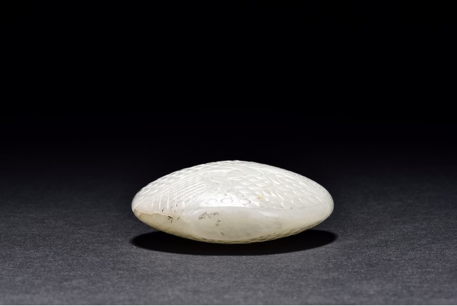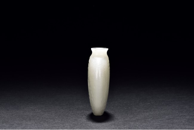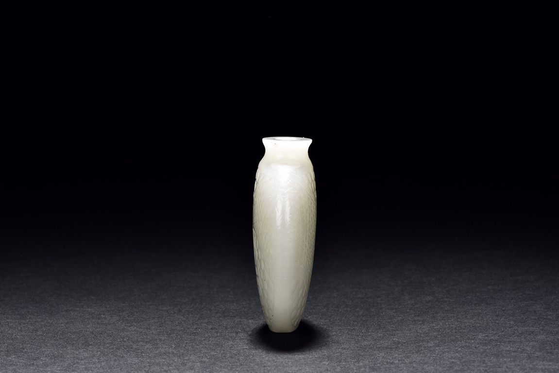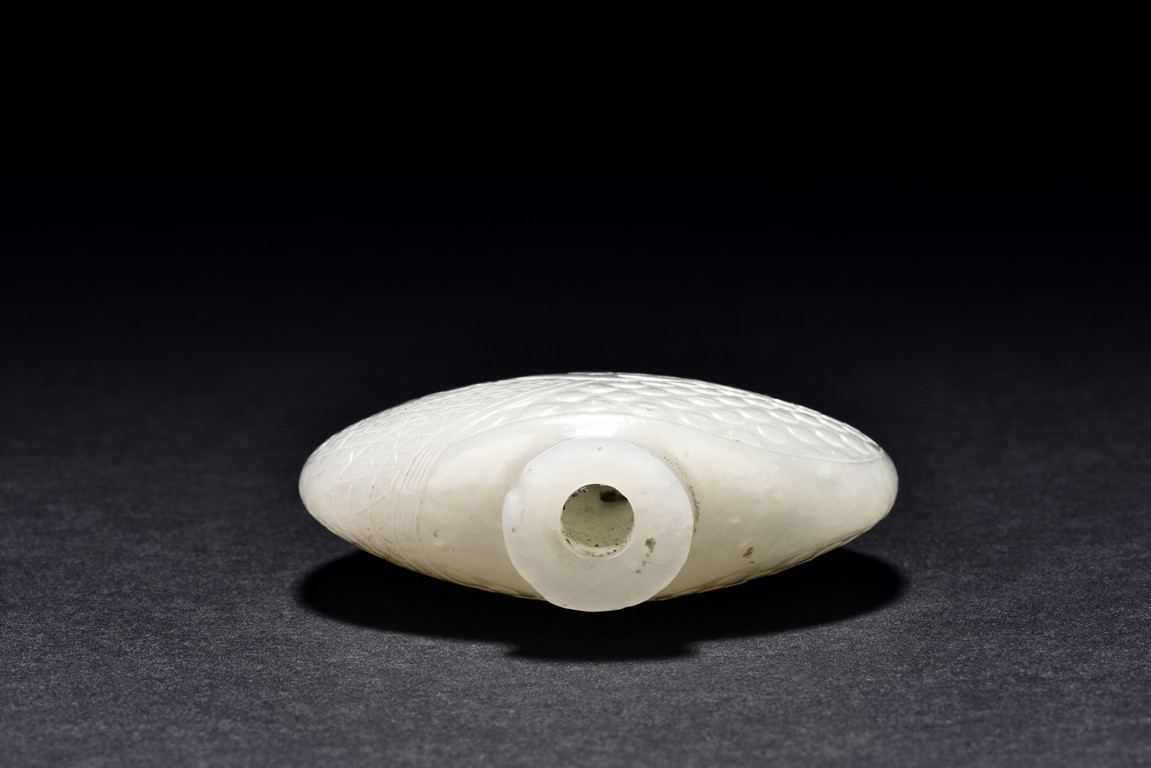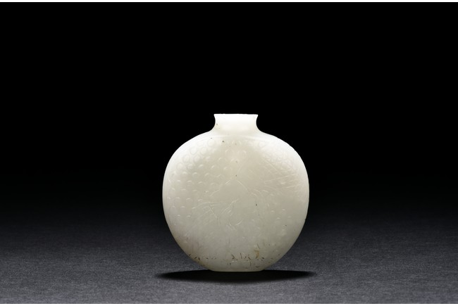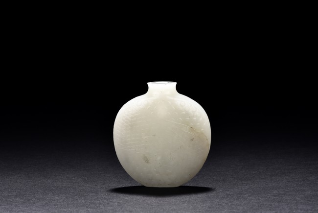 Of flattened rounded form, the white jade body is decorated with a simulated brocade sash wrapped around the body and reserved on circular dots ground. The stone is of even white tone. Missing stopper. Qing Dynasty period.