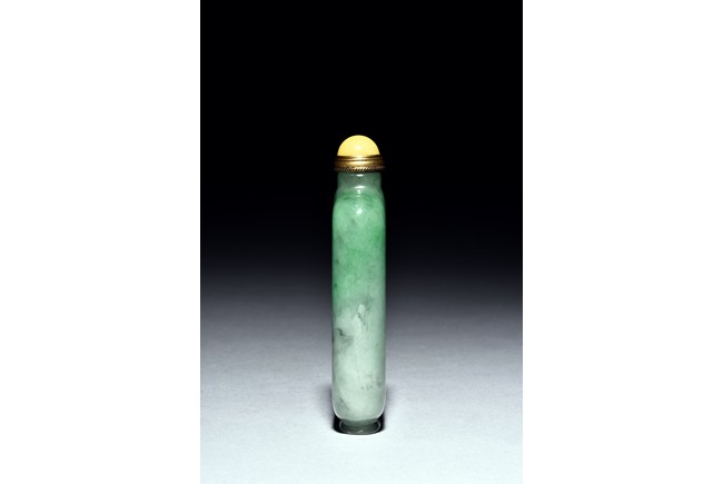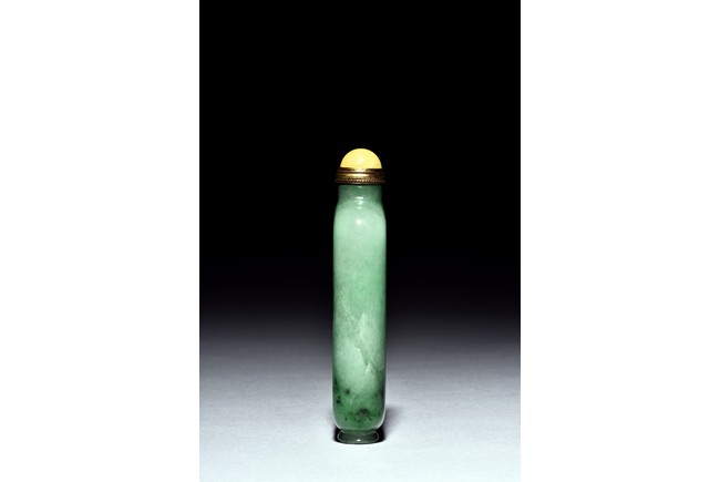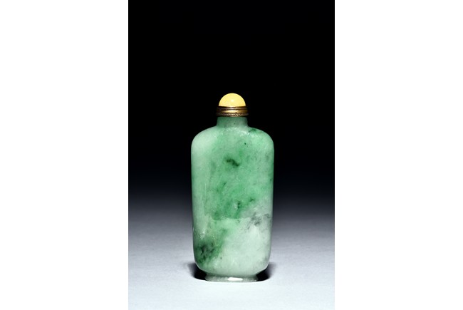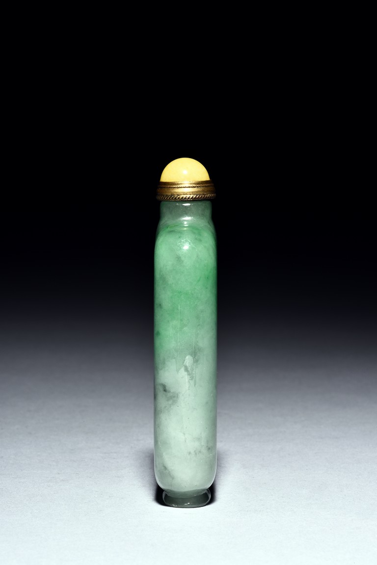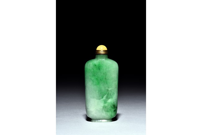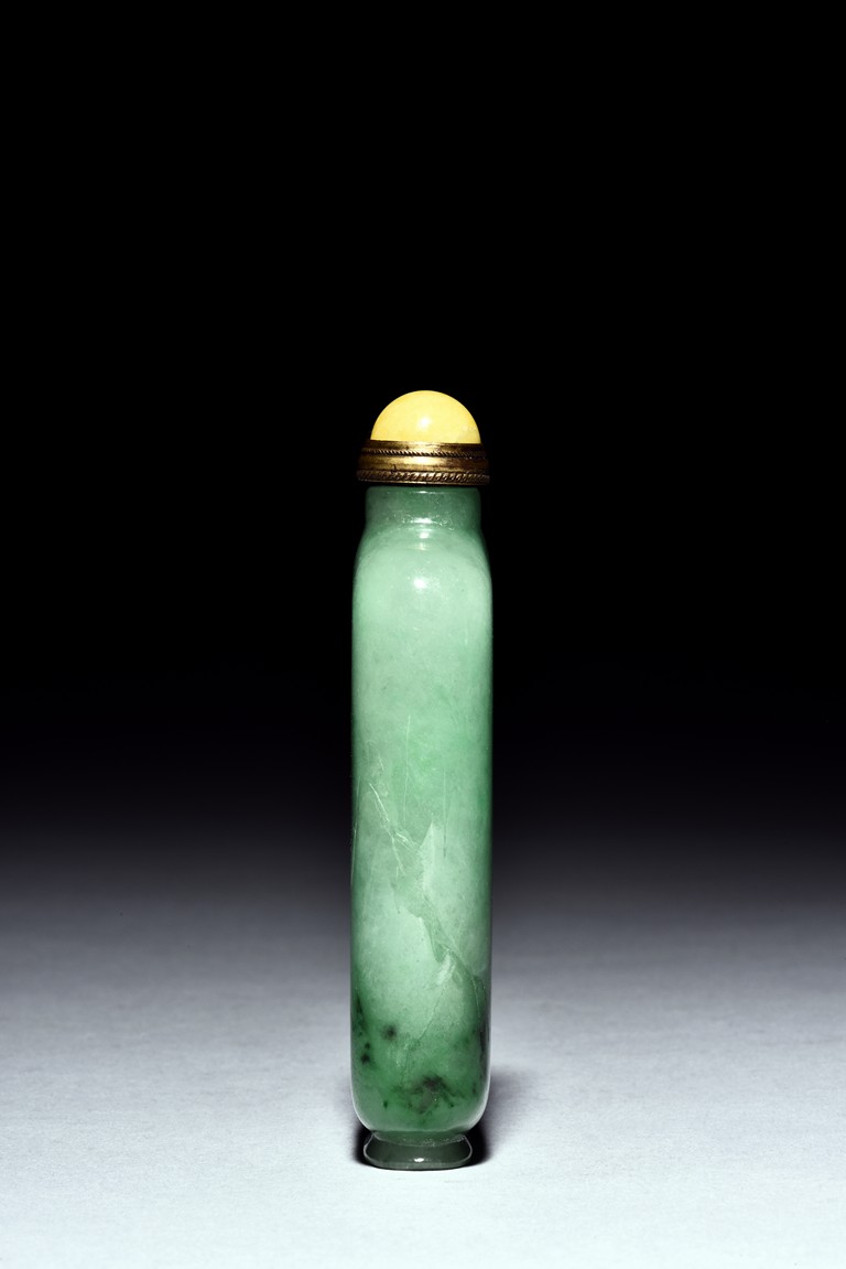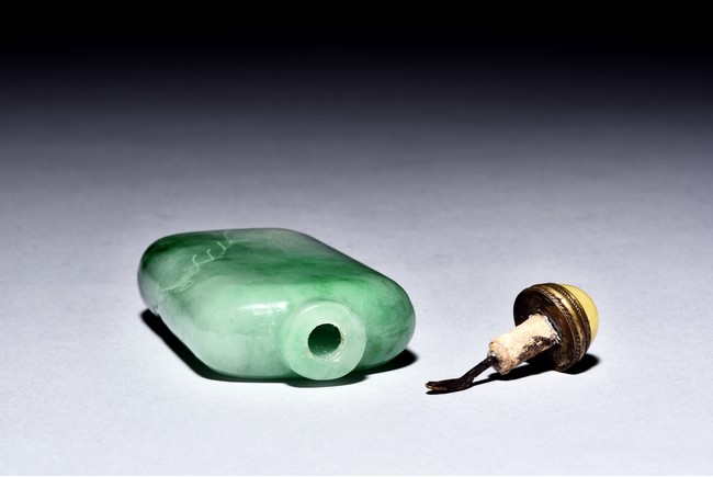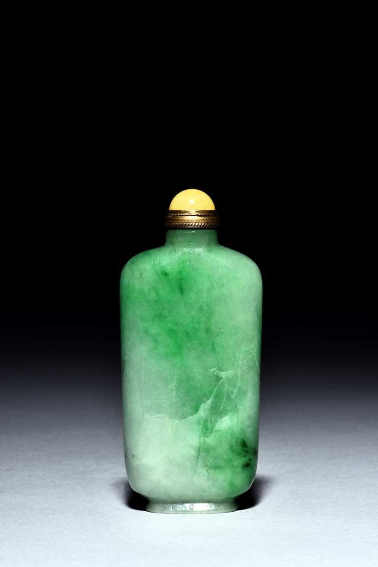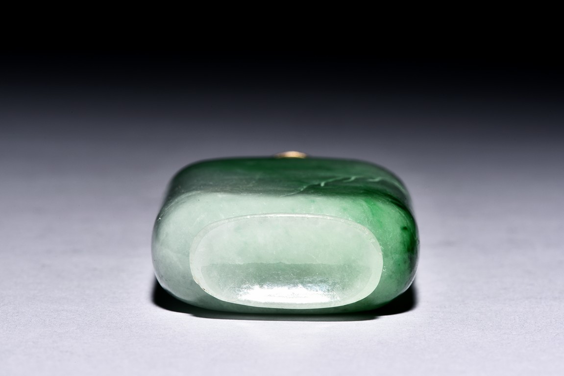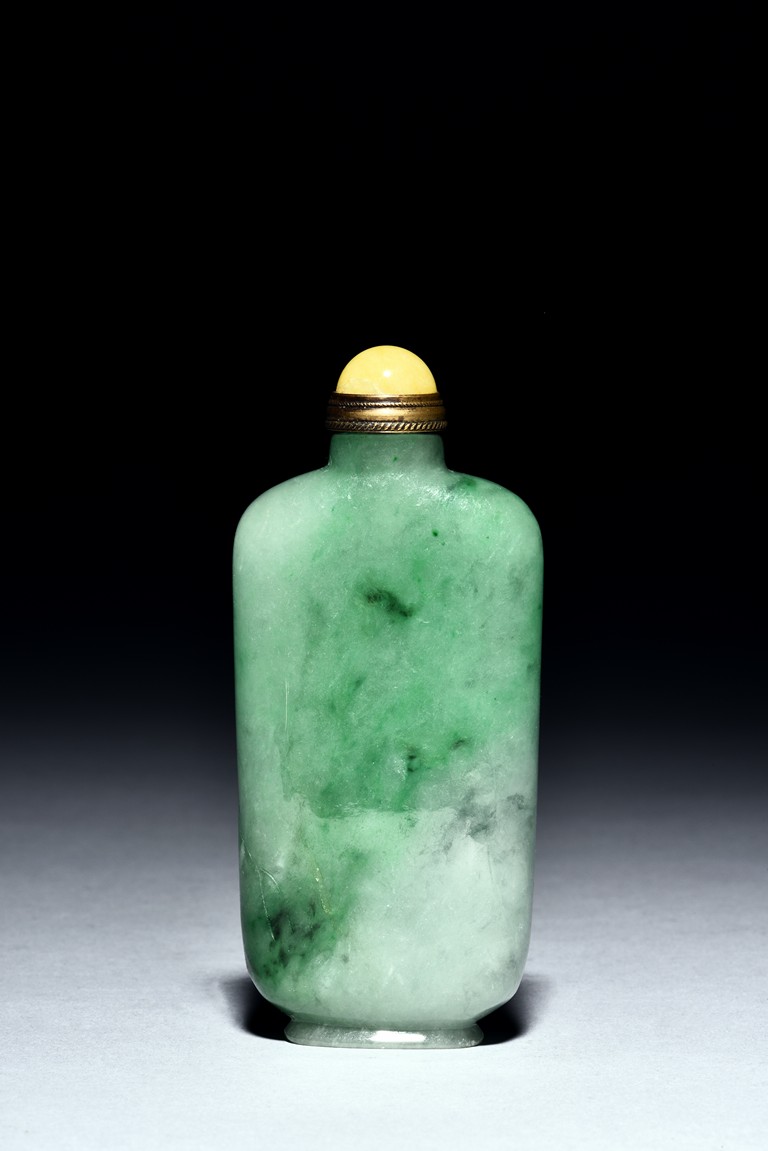 Of flattened rounded rectangular form, the snuff bottle is well-hollowed and suffused with greenish white to apple green. Qing Dynasty period.