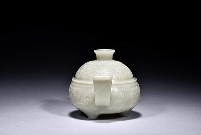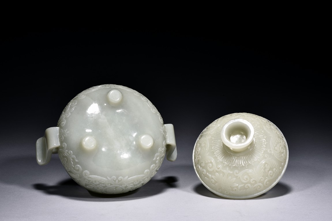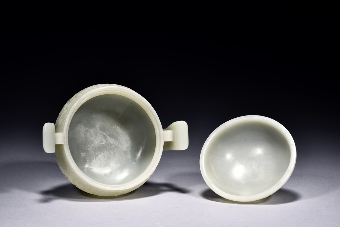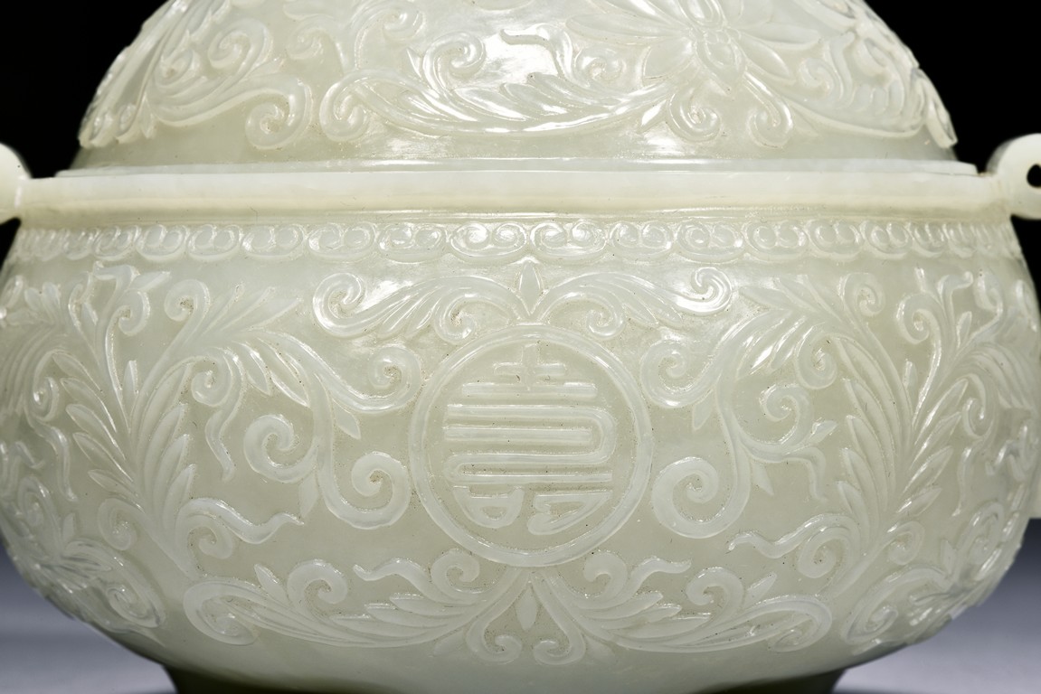 Of compressed globular form, the censer is raised on three short supports, the body delicately carved in low relief with a stylized shou character in a round medallion amidst scrolling foliate pattern on both sides, with a band of lingzhi around the rim, flanked by two upswept handles. The domed cover further decorated with similar pattern and surmounted with a circular finial. The stone is of semi-translucent even white tone. The zitan hardwood stand is of waisted form with reticulated decoration. Qing Dynasty period.