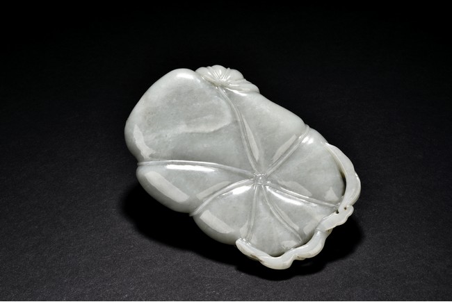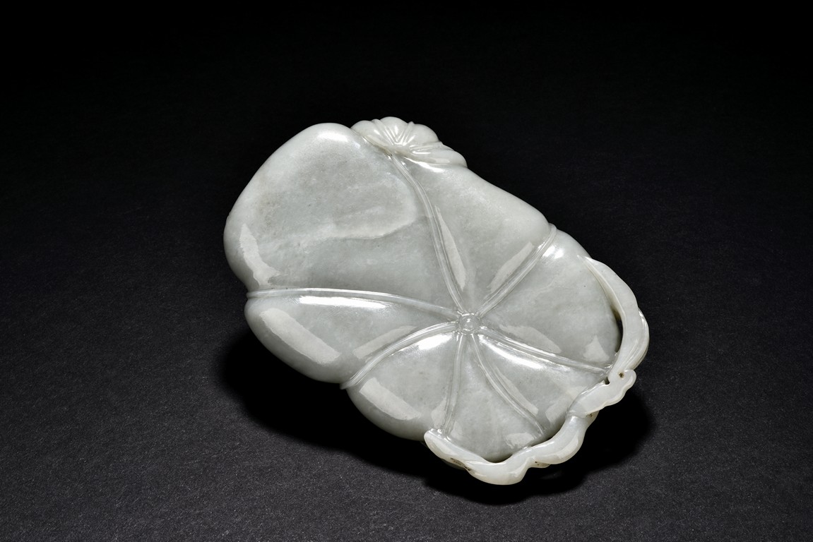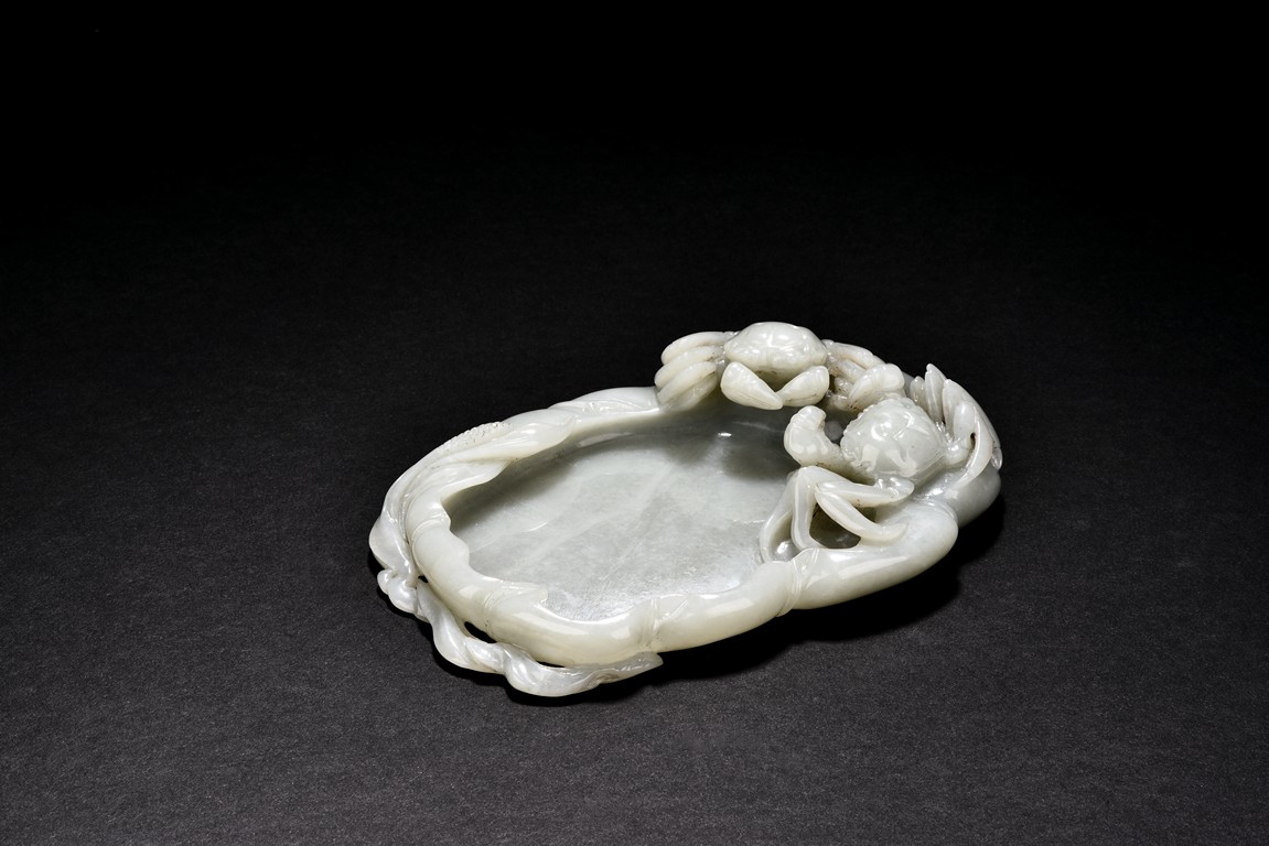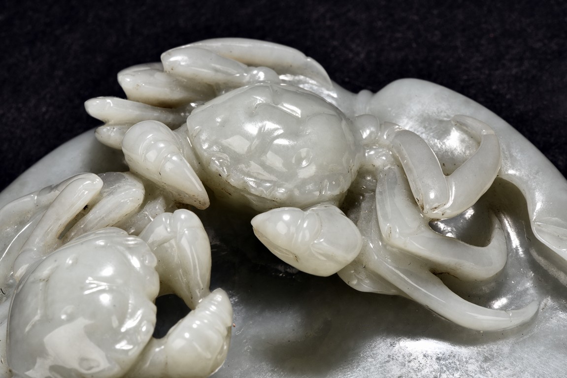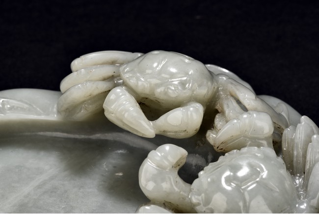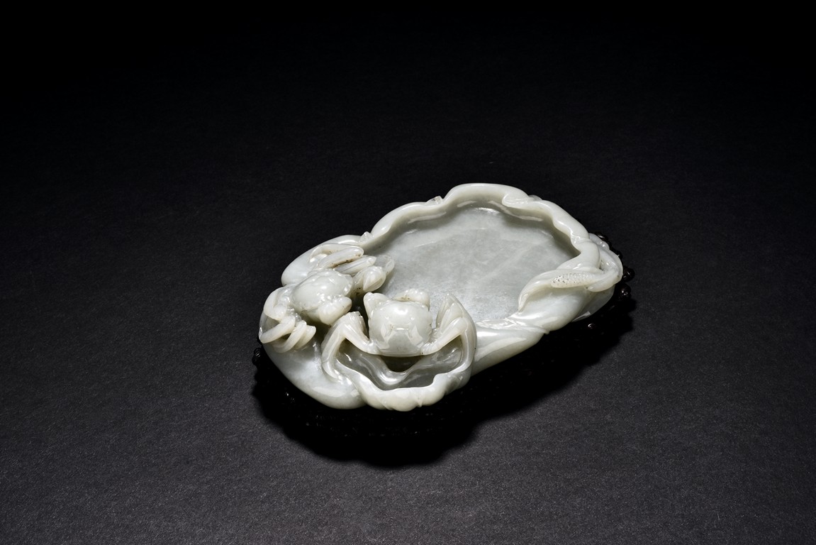 Carved as a irregularly formed lotus leaf-shaped basin with a gnarled stem of lotus bud issuing around the side, the brush washer is further adorned with two crabs perched in high relief. The stone is of soft polished even white tone. Accompanied with a carved hardwood stand. Qing Dynasty period.