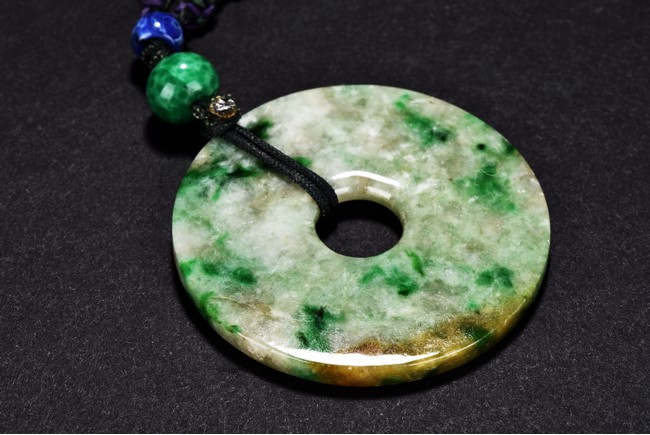 The circular jadeite disc pendant is of semi-translucent mottled greenish white and caramel tone