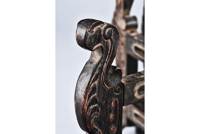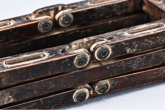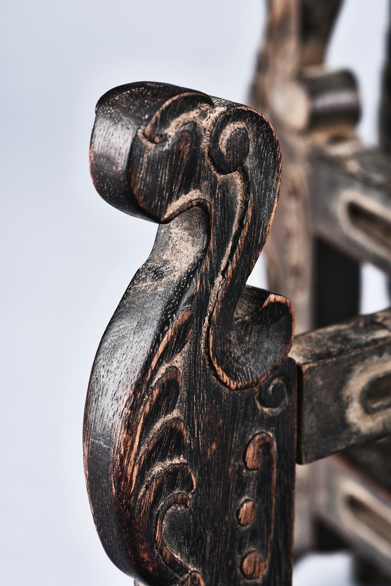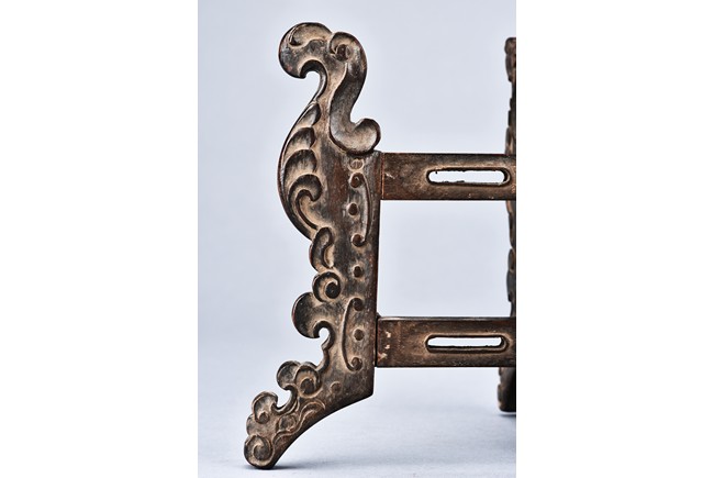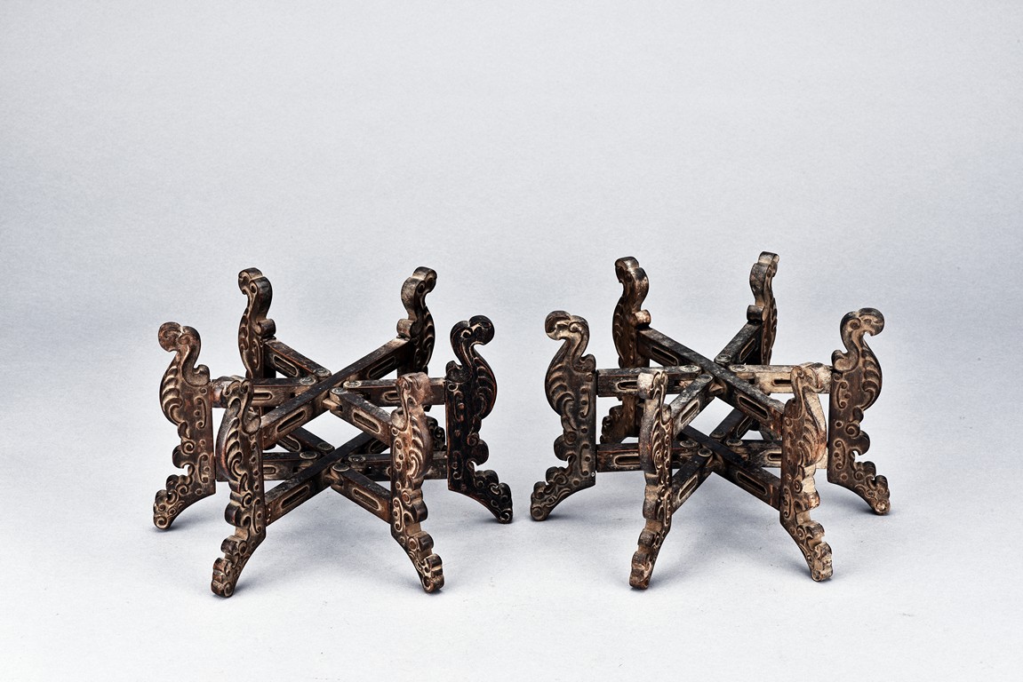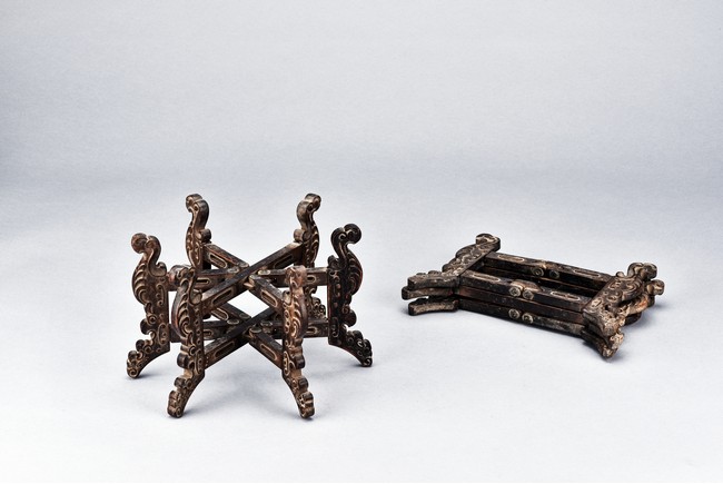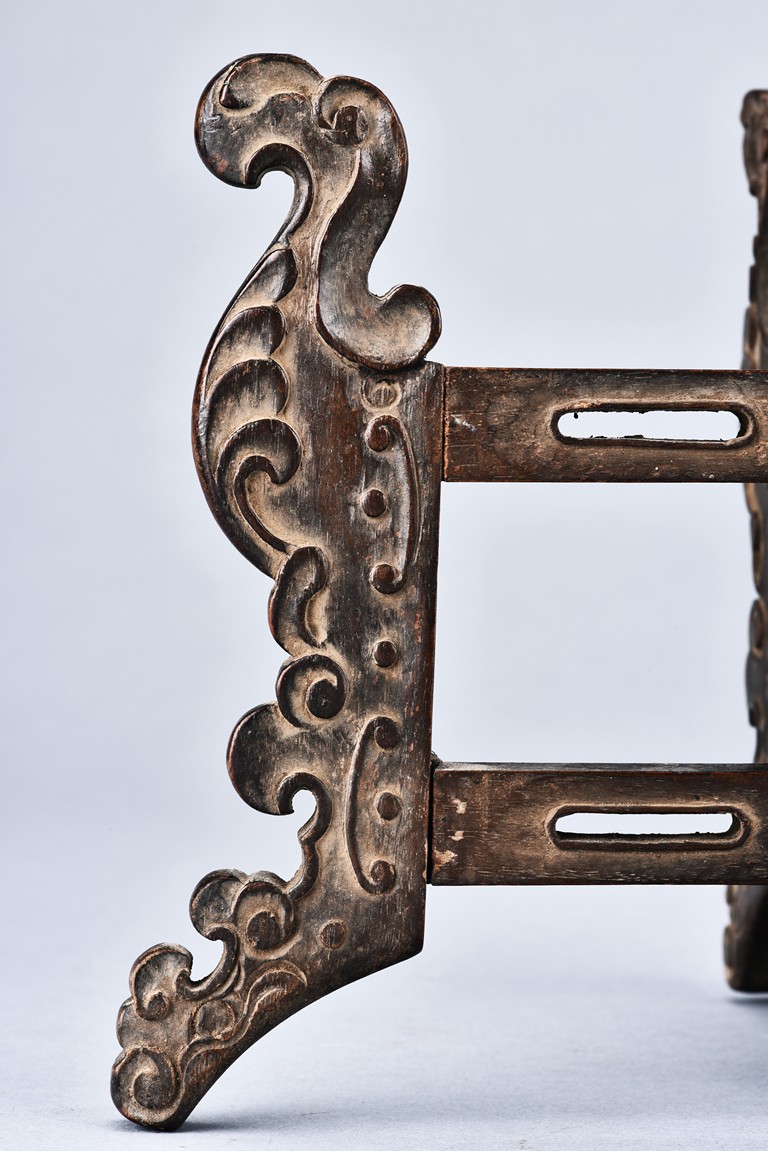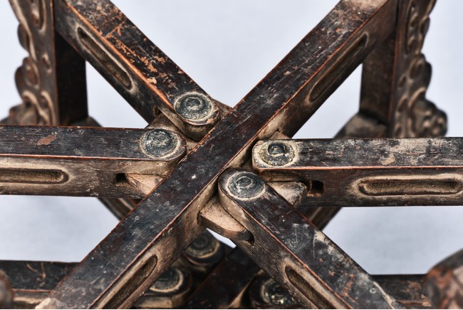 Supported on six mythical beast-form feet with in relief carving, all mechanically crossed over at center point and foldable. Qing Dynasty period.