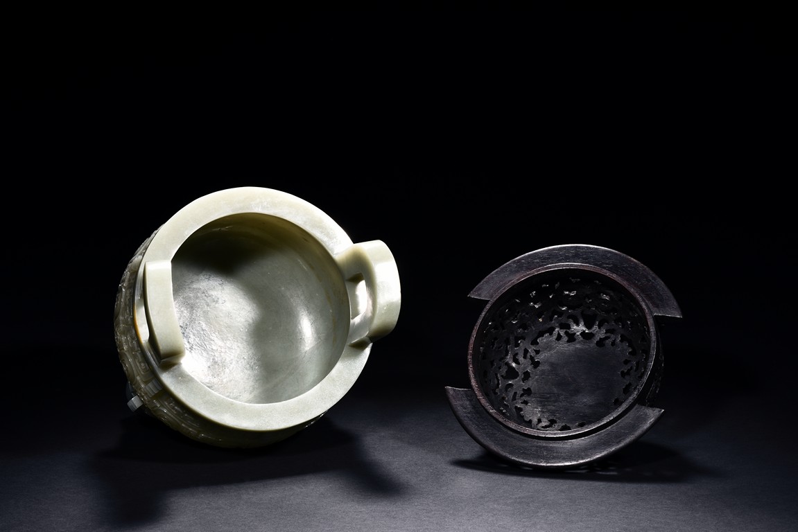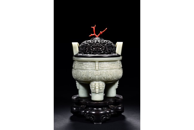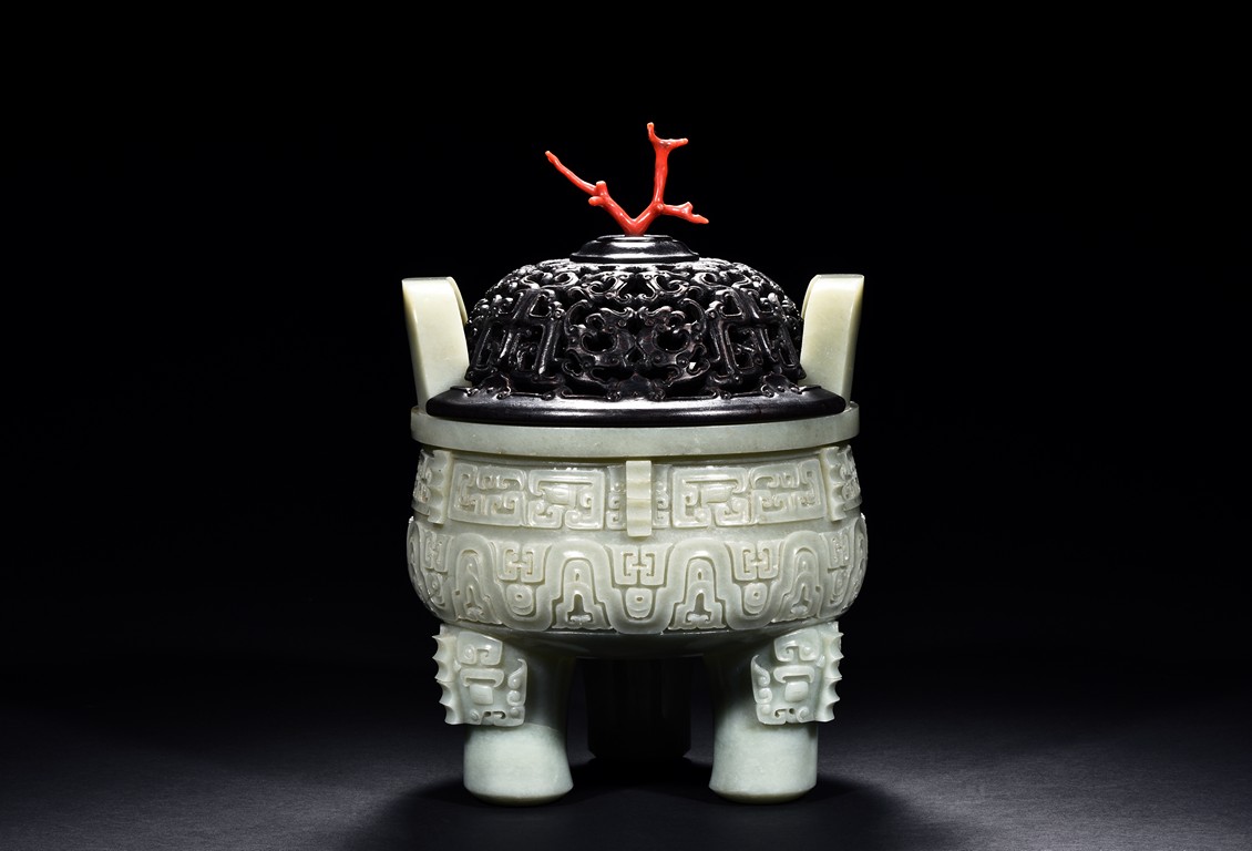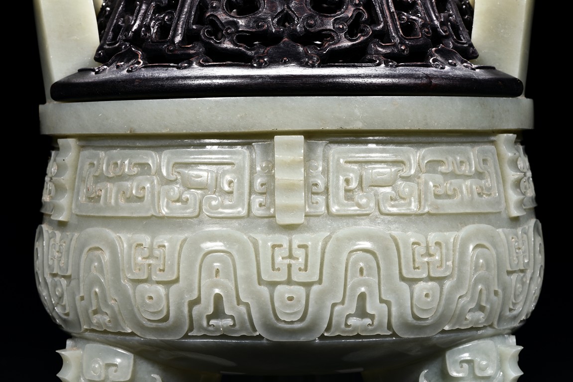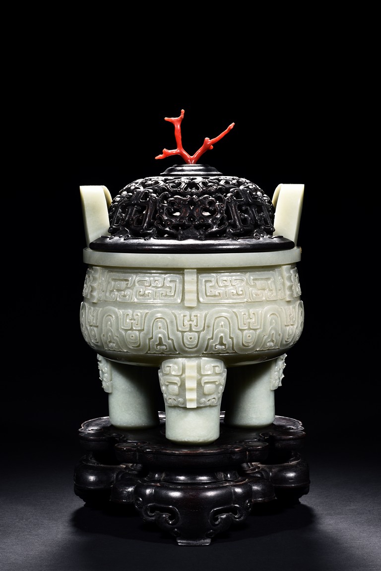 With deep rounded sides, the exterior carved in relief with archaistic scrolls and sinuous pattern between vertical flanges, the rim surmounted with upright handles, all supported on three large feet with taotie mask. The hongmu cover with reticulated design and surmounted with a coral finial. Accompanied with a hardwood stand.