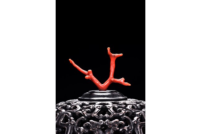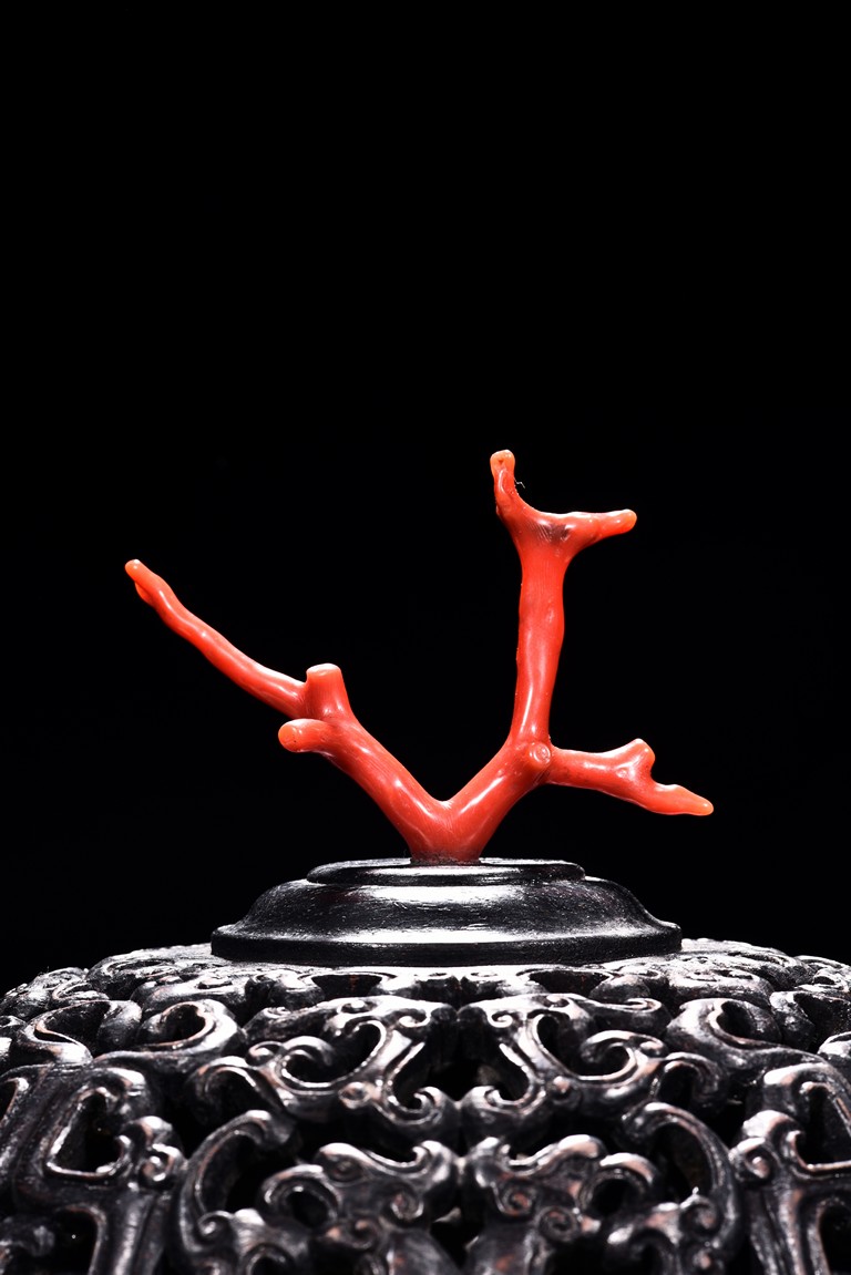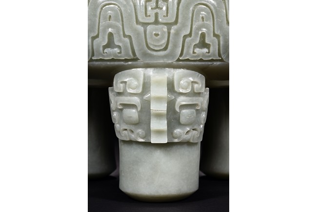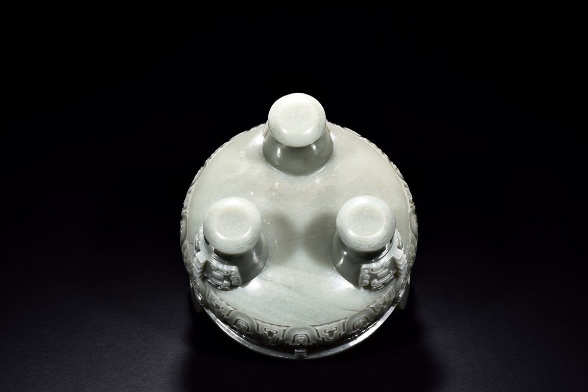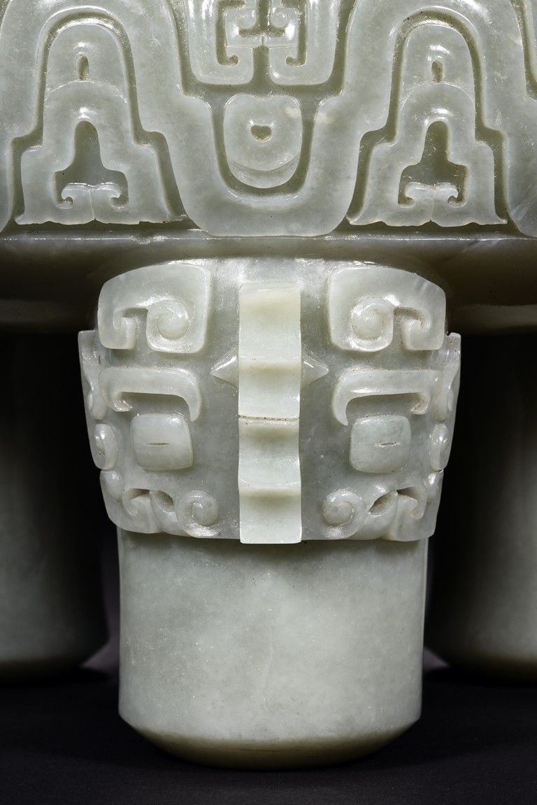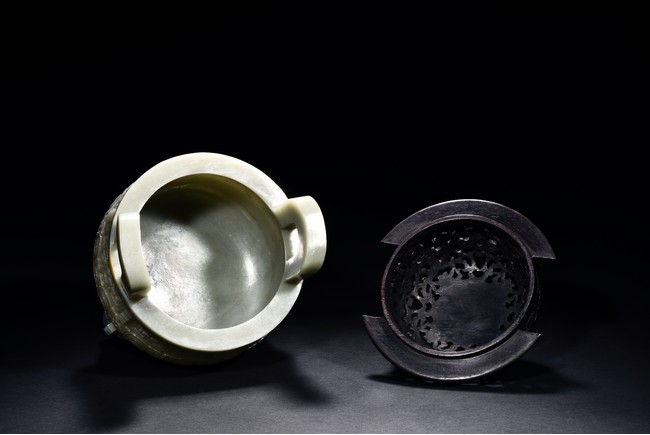 With deep rounded sides, the exterior carved in relief with archaistic scrolls and sinuous pattern between vertical flanges, the rim surmounted with upright handles, all supported on three large feet with taotie mask. The hongmu cover with reticulated design and surmounted with a coral finial. Accompanied with a hardwood stand.