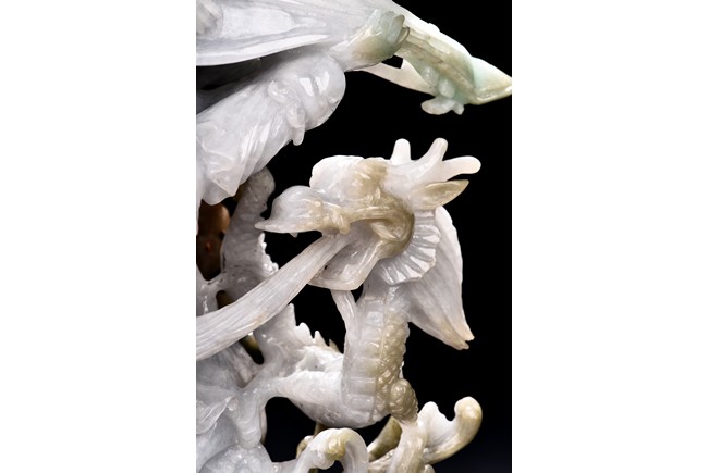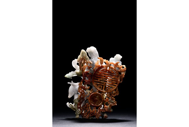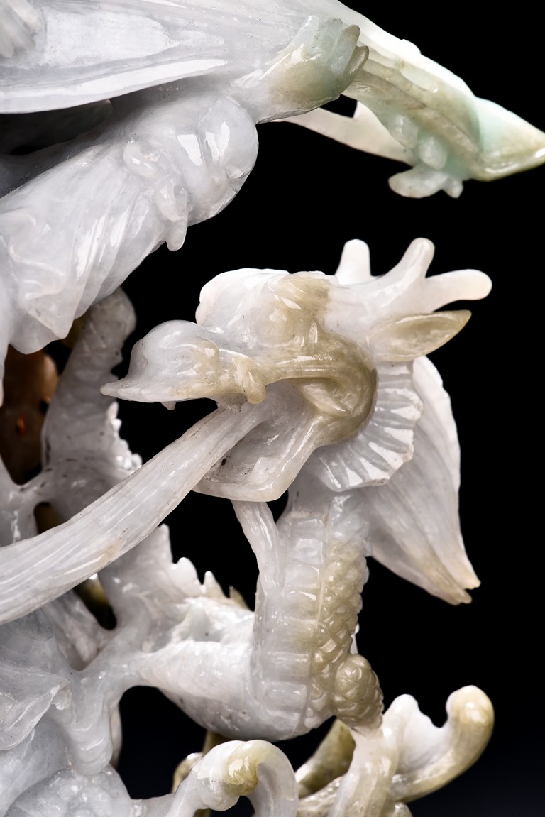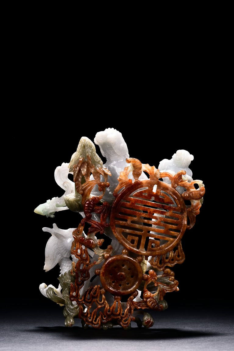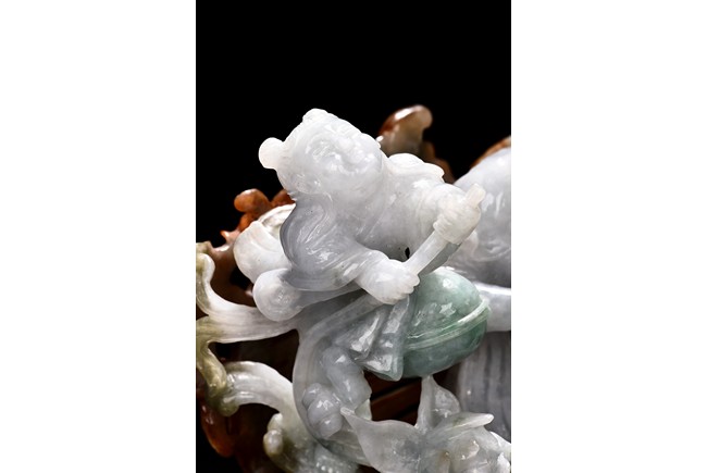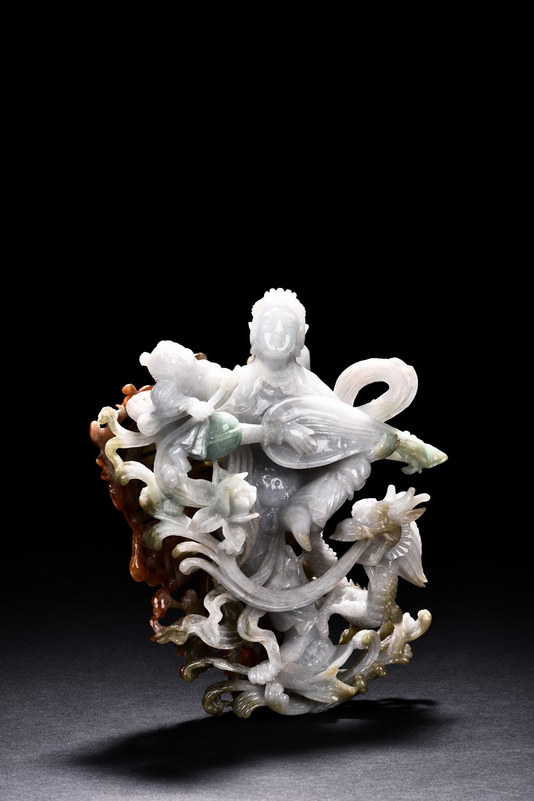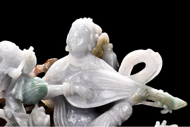 Depicting a female playing pipa with a dragon to her left with water issuing from mouth, a boy to her right, the back with a stylized shou medallion flanked by bats, the bottom with a flaming wheel. Republic period.