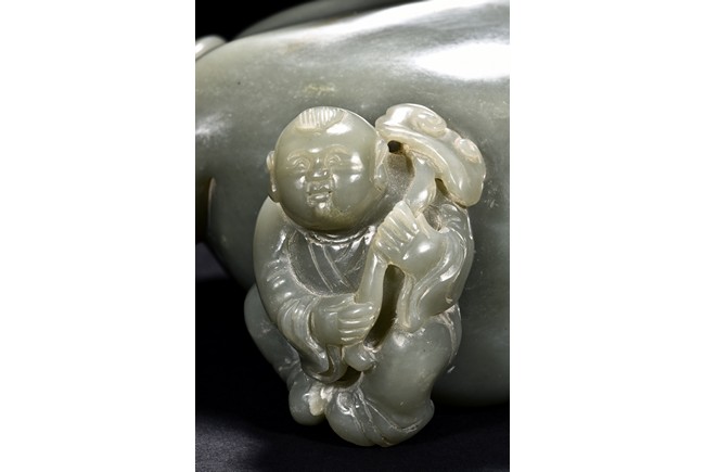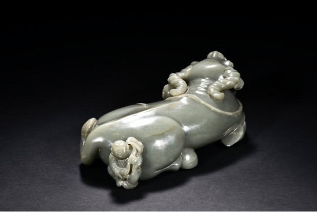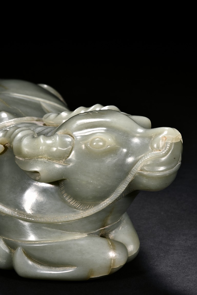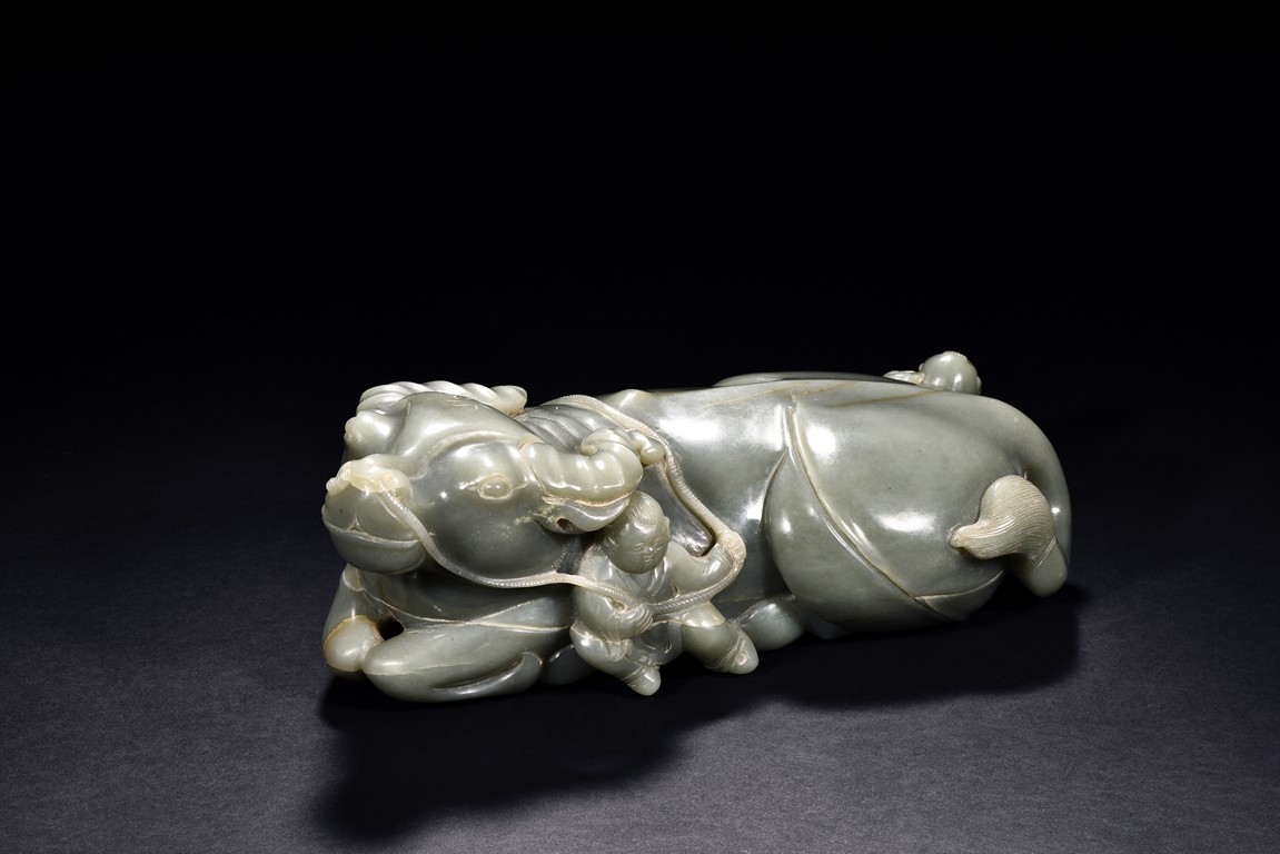 The recumbent buffalo is carved with four feet tucked underneath body, the head slightly raised and tail swept to the left, with a boy sitting beside holding a rope tied through its nostril and over its back, and the other side with a boy holding a large lingzhi. The stone is of even celadon tone with minor russet veins. Accompanied with hardwood carved base imitating the rocky ground. Qing Dynasty period.