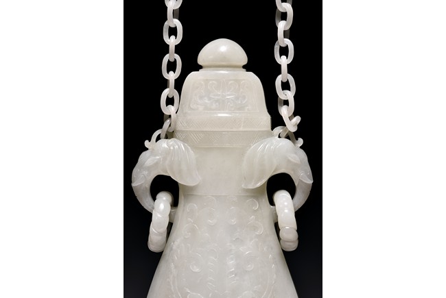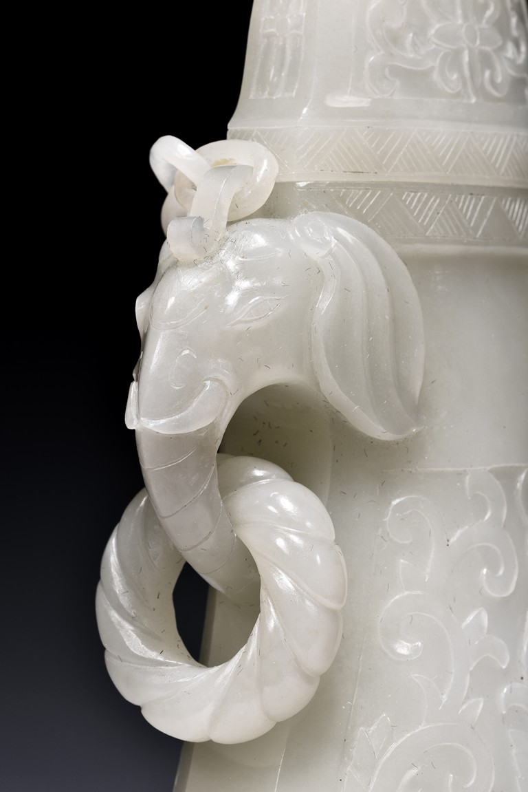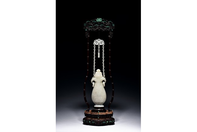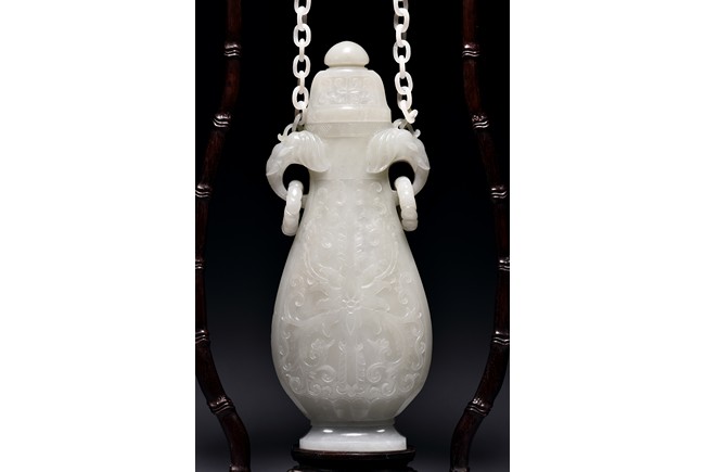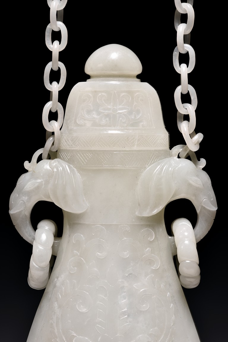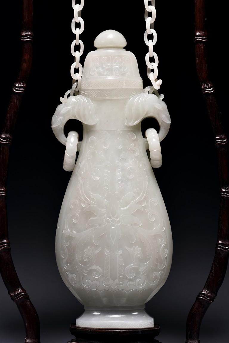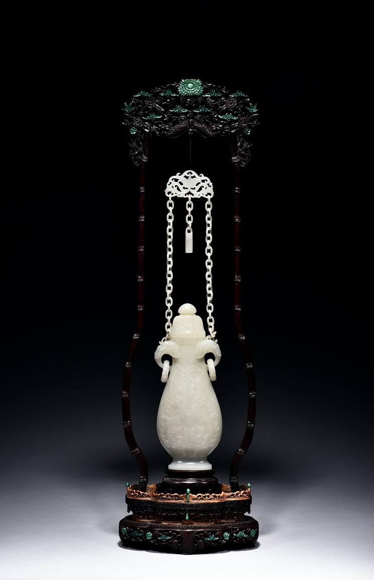 Of flattened ovoid form, the vase body is finely carved with stylized scrolling floral pattern to the front and reserve in shallow relief, the narrow neck is flanked by two elephant-head handles suspending loose rope-form rings, the rim finely decorated with a key-fret pattern band, the cover surmounted with a domed finial, below reticulated chains tied to a plaque hanging within a delicately carved and pierced hardwood stand.