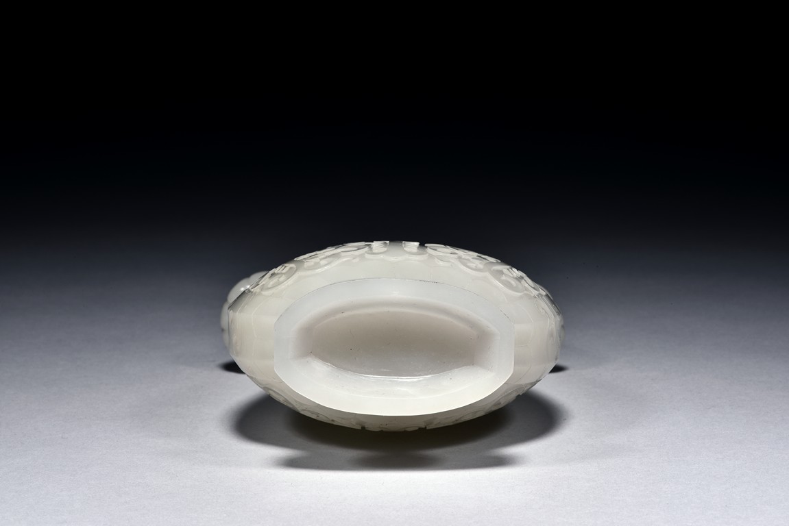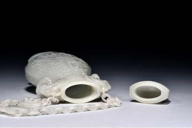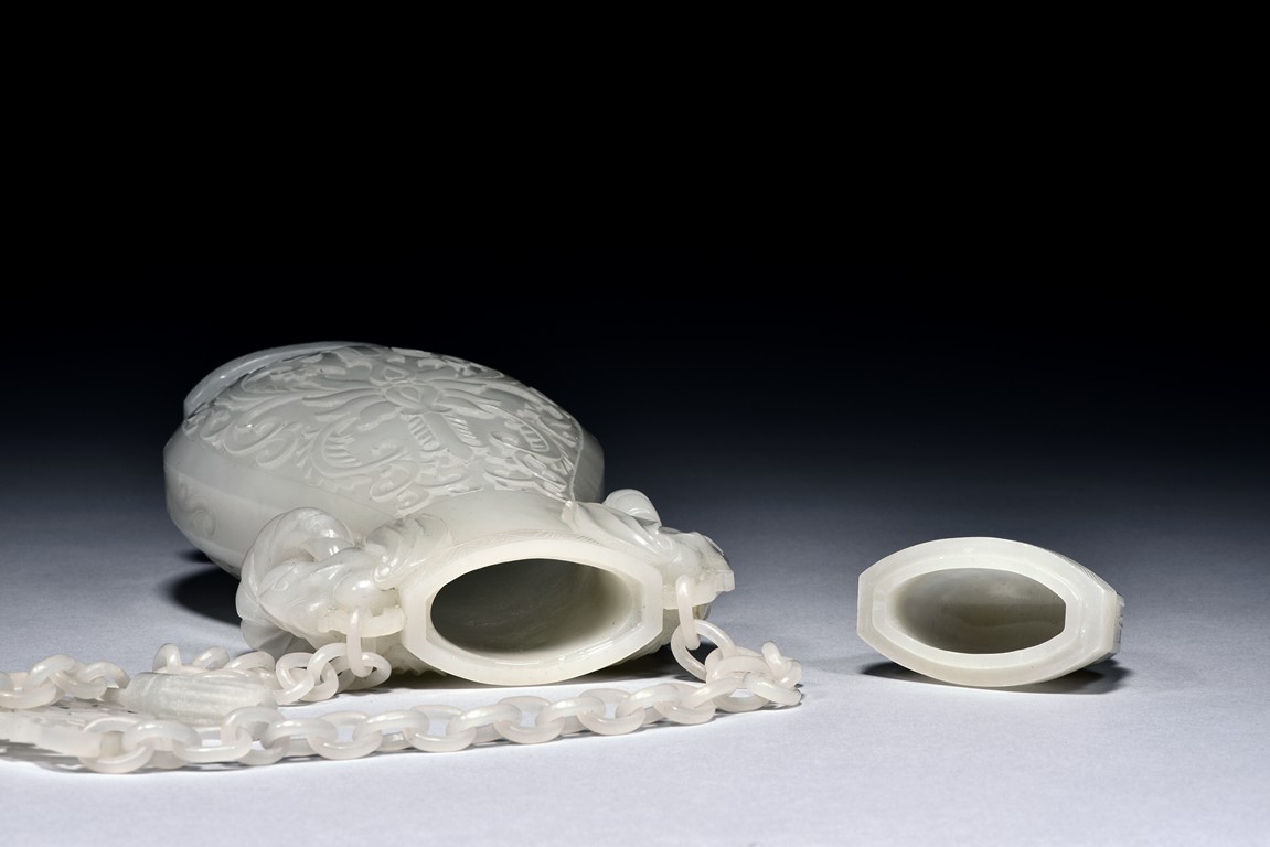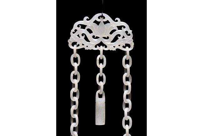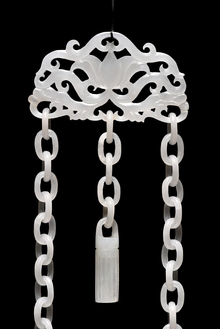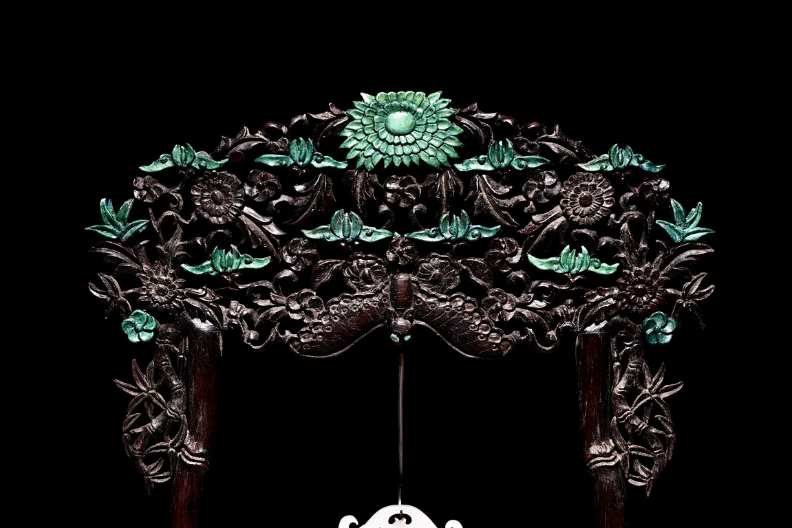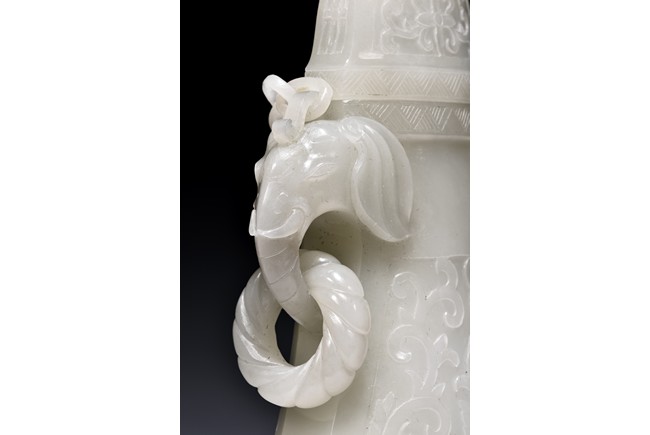 Of flattened ovoid form, the vase body is finely carved with stylized scrolling floral pattern to the front and reserve in shallow relief, the narrow neck is flanked by two elephant-head handles suspending loose rope-form rings, the rim finely decorated with a key-fret pattern band, the cover surmounted with a domed finial, below reticulated chains tied to a plaque hanging within a delicately carved and pierced hardwood stand.
