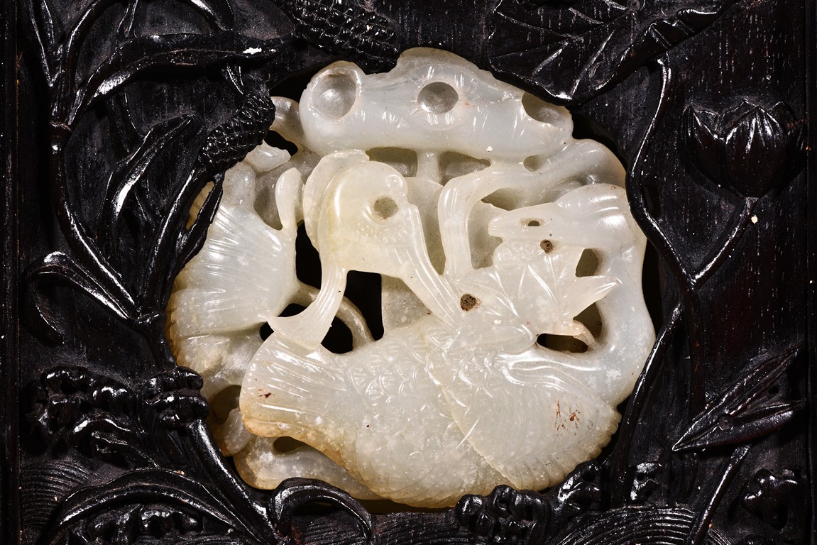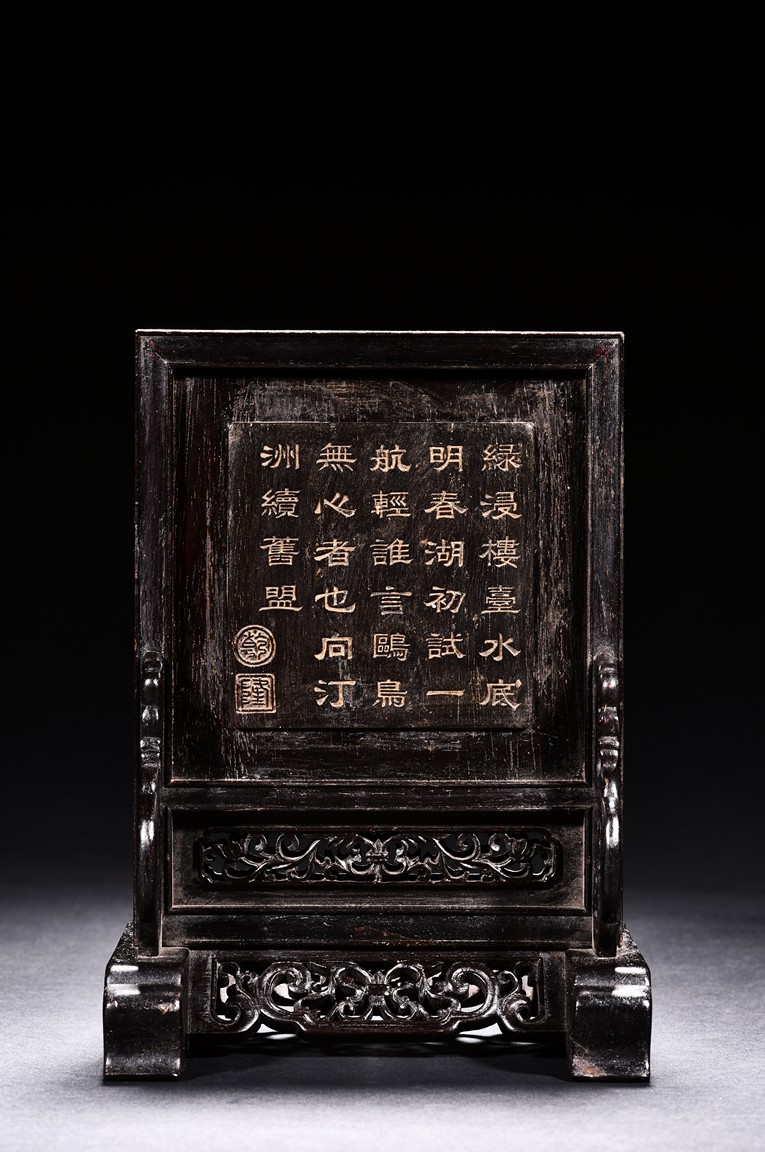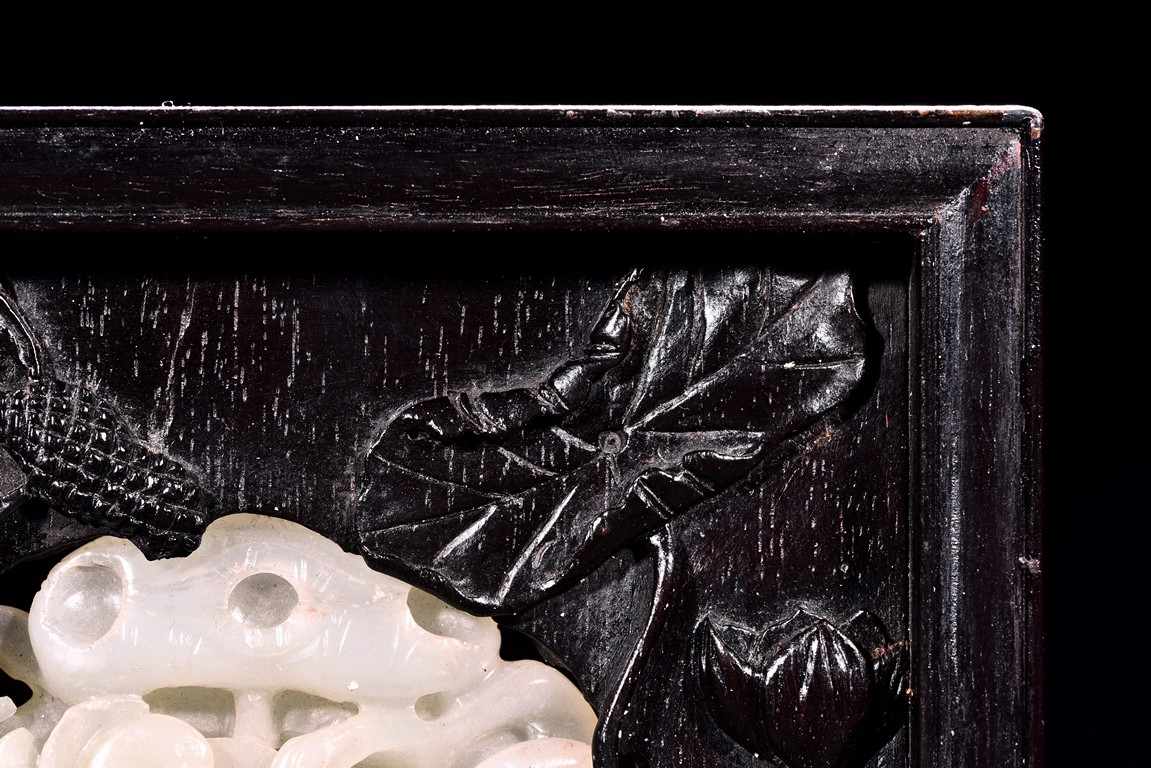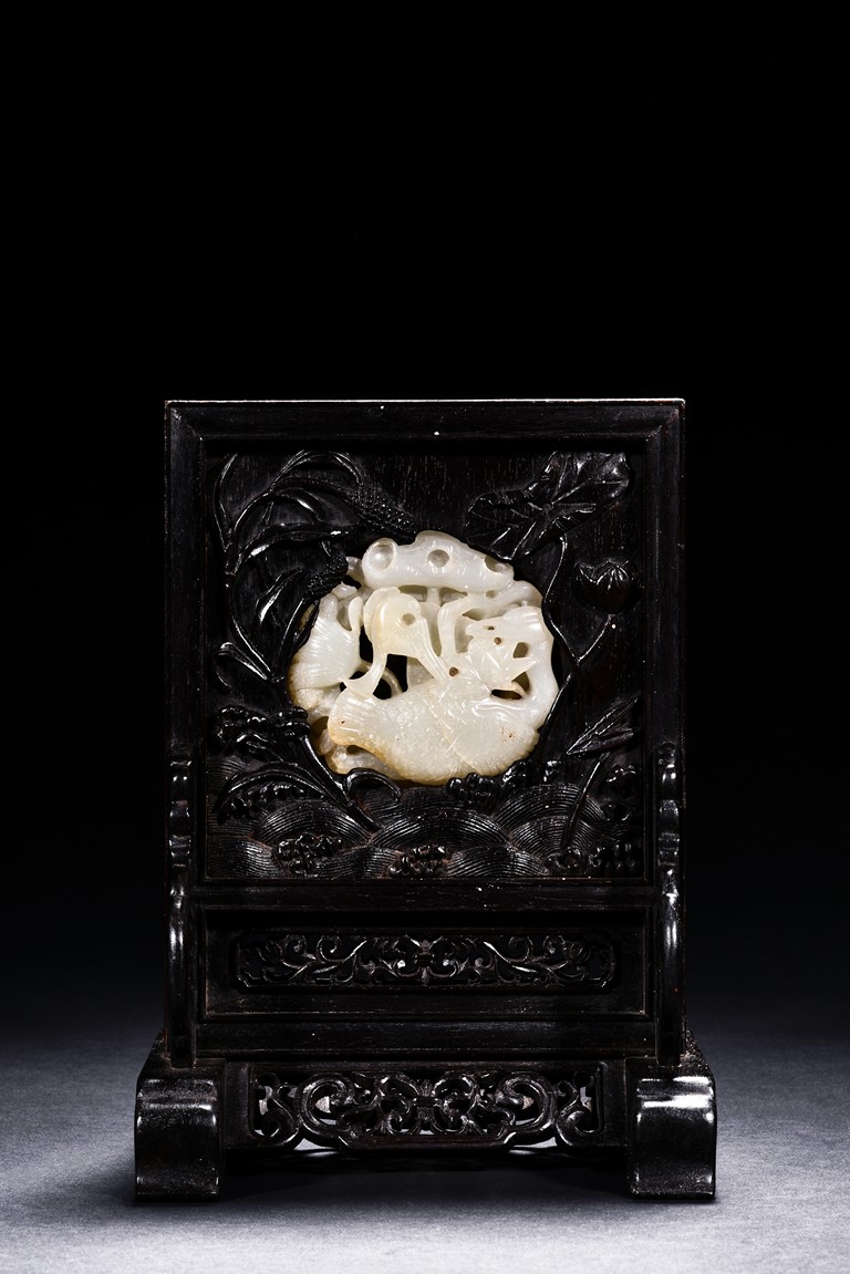 The jade plaque finely reticulated with swimming swan with head turning back amidst blossoming lotus, set into a zitan stand further carved with lotus issuing from the river, the back wooden panel inscribed in gilt with imperial poem and marks; the jade stone is of semi-translucent even white tone.