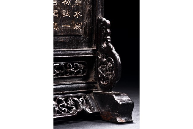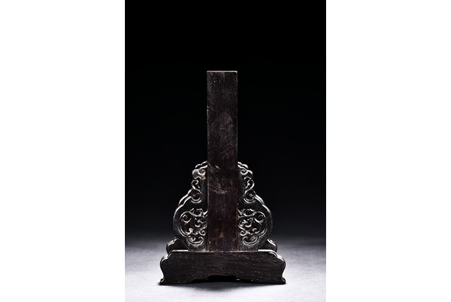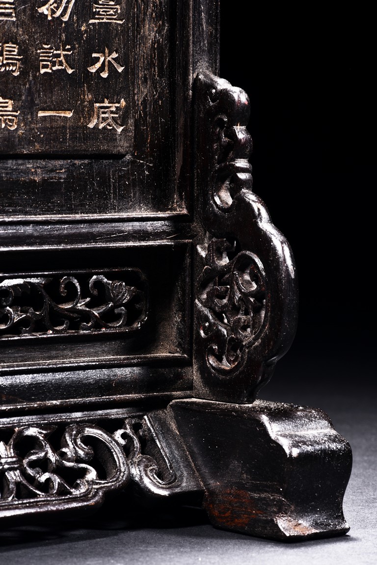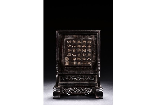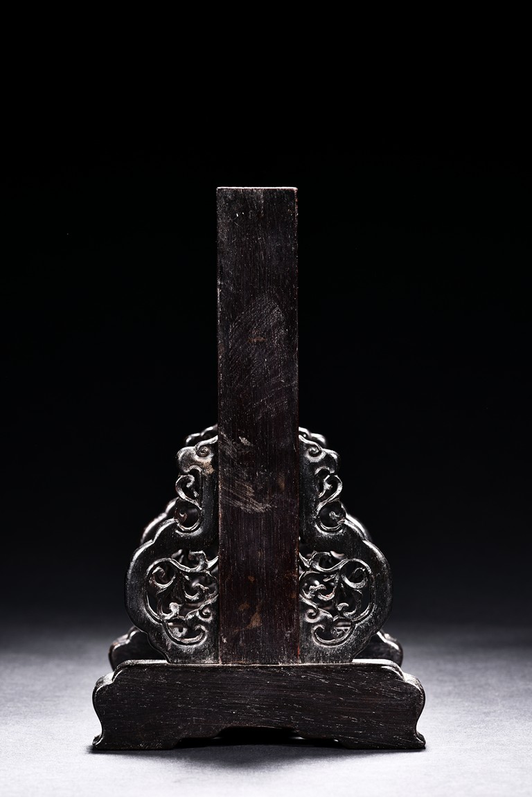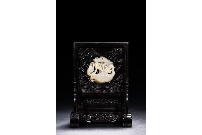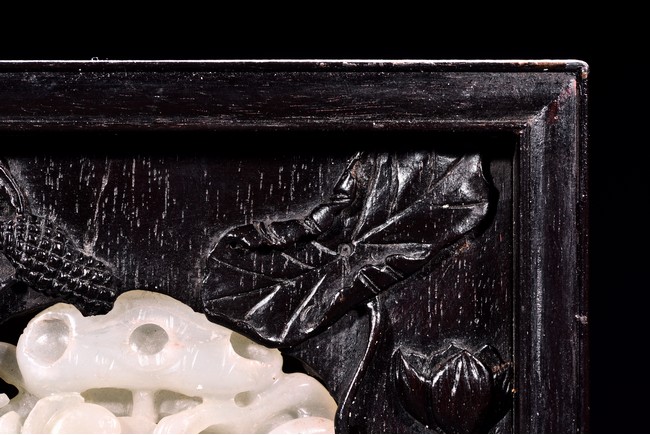 The jade plaque finely reticulated with swimming swan with head turning back amidst blossoming lotus, set into a zitan stand further carved with lotus issuing from the river, the back wooden panel inscribed in gilt with imperial poem and marks; the jade stone is of semi-translucent even white tone.