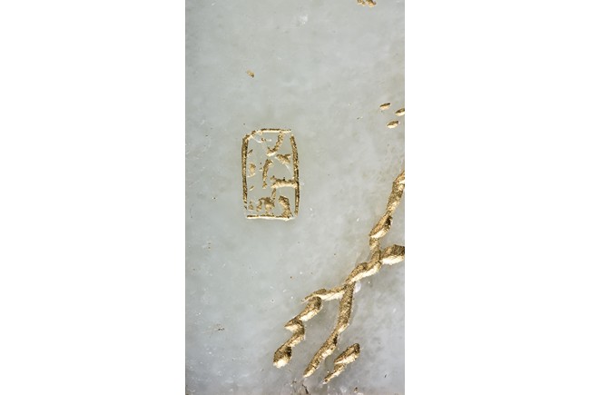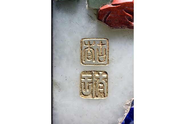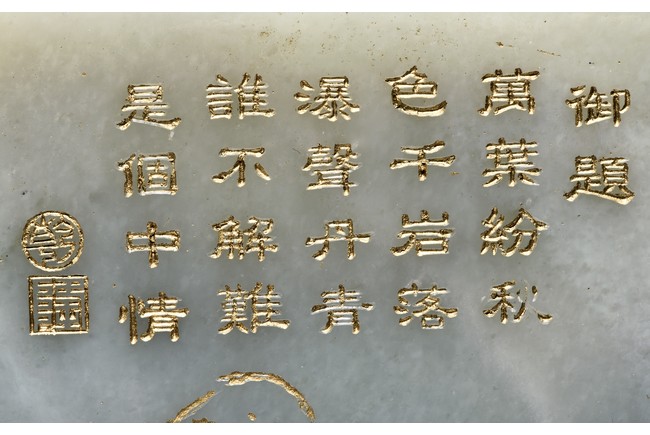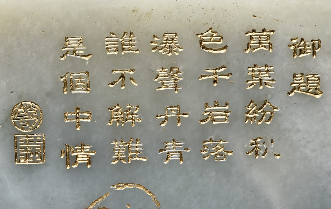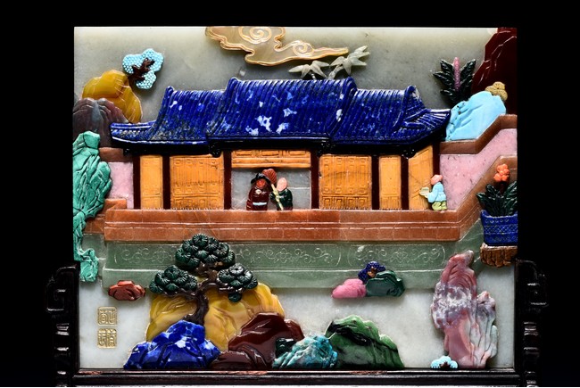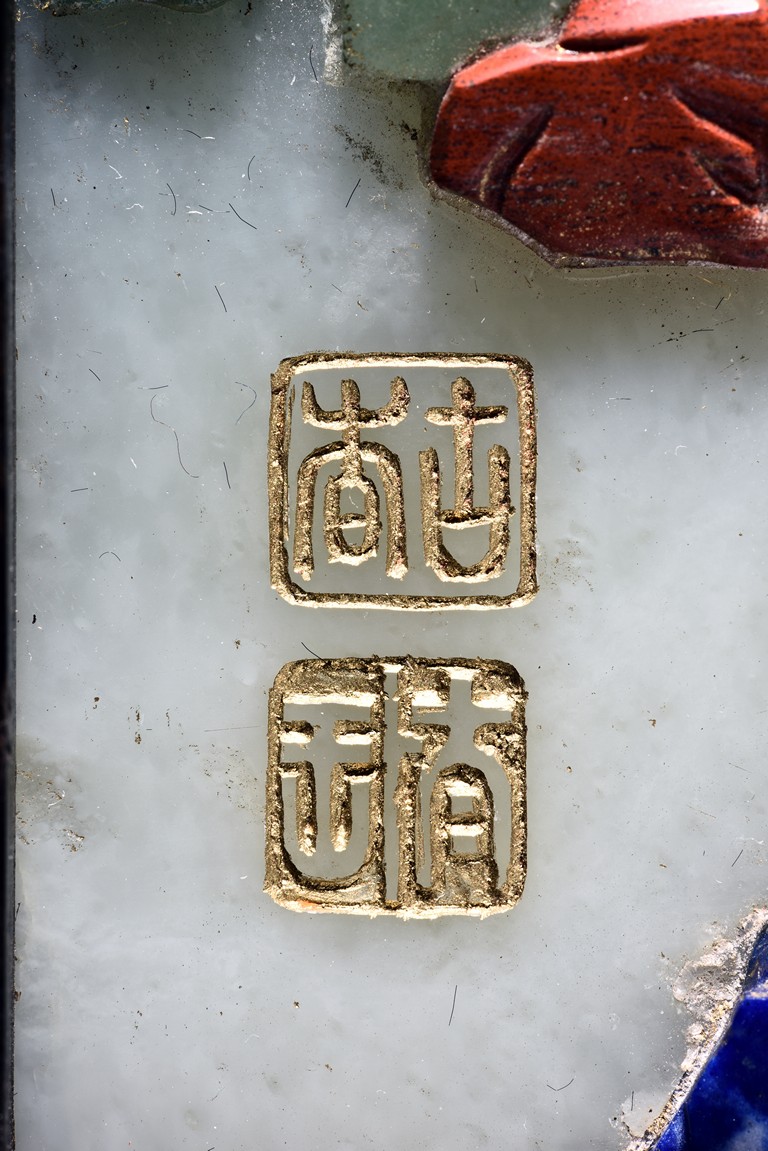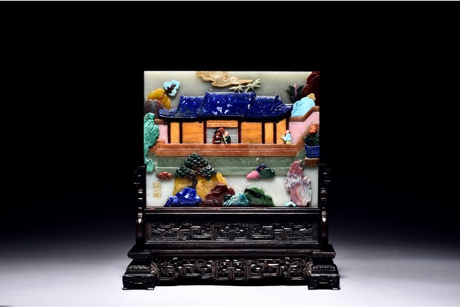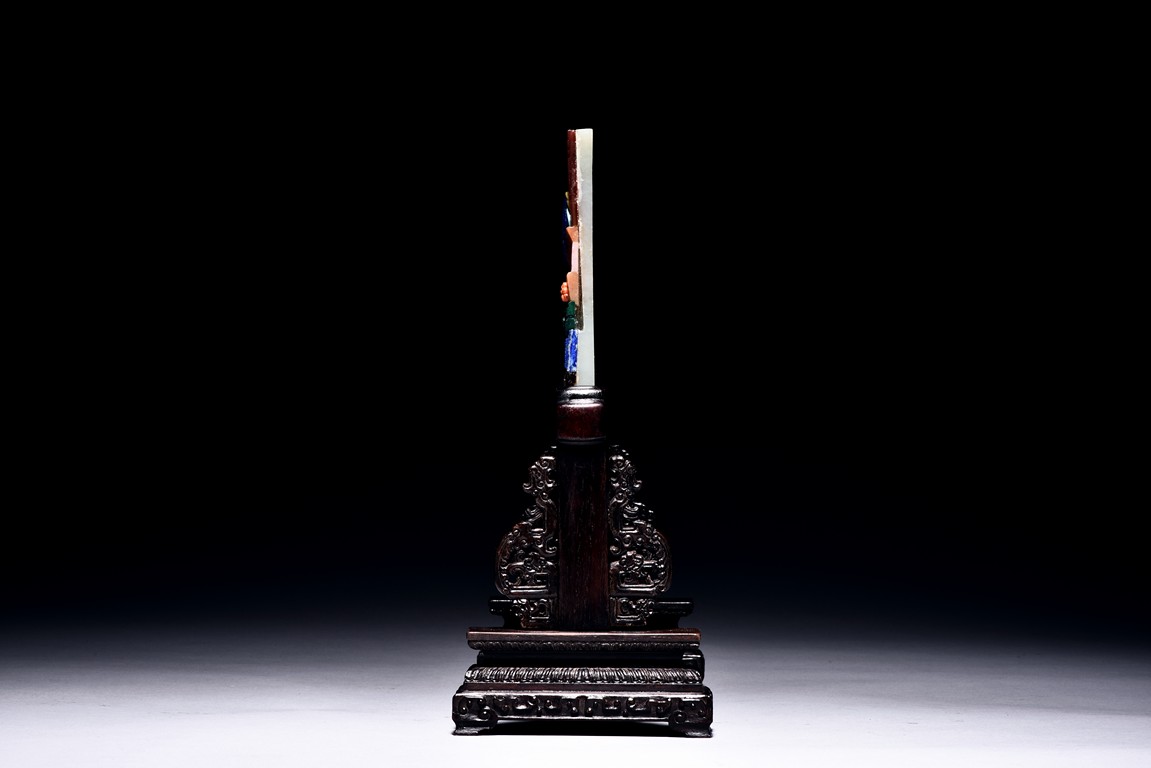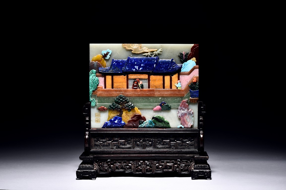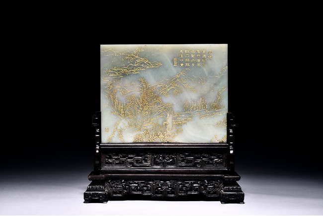 Of rectangular form, the white jade panel is inlaid with various gems and semi-precious gems, including turquoise, lapis lazuli, agate, spinach jade, tourmaline, coral, and jadeite, all against the white jade ground, depicting an official on a high terrace overlooking the pond with various rockworks and pine tree, his attendant holding a fan besides him, with another attendant holding a dish walking towards them, all in front of a walled building leading to the garden inside, with trees and rockworks and auspicious clouds in the background; the reverse is finely incised and gilded with a landscape scene of a riverside village amidst mountains, with three buildings on riverbank and various trees growing from the craggy rocky mountains, the upper right with imperial poem inscription and seal marks.
