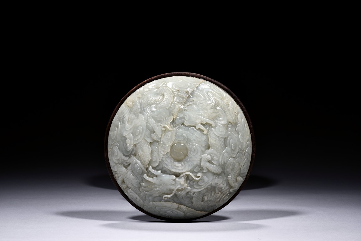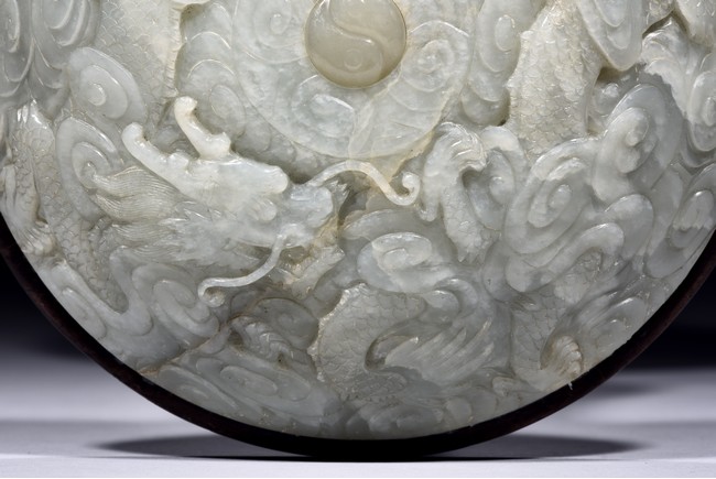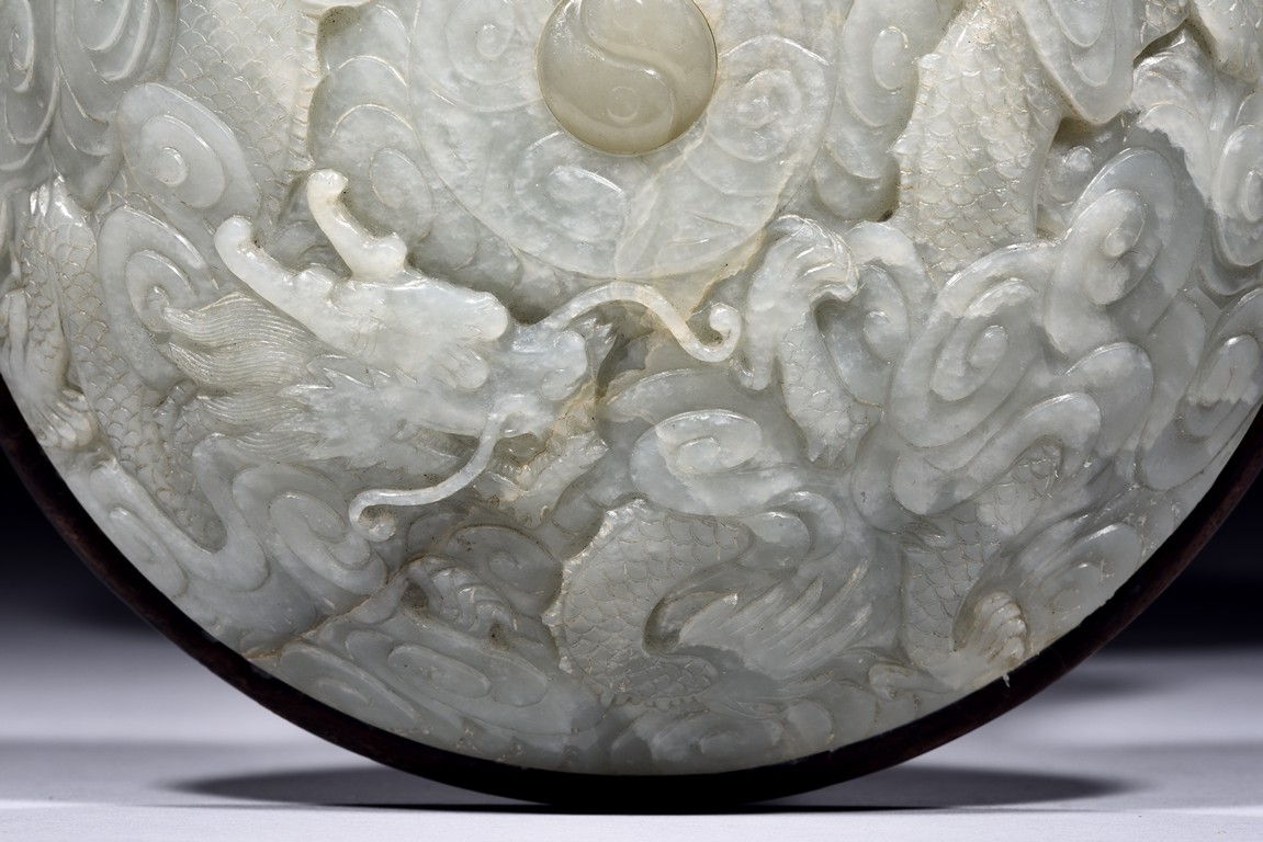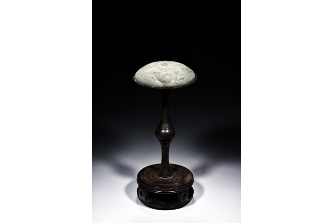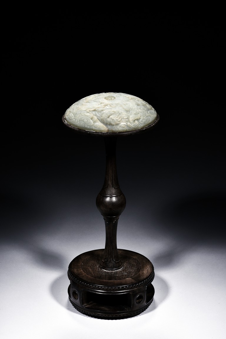 The domed white jade hat rest carved in relief with a pair of dragons in pursuit of a white jade Yin-Yang pearl to the center, its scales, claws, and head highly detailed, all against the ground of swirling auspicious clouds. The rest supported on a slender hardwood stand and raised on a circular base, terminating in four rectangular section feet. Qing Dynasty Qianlong Period.