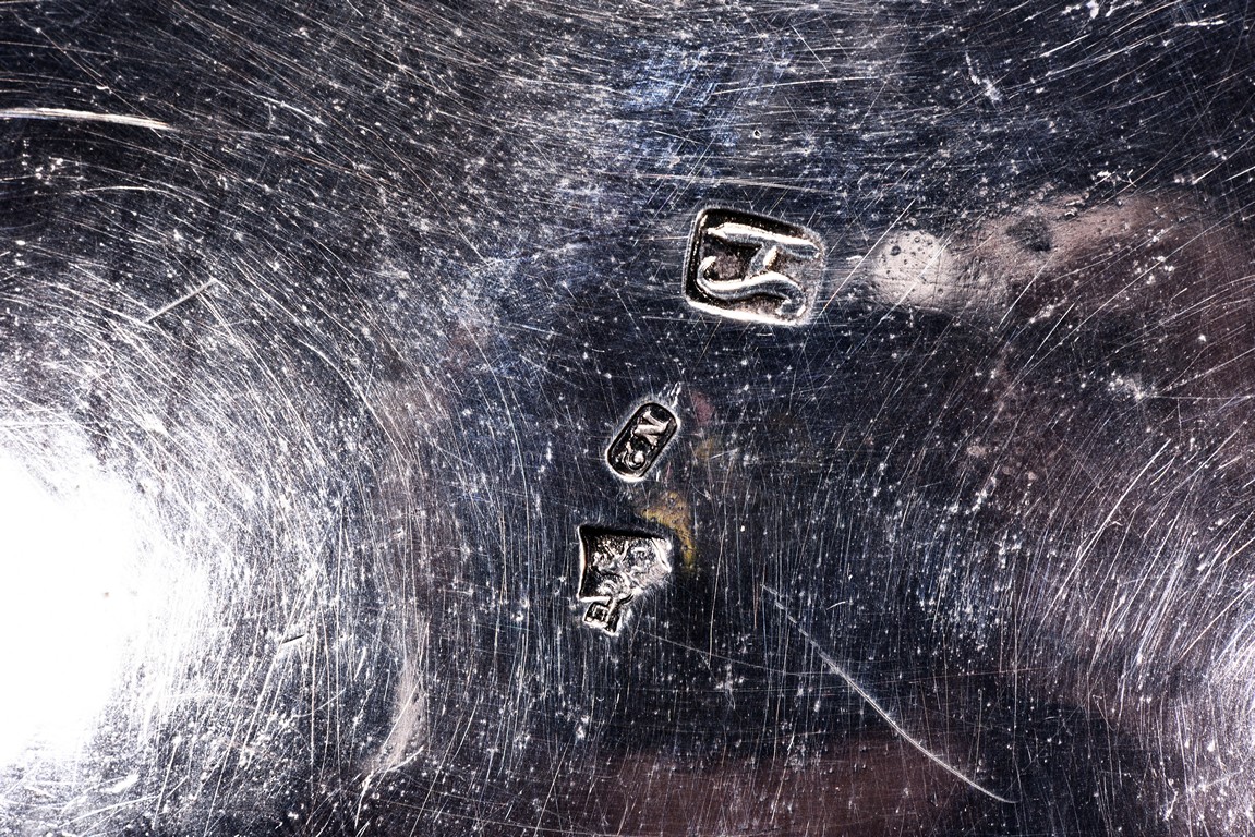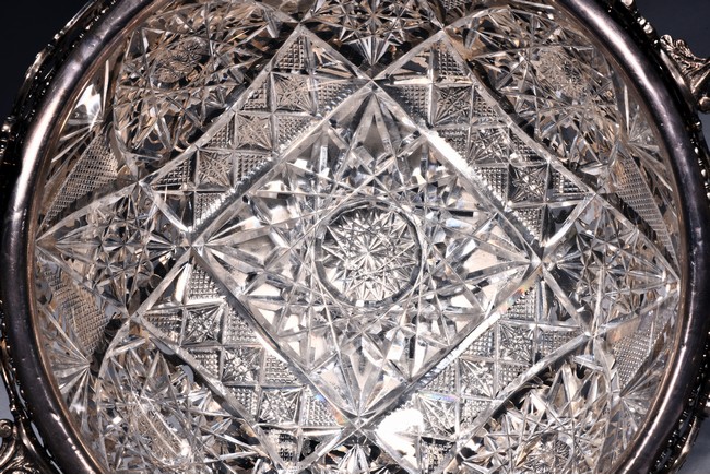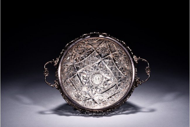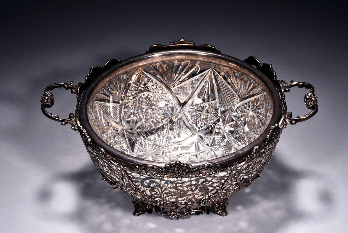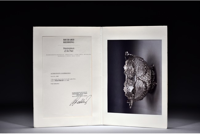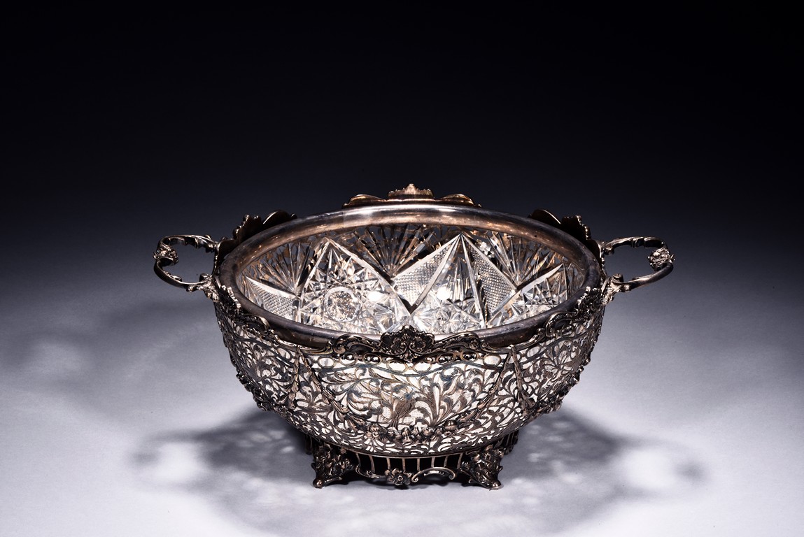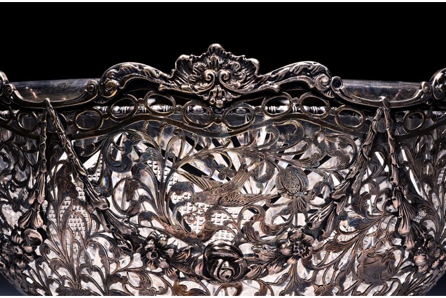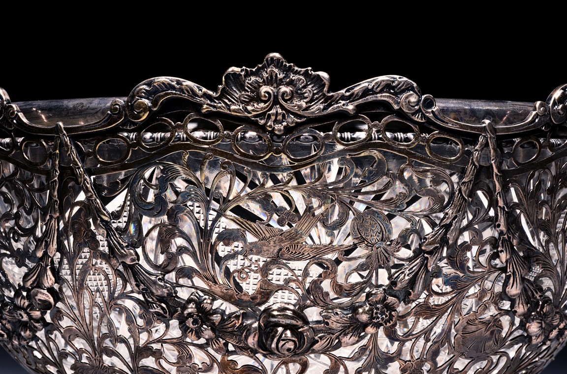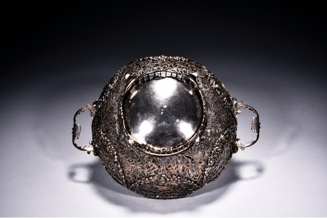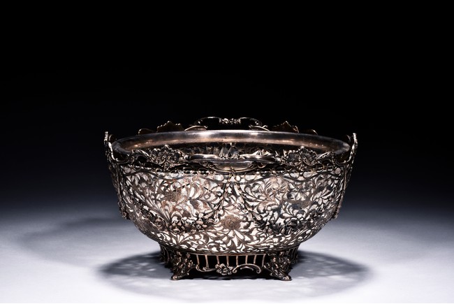 Rising from four floral feet, the bowl is intricately pierced and engraved with flowers, foliage, and scrolls, flanked by two scroll shaped handles, the interior with glass liner, and the bottom etched with marks. Accompanied with appraisal report from Richard Redding Inc, Switzerland. 19th Century.