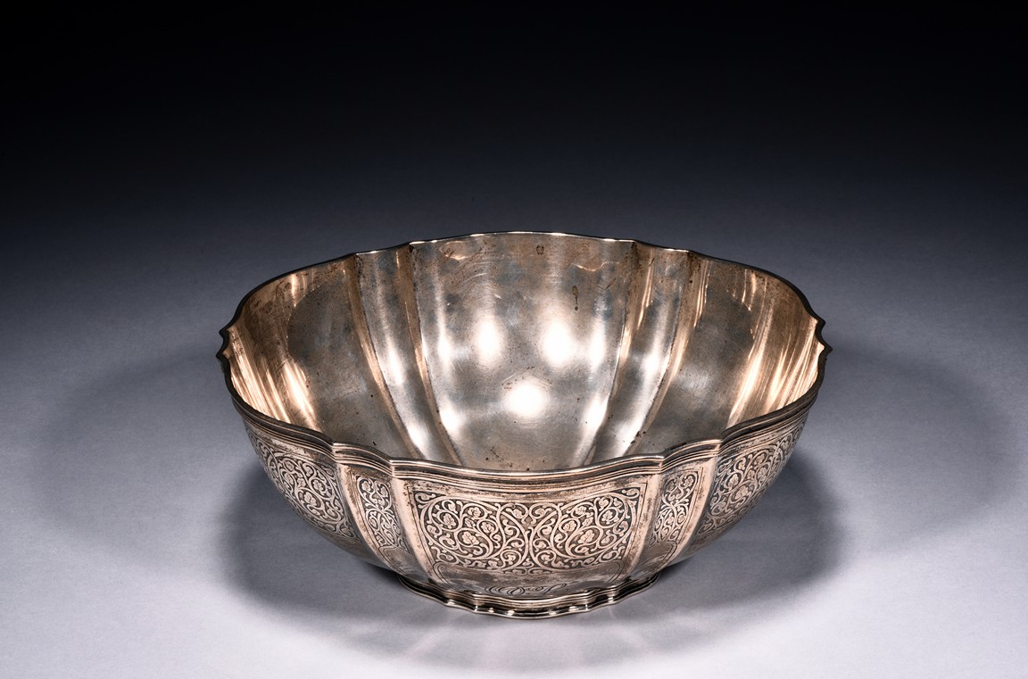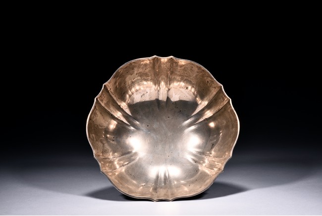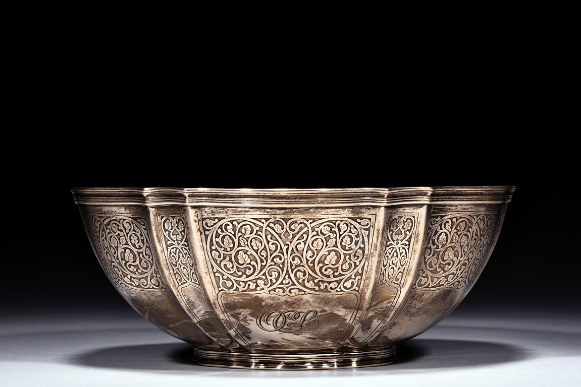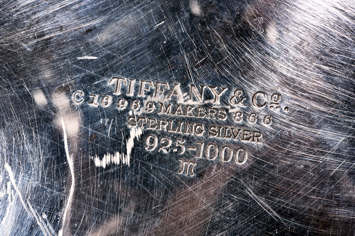 Of floriform form, the bowl intricately engraved with stylized foliate scroll decoration, the base bears mark Tiffany & Co. C16969 Makers 866 sterling silver 925-1000.