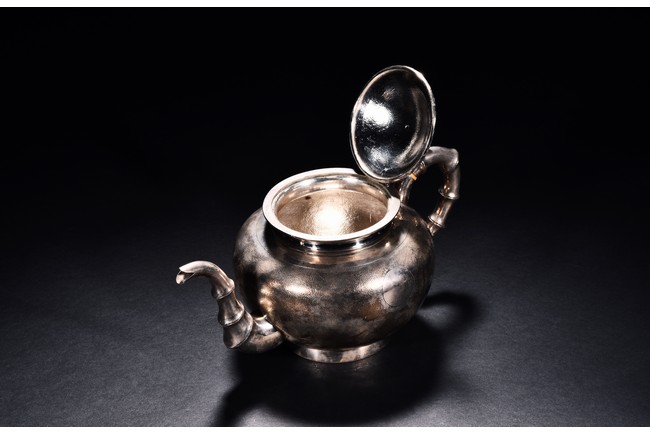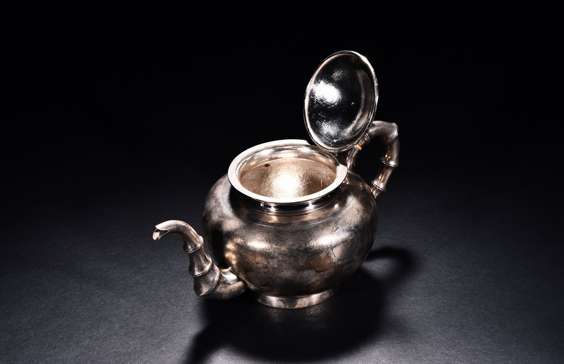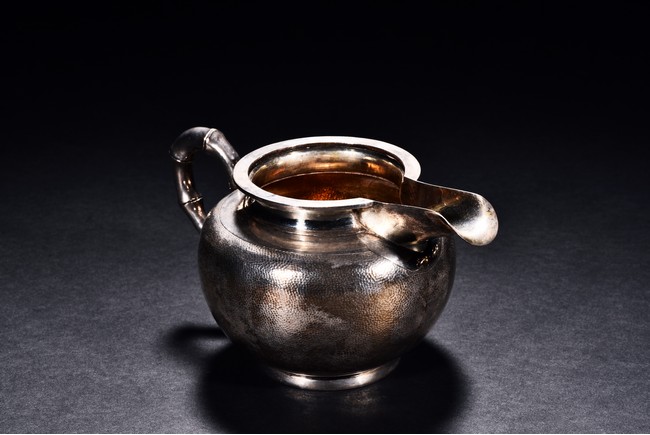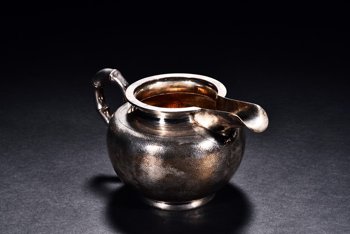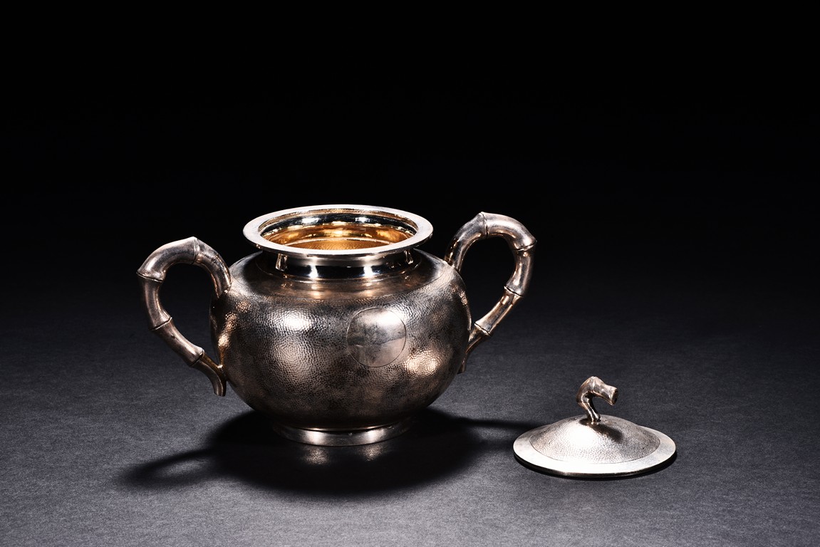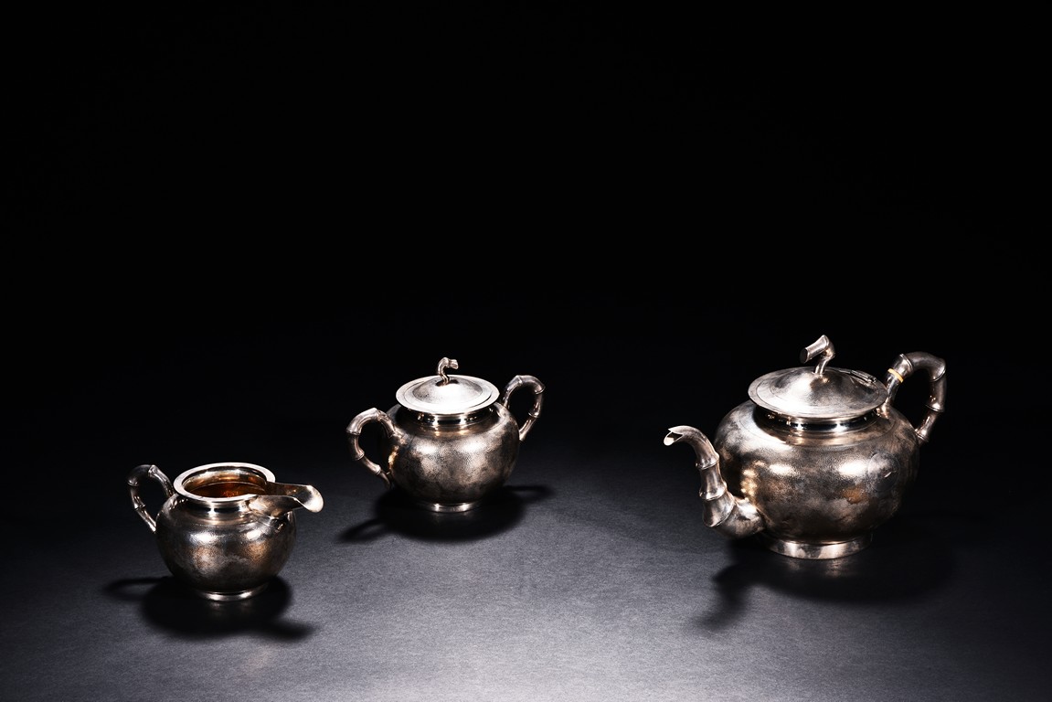 Comprising a teapot, two-handled sugar bowl and cover, and a milk jug, each with handles imitating bamboo. 19th Century.