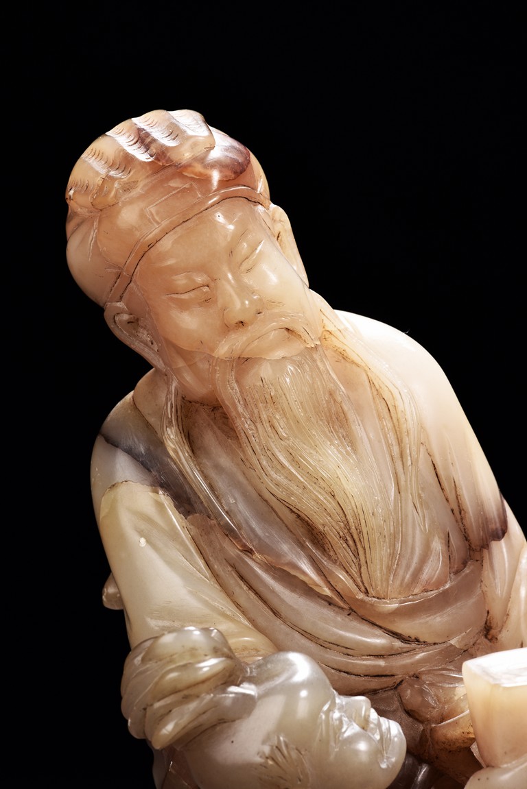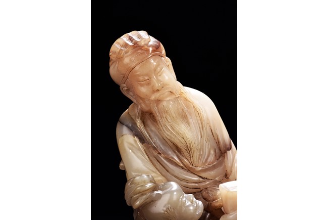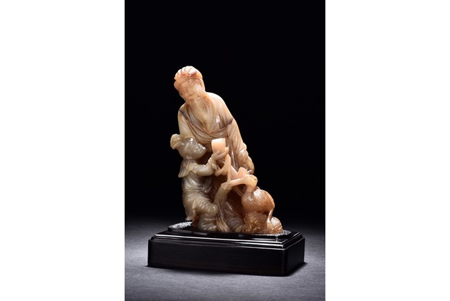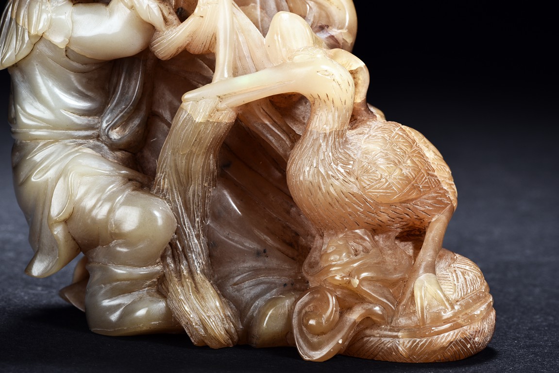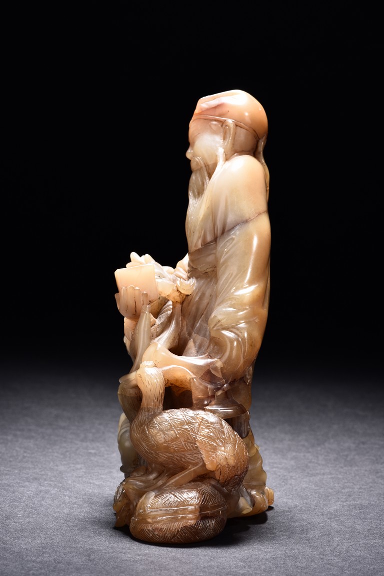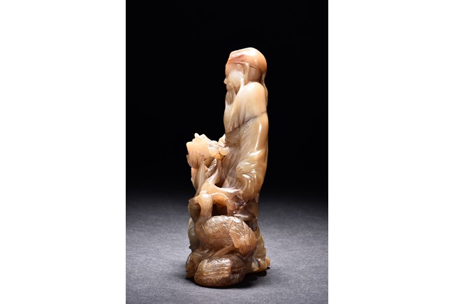Carved as an elderly man with long beard with a child under his right arm holding a box, with a crane seated on his feet. Qing Dynasty period.