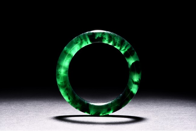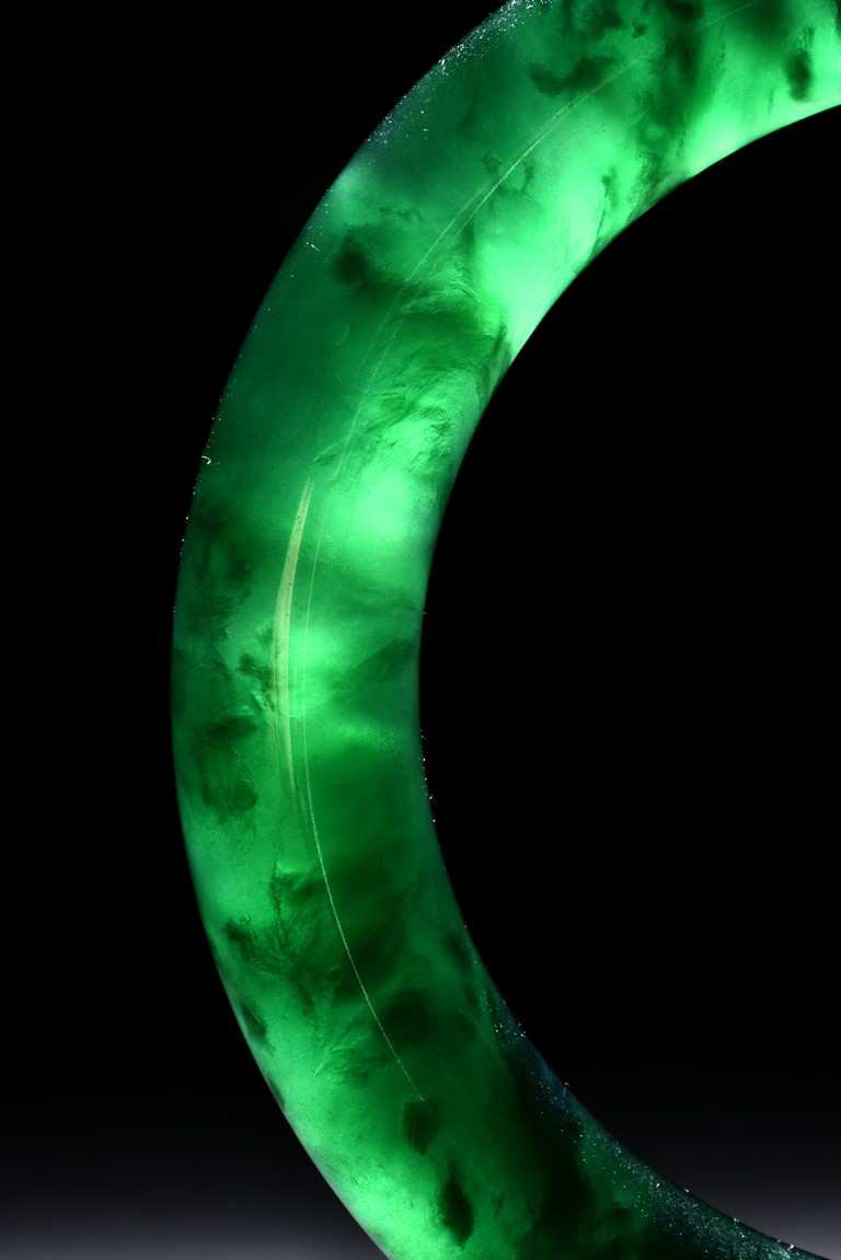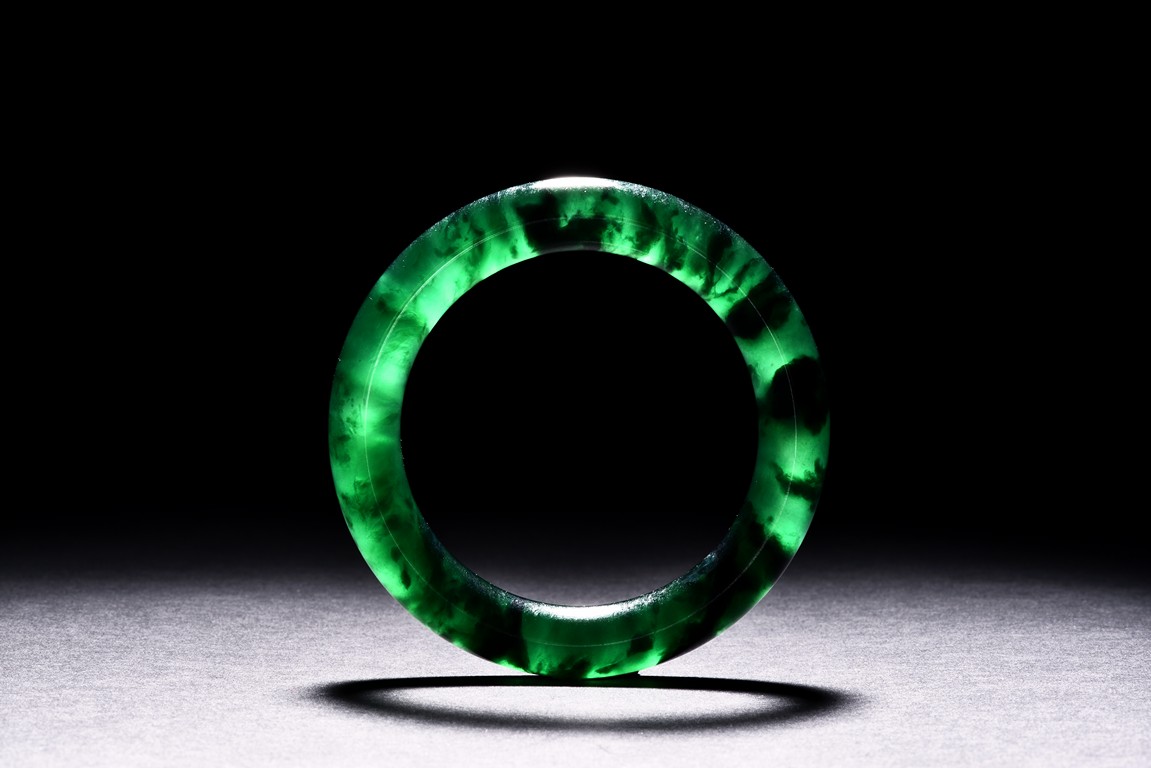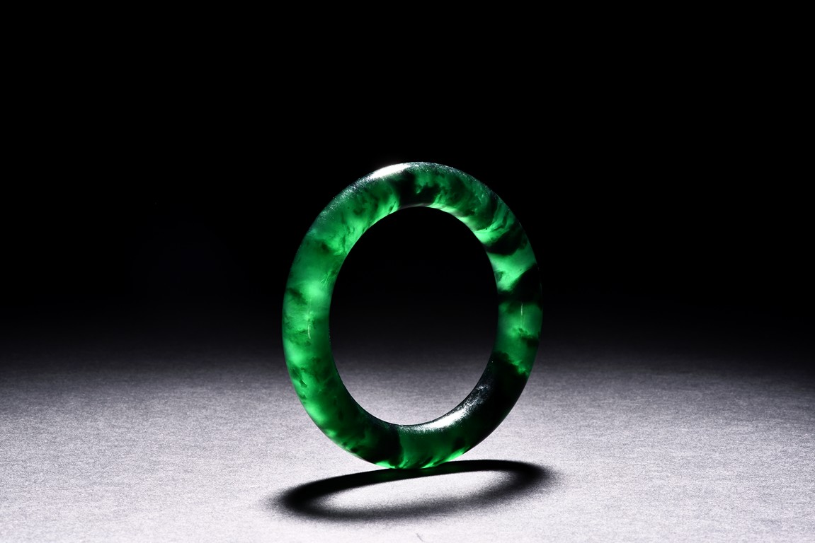 Of good translucency, the bangle is of mottled green and dark spinach green tone.