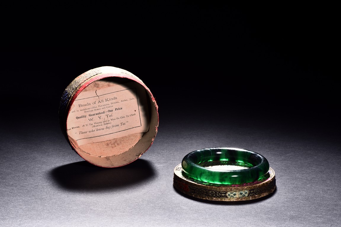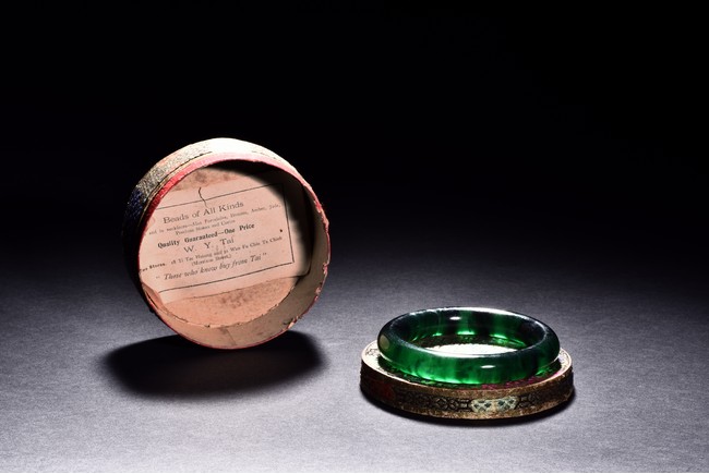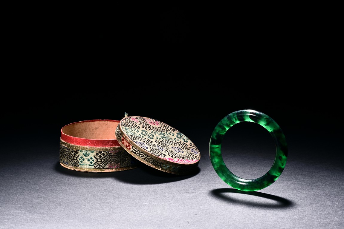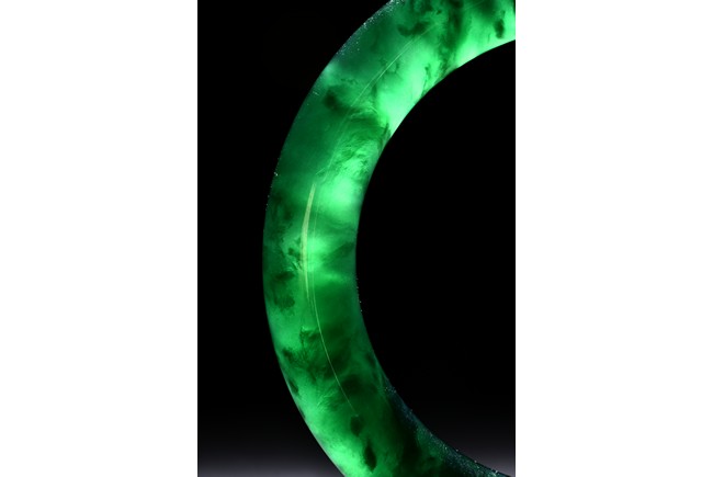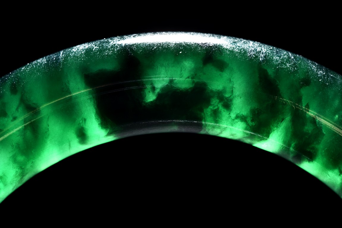Of good translucency, the bangle is of mottled green and dark spinach green tone.