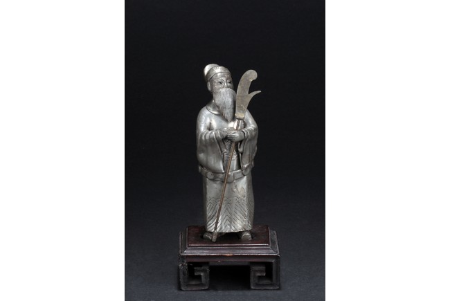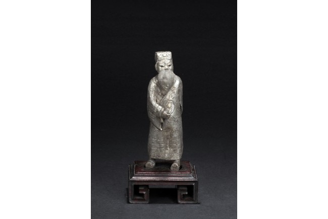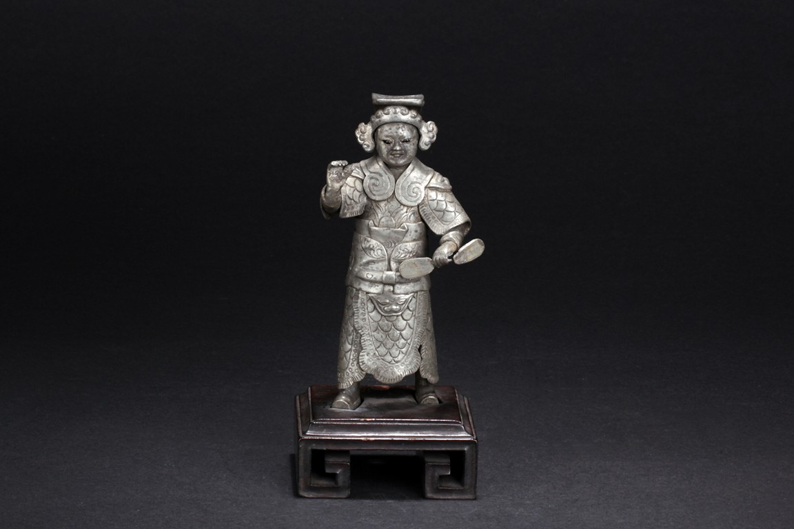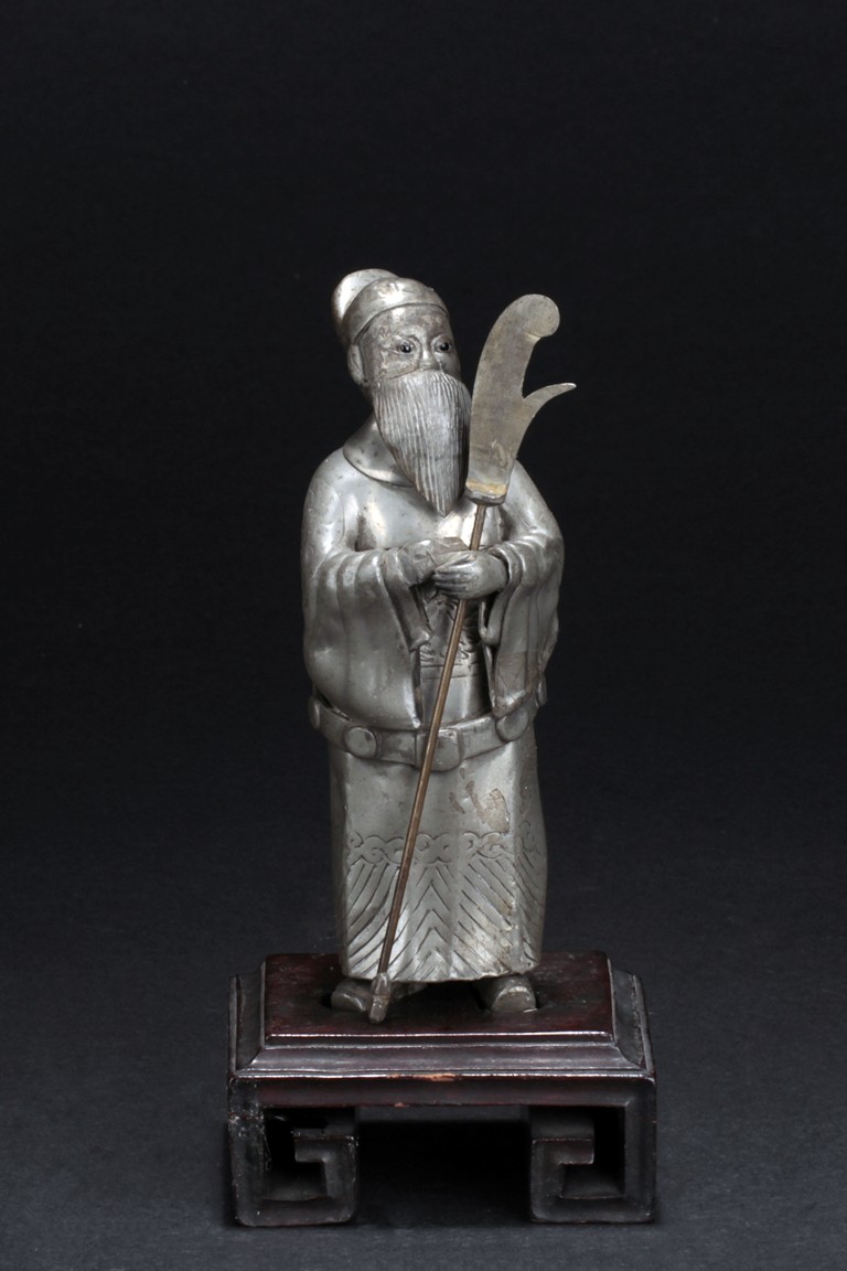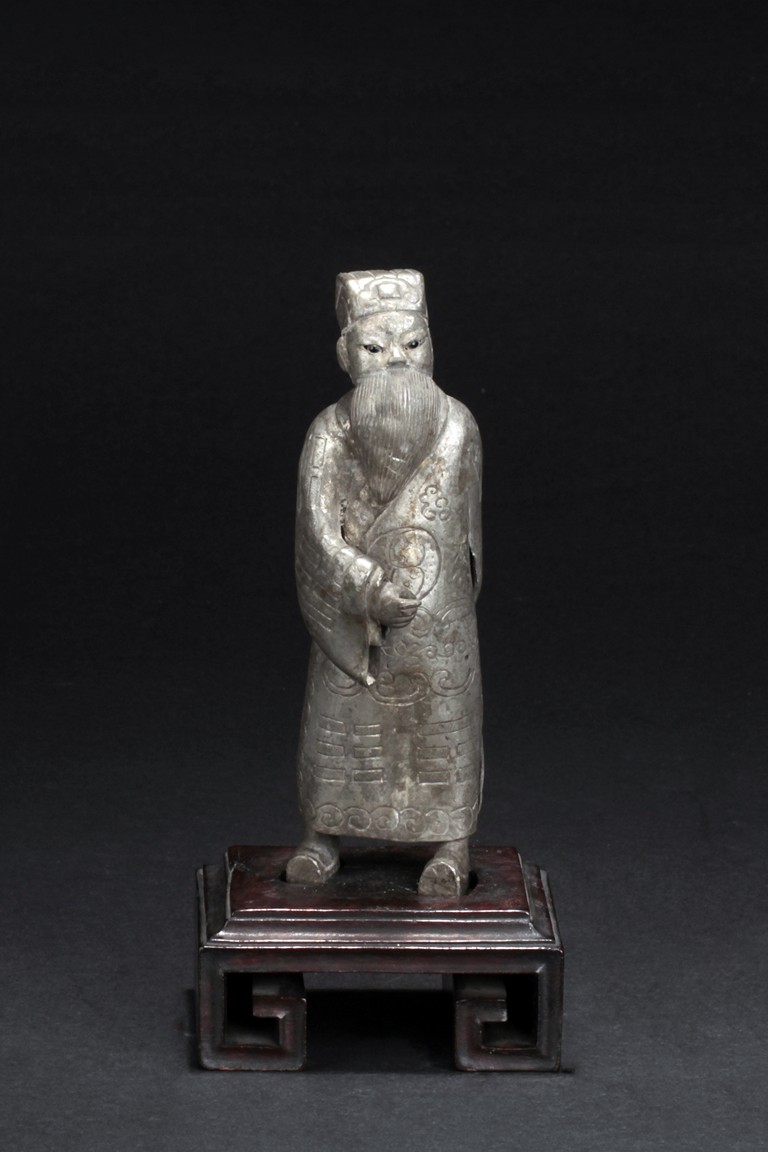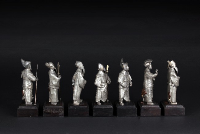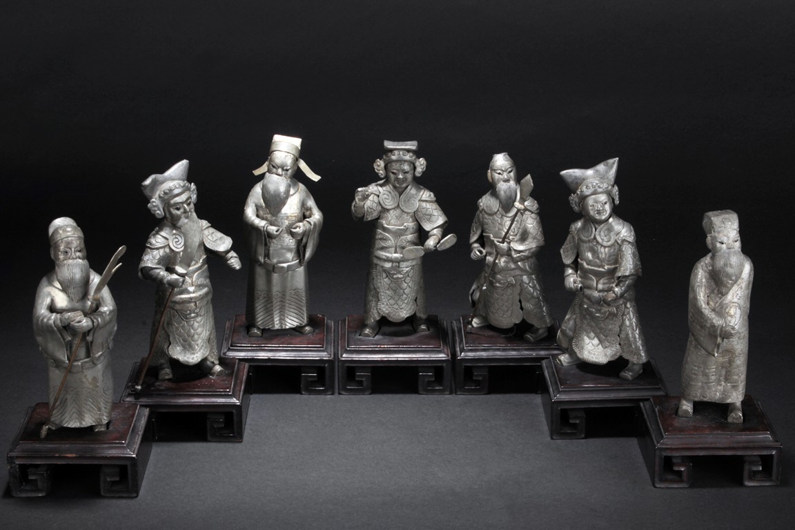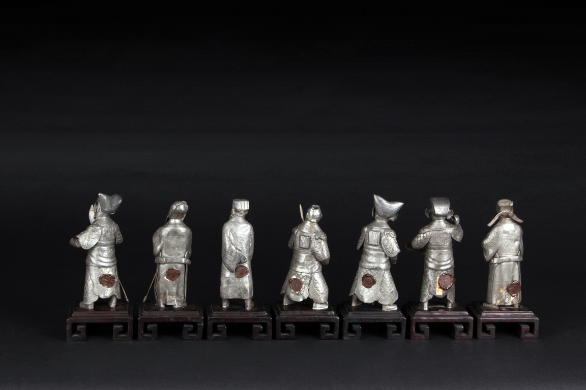 Comprising of seven pewter figures, including four military figures fully armored, each holding a long spear, and three elderly civil officials with long beard, each wearing voluminous robe and hat, all supported on square sectioned hardwood stands with scrolled feet. Qing Dynasty period.