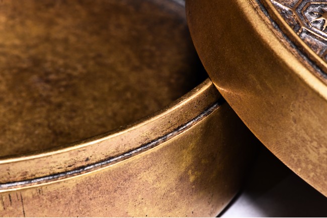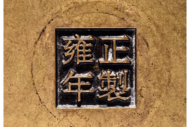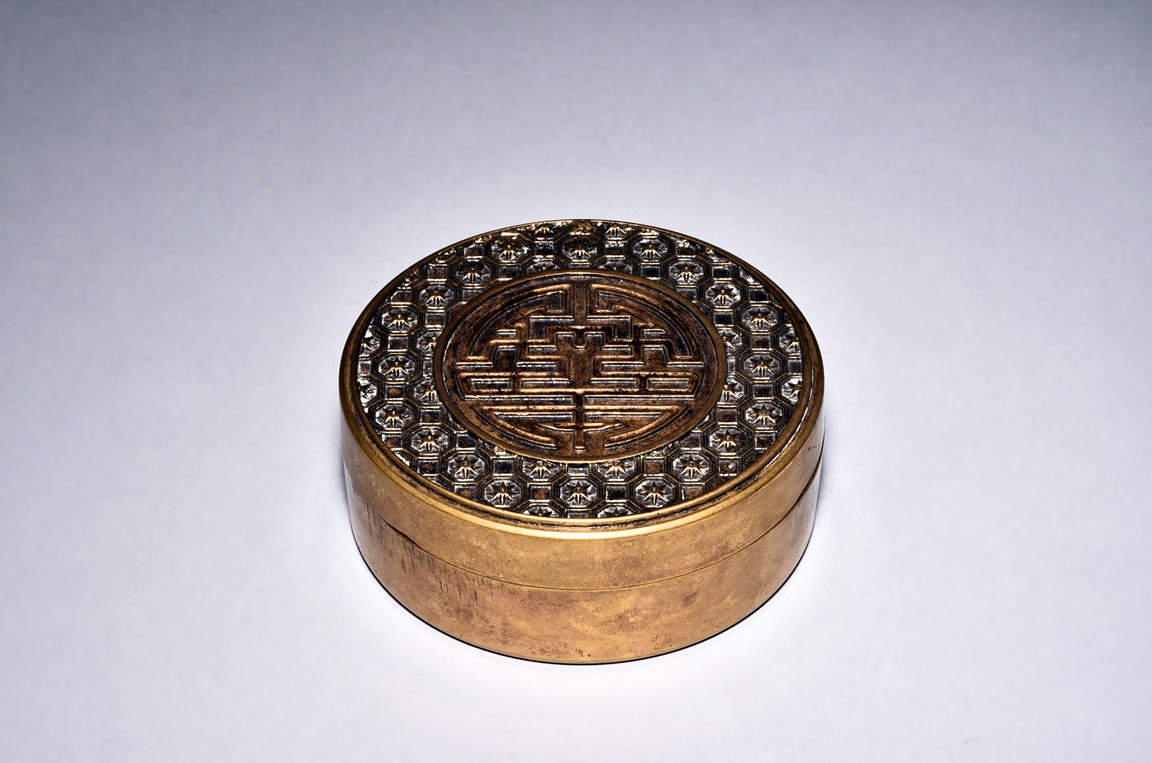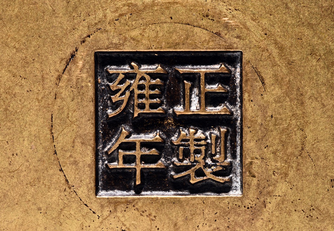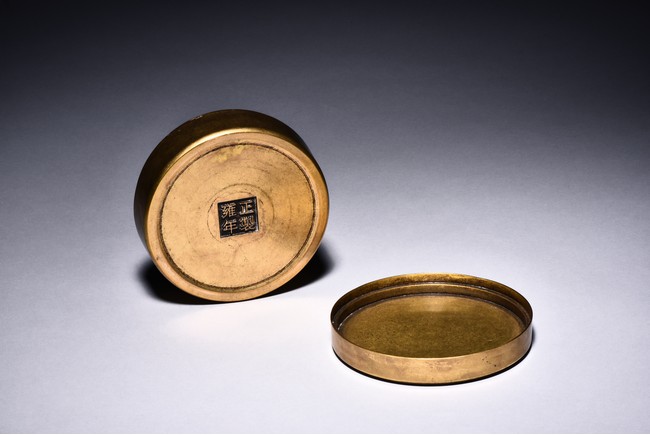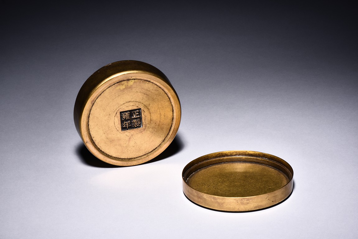 Of circular section and richly gilt, the cover is cast with a round stylized 'character' to the center encircled by a ring of geometric pattern, the bottom cast with four character 'YONGZHENG' mark. Qing Dynasty period.