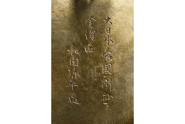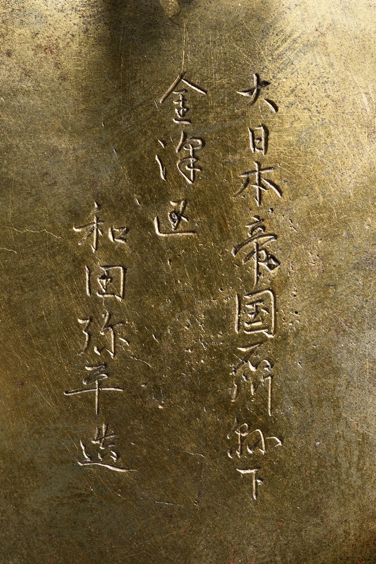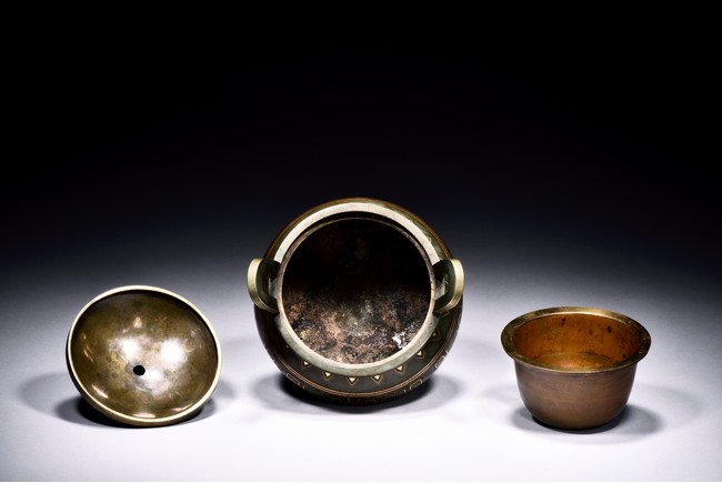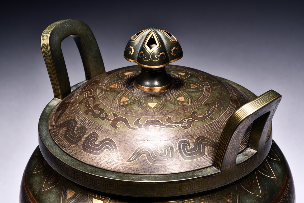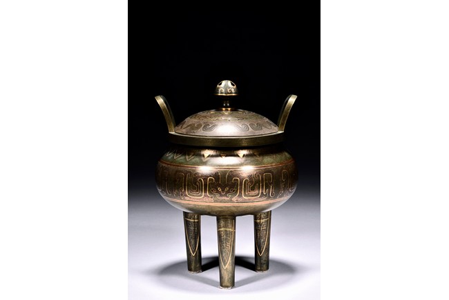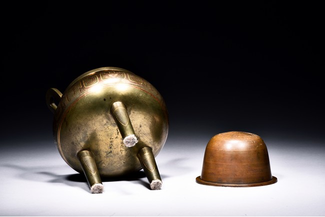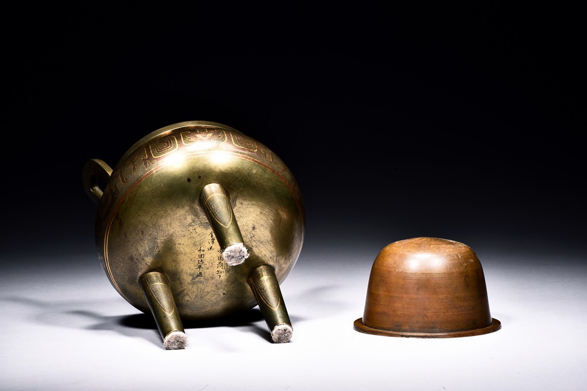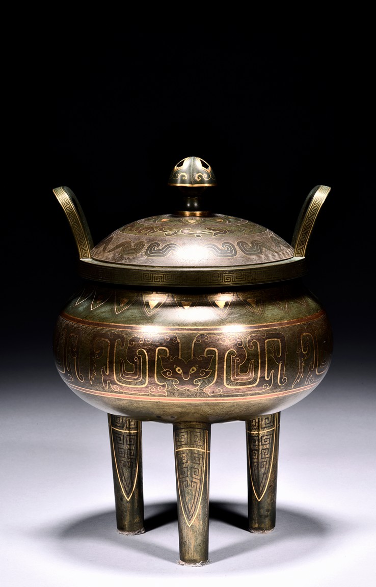 Of compressed globular body and supported on three columnar legs decorated with blades, the body is finely inlaid with a band of stylized mythical beasts against key-fret pattern, all enclosed within a double-line border, with a band of blades below the rim supporting a pair of arched handles, the cover decorated with a series of stylized patterns within key-fret borders. The bottom etched with inscriptions. 19th Century.