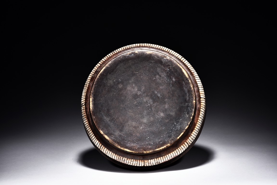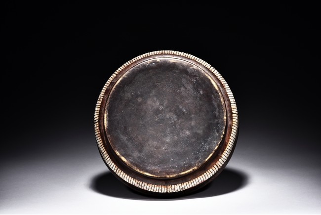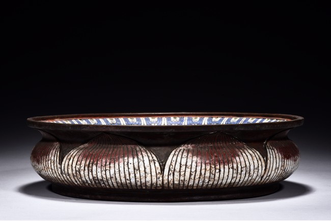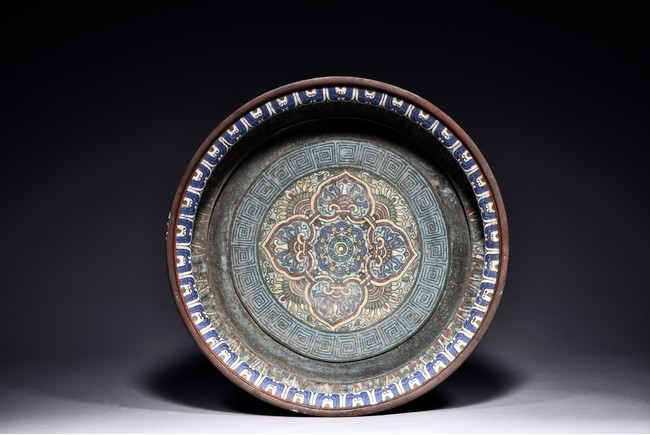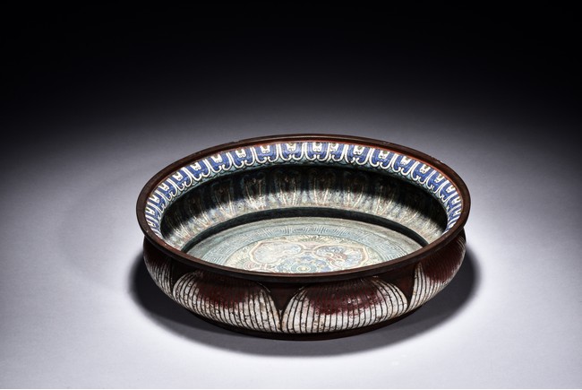 The interior is decorated with geometric pattern of four ruyi-shaped motif enclosing lotus further encircled by a band of key-fret border. The everted rim is decorated with a band of lotus petal. The exterior body is further enamelled with a band of peach decoration detailed with incised lines. Ming Dynasty period.