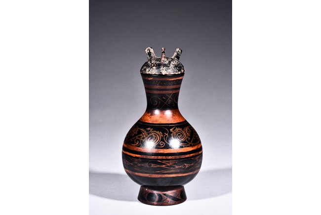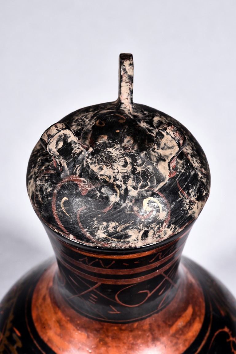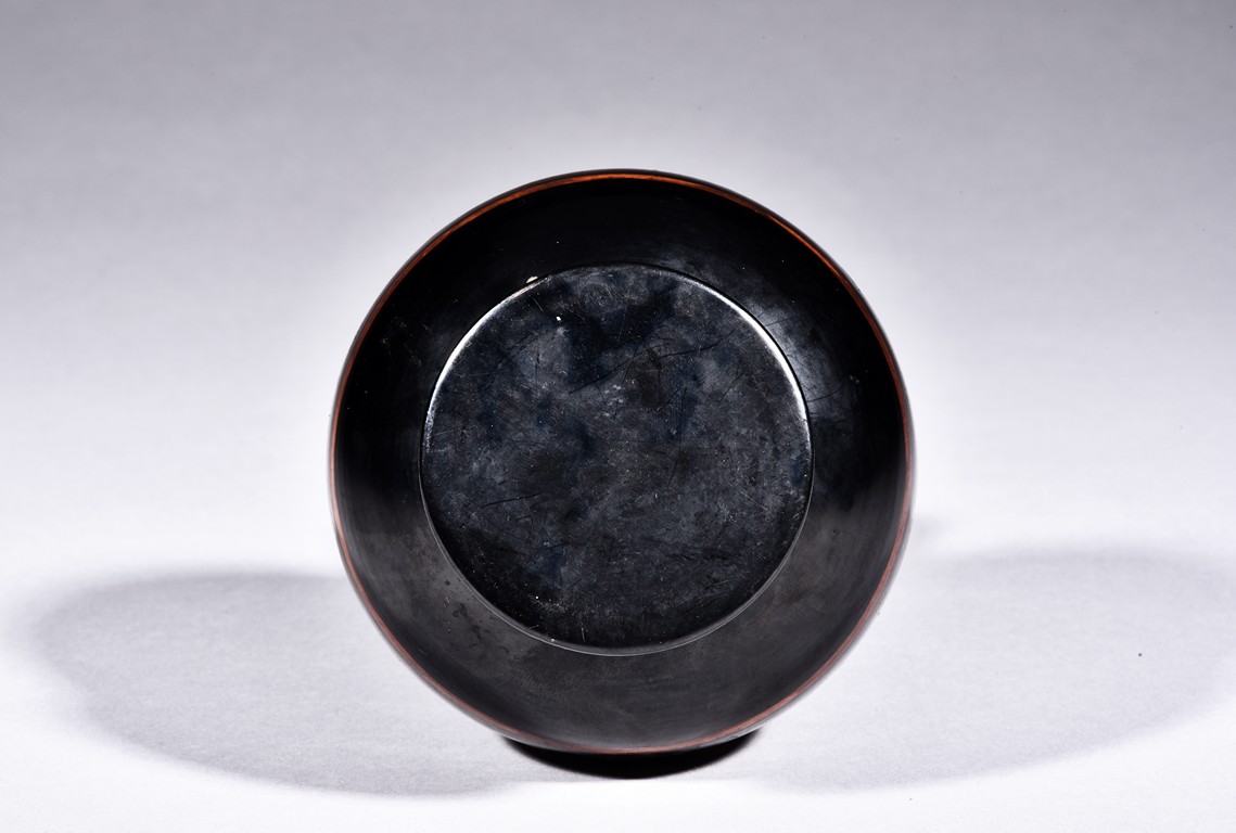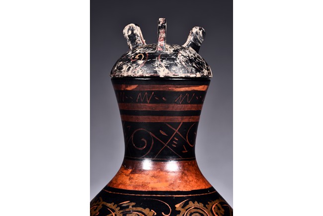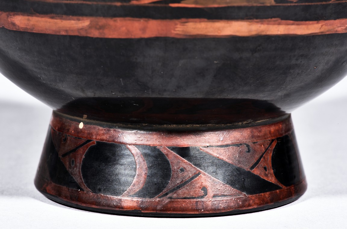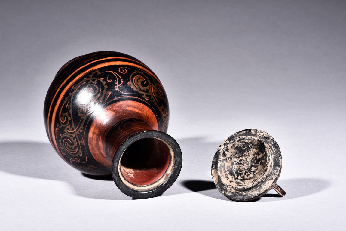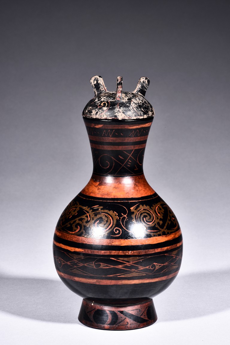 Raised on spreading foot and rise to a bulbous body, it is overall painted with bands of cloud scroll and geometric pattern separated by solids bands in reddish-orange pigments against black lacquer ground. Han Dynasty or later.