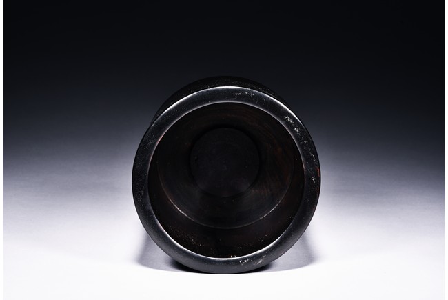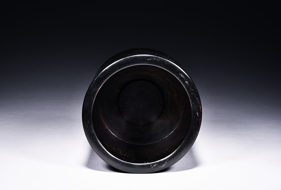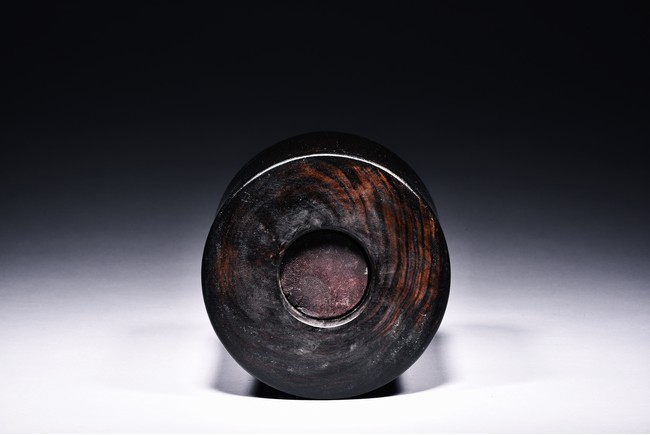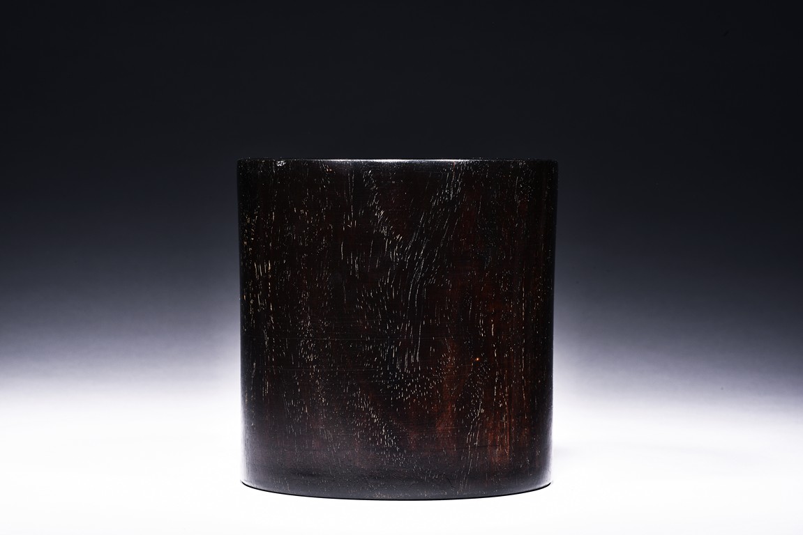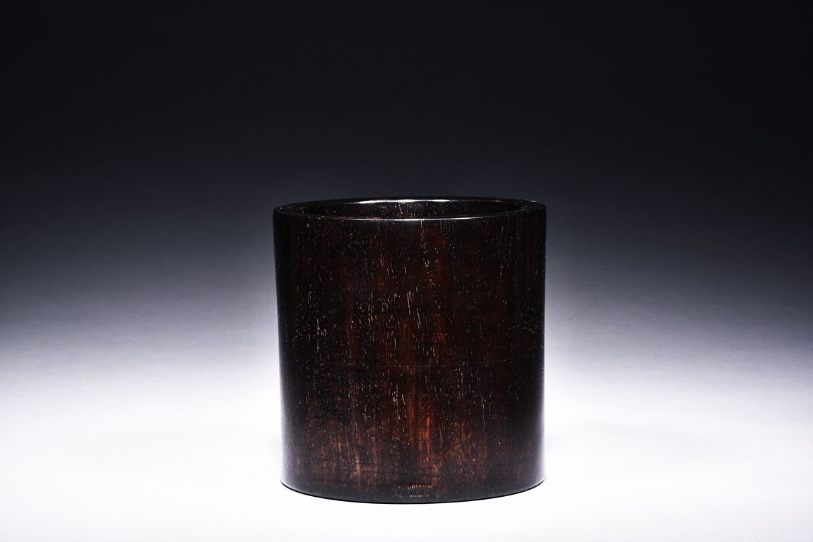 Of cylindrical form with a plug to the base, the dark reddish-brown brush pot is left undecorated to highlight the natural wood grain and golden flecks in the wood.