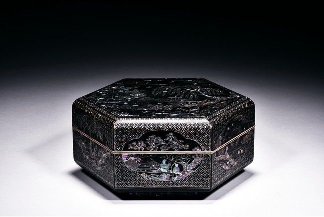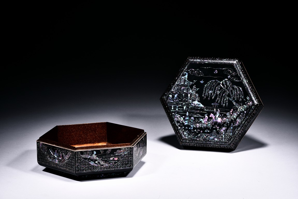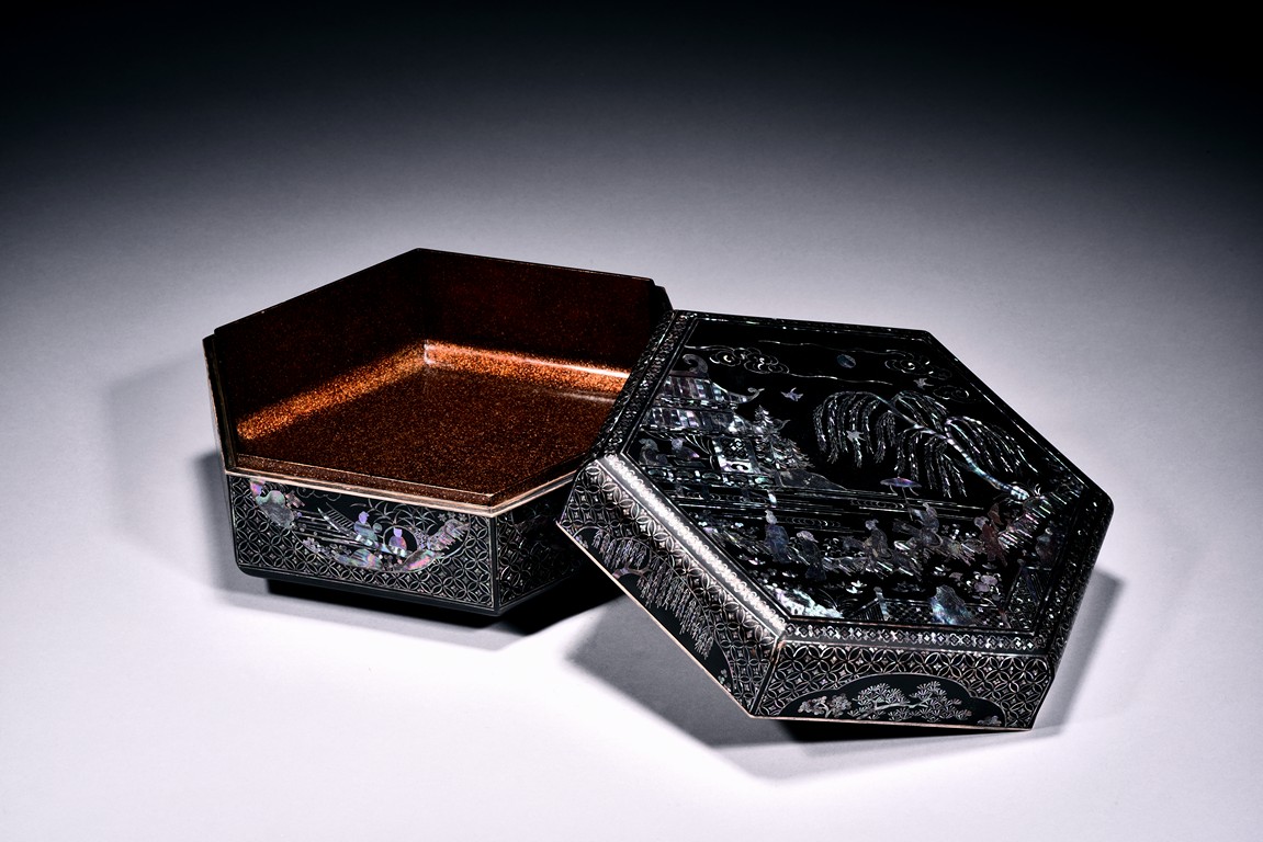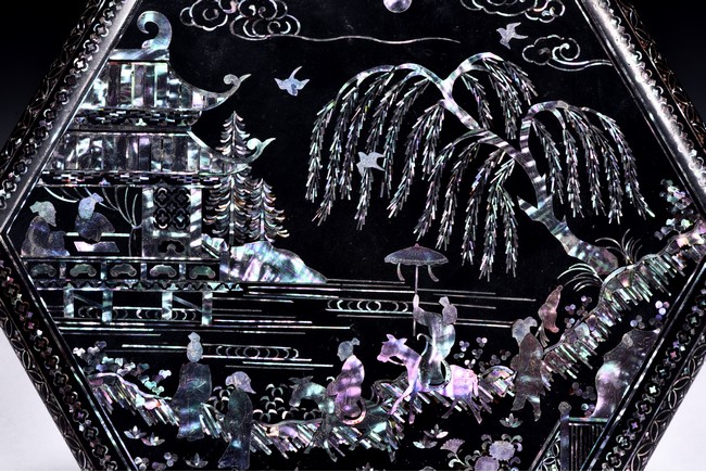 Of hexagonal form, each side decorated with figures and landscape within a quarter lobed medallion reserved against repeated diaper ground, the top panel further decorated with riverside scene. The bottom bears a small two character mark.