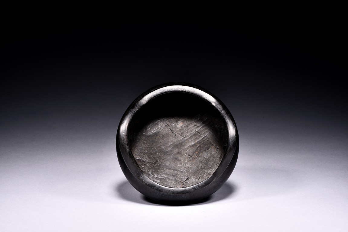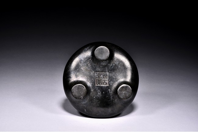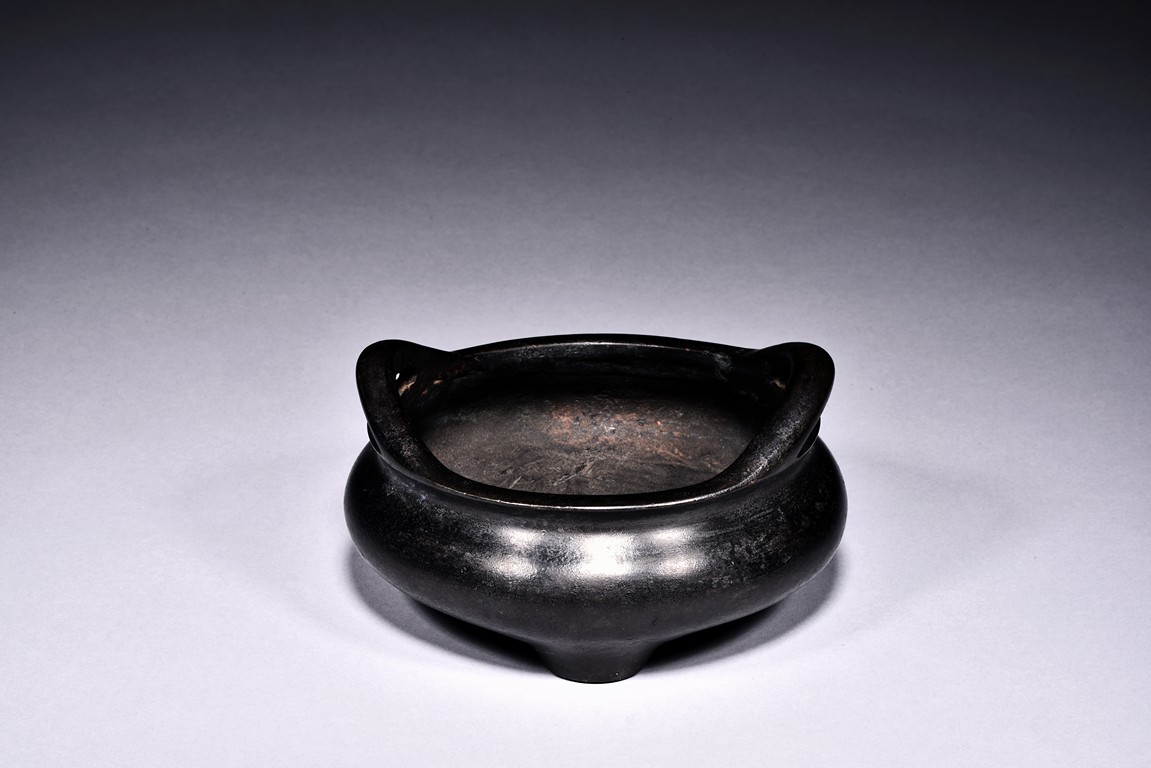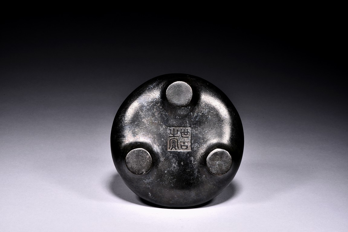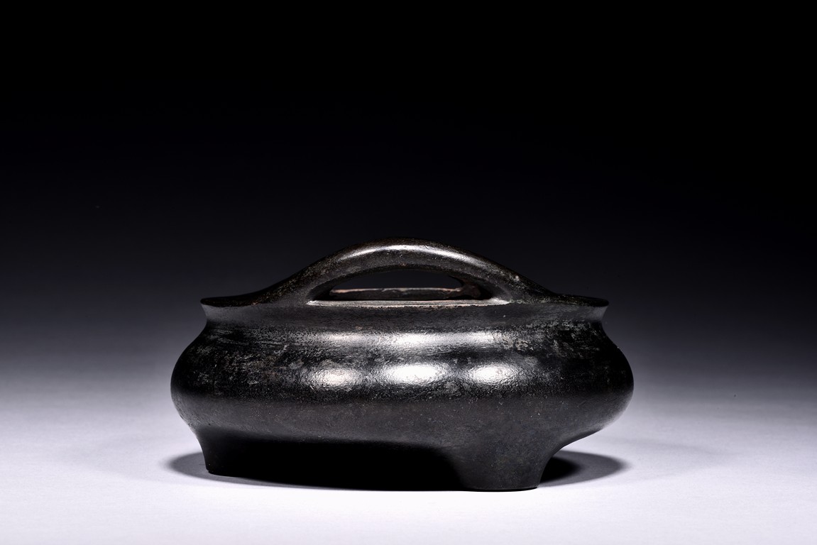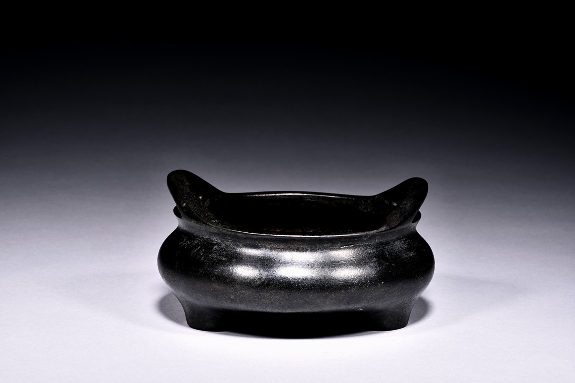 Of compressed globular form, the censer is cast with looped handles rising at an angle from the rim, raised on three short legs, the base of the censer bearing three character 'SHI GU ZHI BAO' mark in seal script, the surface with brownish black patina. Qing Dynasty period.