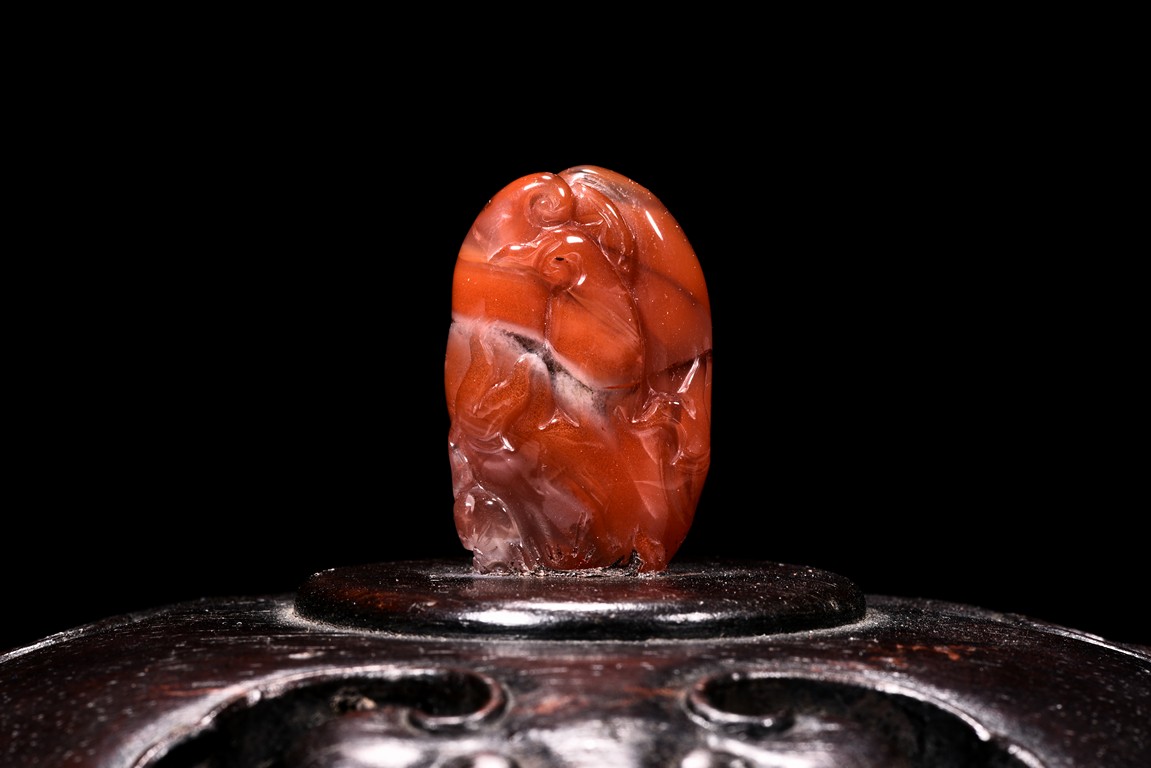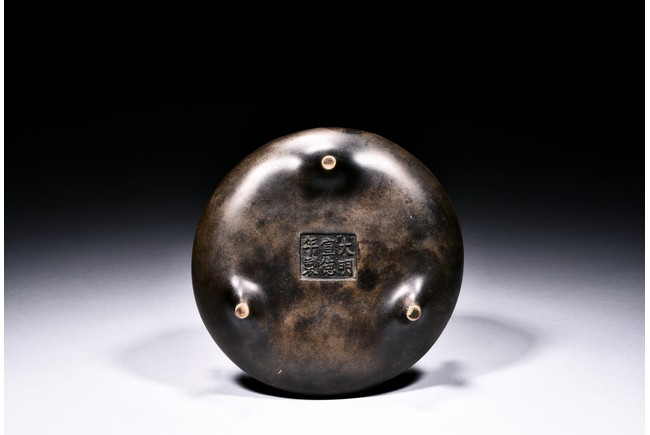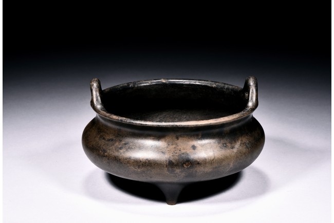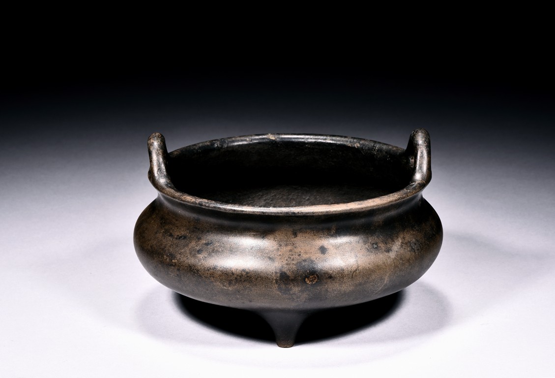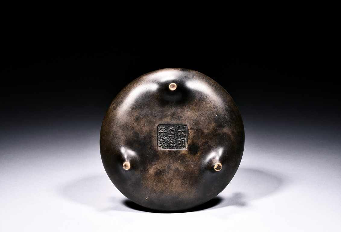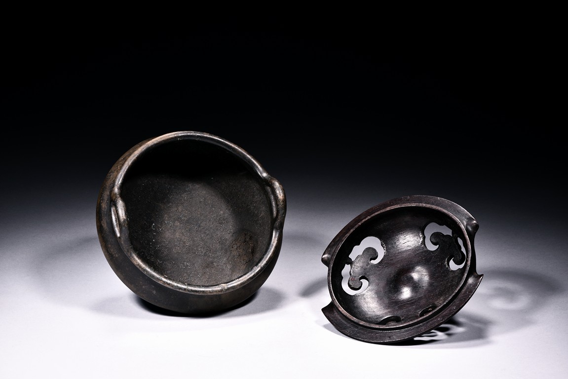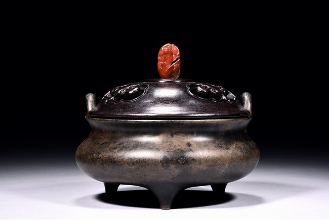 Of compressed globular form, the censer is supported on three short feet with two strap handles, the base cast with a six character apocryphal 'XUANDE' mark, fitted with a reticulated cover and surmounted with a oblong red agate finial. Qing Dynasty period.