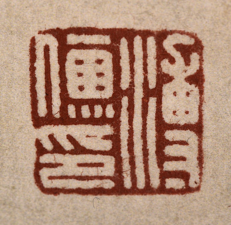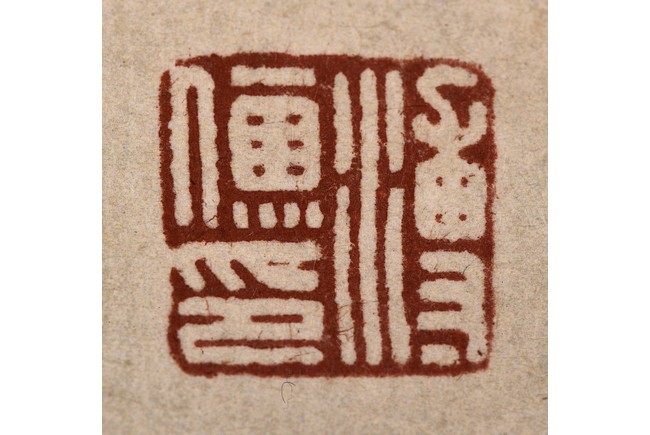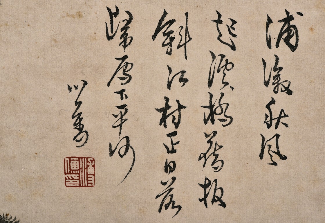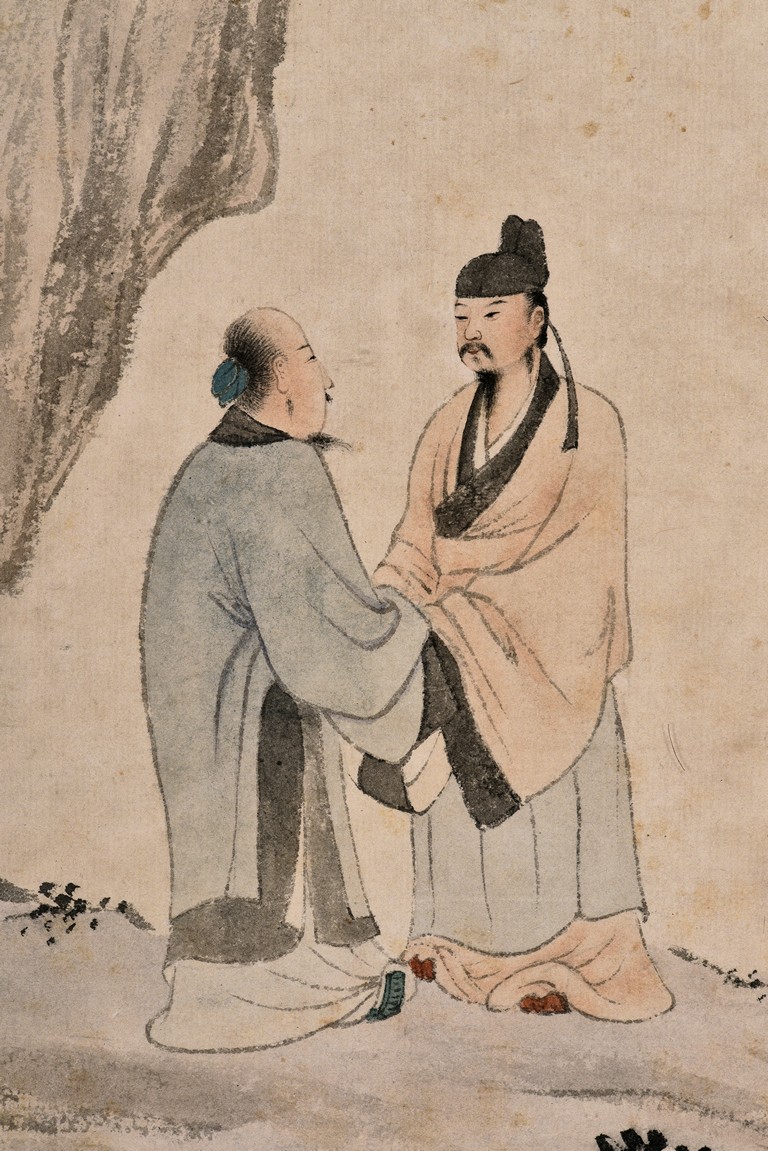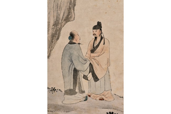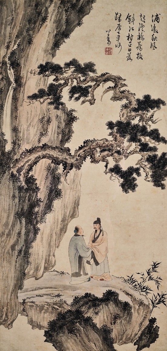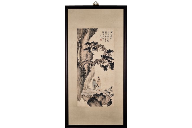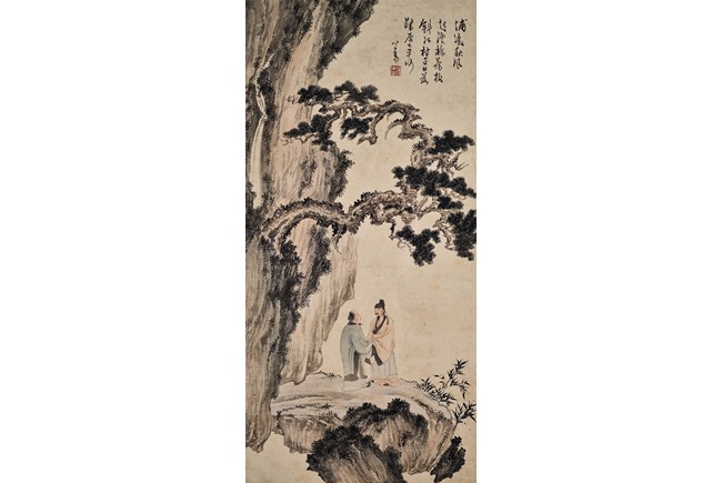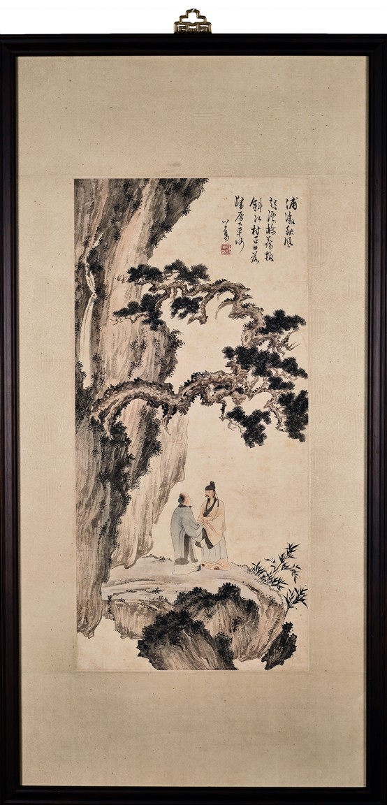 Mounted and framed. Ink and color on paper. Scholars under pine tree. Inscribed and signed by the artist. With one seal mark of the artist.