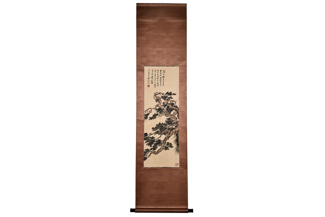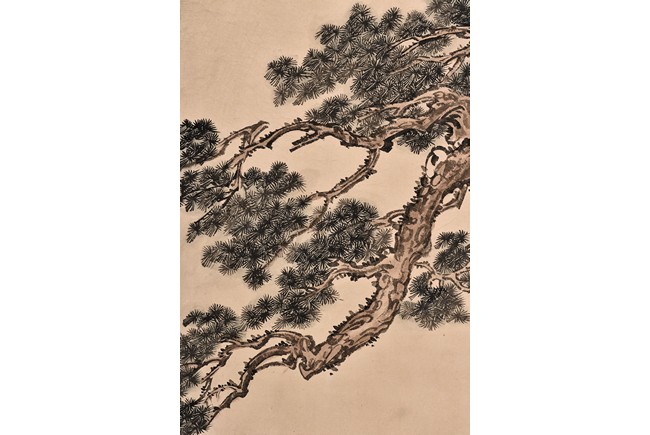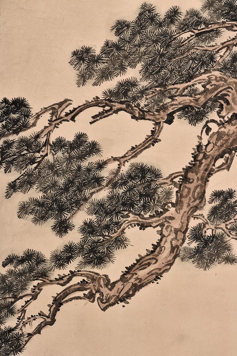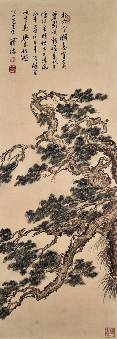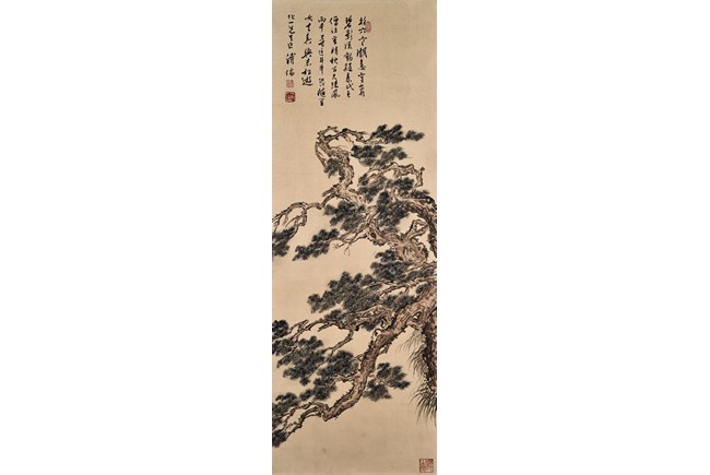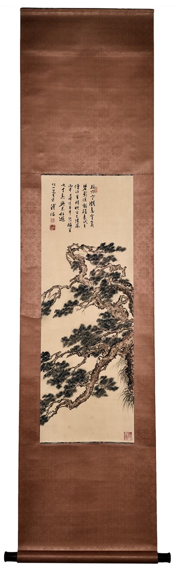 Hanging scroll. Ink and color on paper. Pine tree. Inscribed and signed by the artist. With four seal marks of the artist.