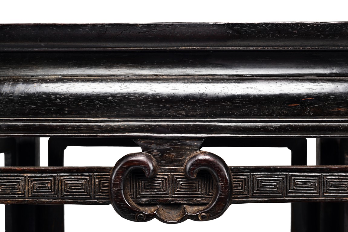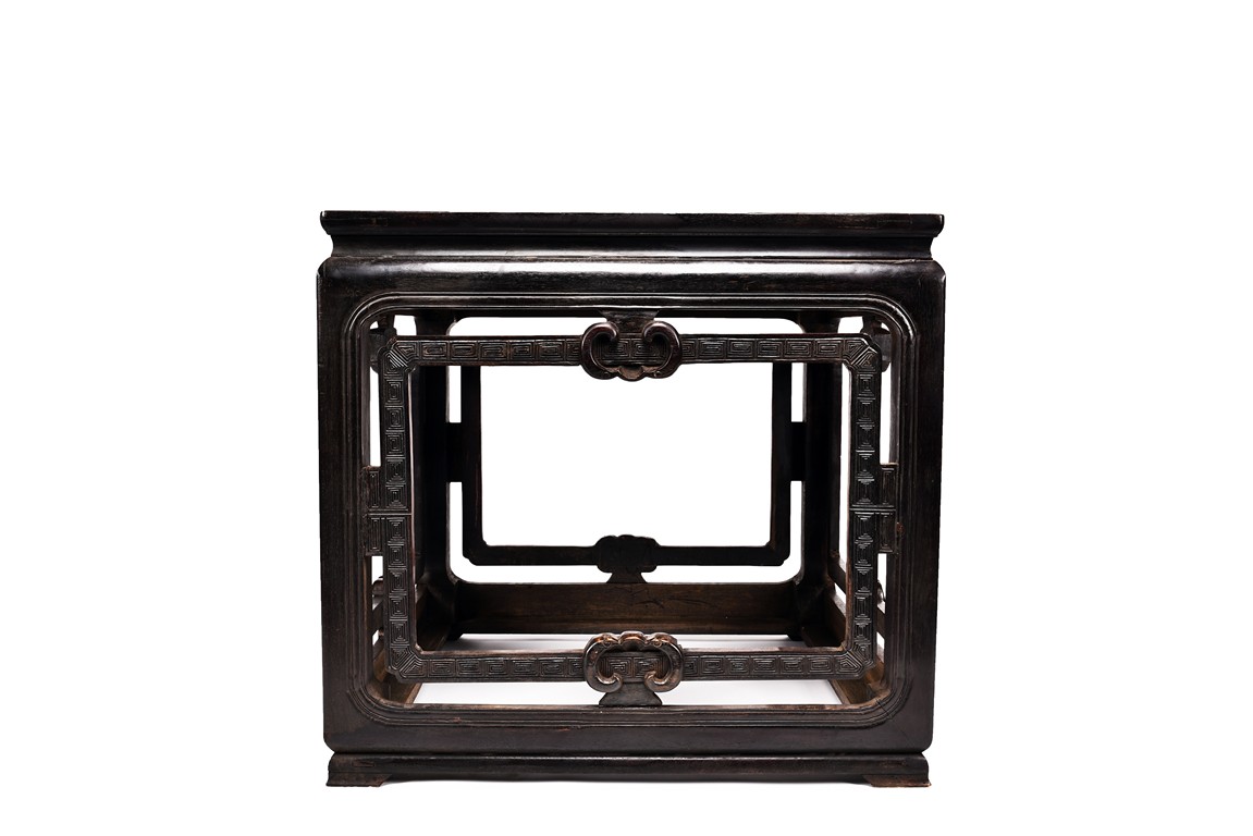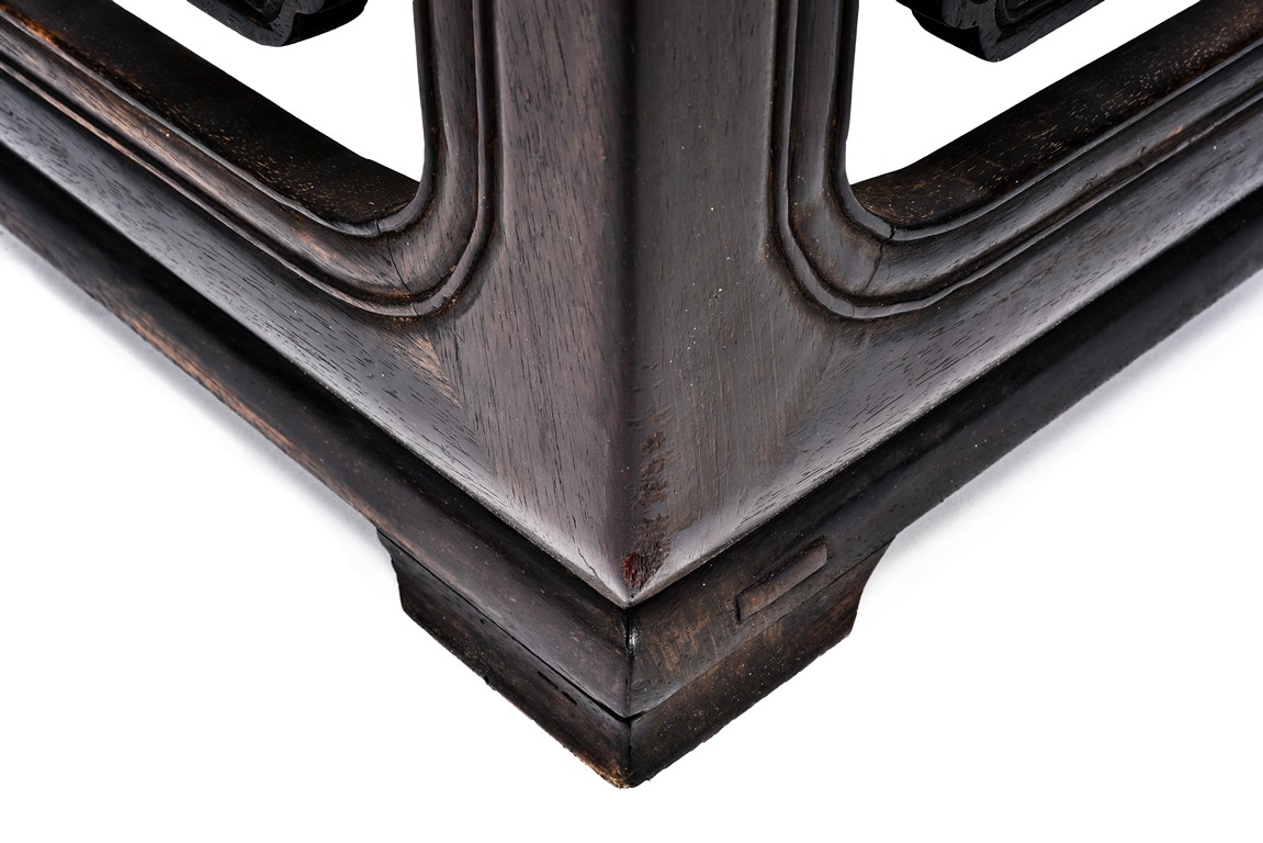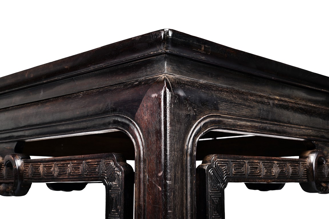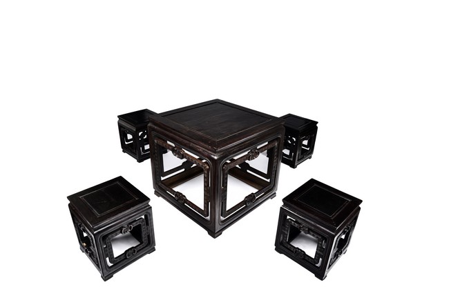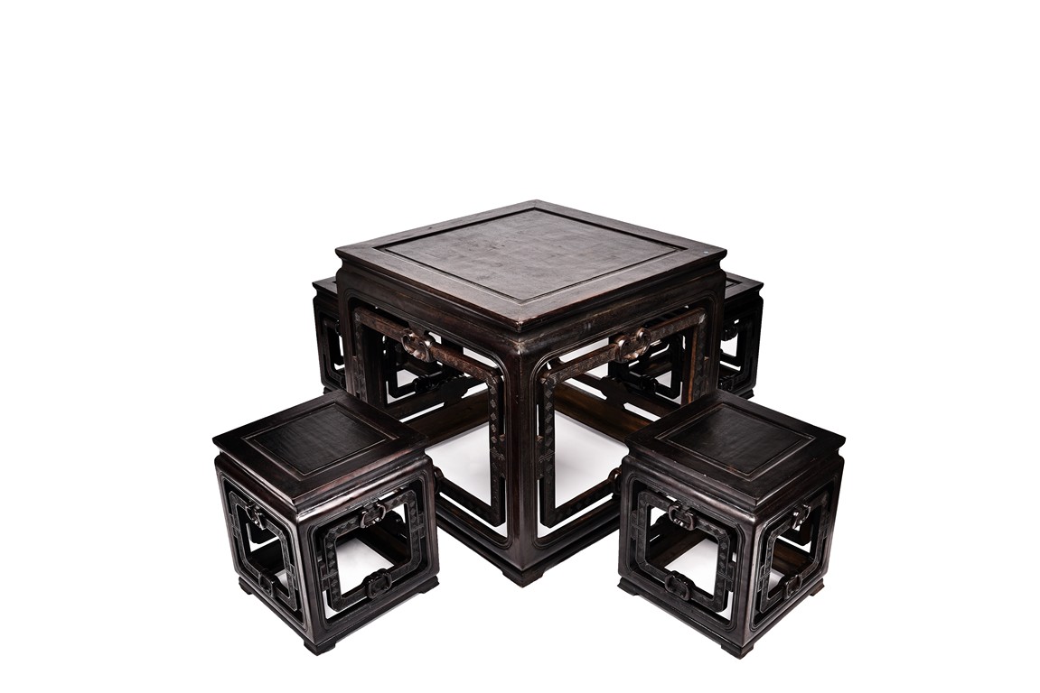Possibly zitan, the table is set with a plain square panelled top and narrow waist, above openwork aprons carved with a bat tied by key-fret band to the sides and continued along the feet and base as spandrels, the legs all joined by a base stretcher. Each chair is of similar design as the square table. Late Qing Dynasty period.