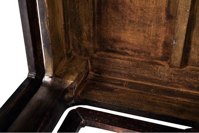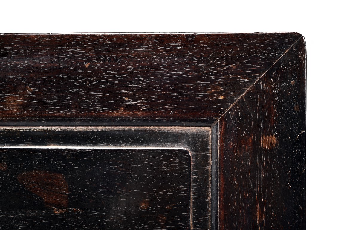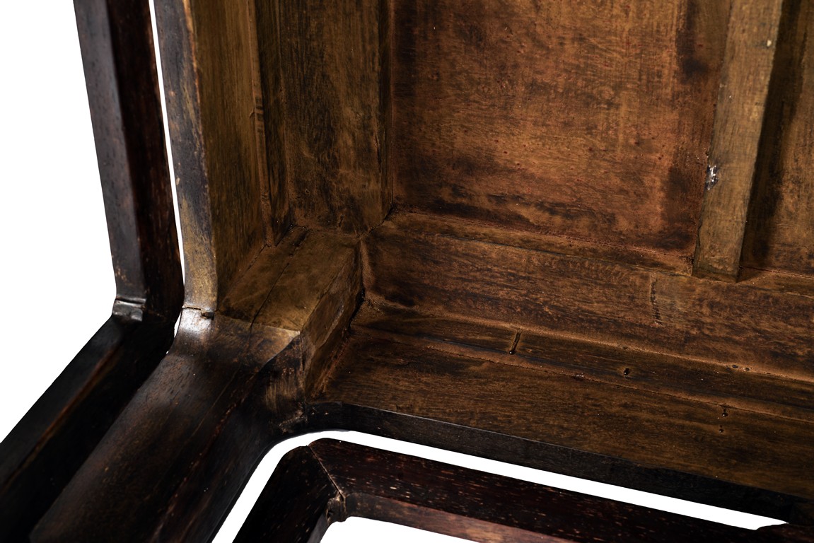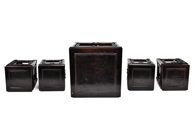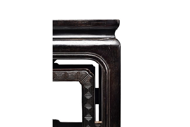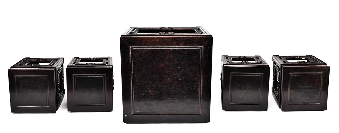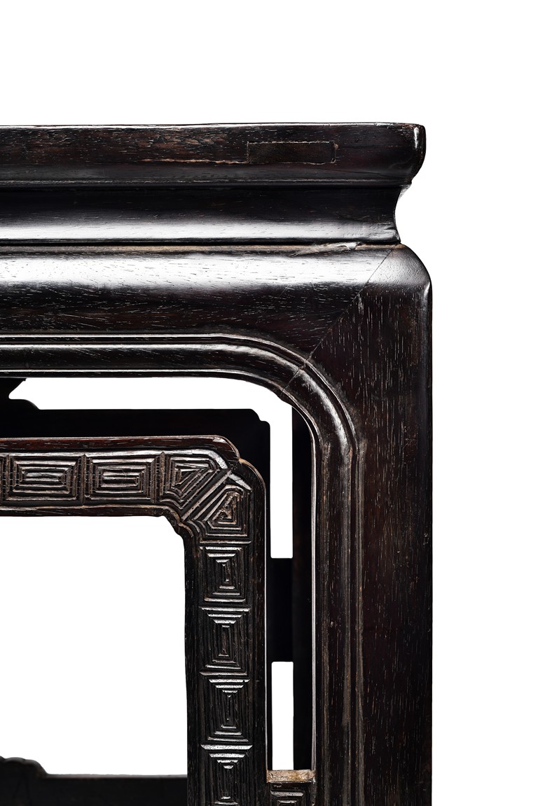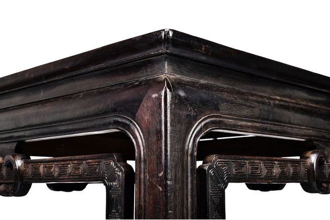 Possibly zitan, the table is set with a plain square panelled top and narrow waist, above openwork aprons carved with a bat tied by key-fret band to the sides and continued along the feet and base as spandrels, the legs all joined by a base stretcher. Each chair is of similar design as the square table. Late Qing Dynasty period.